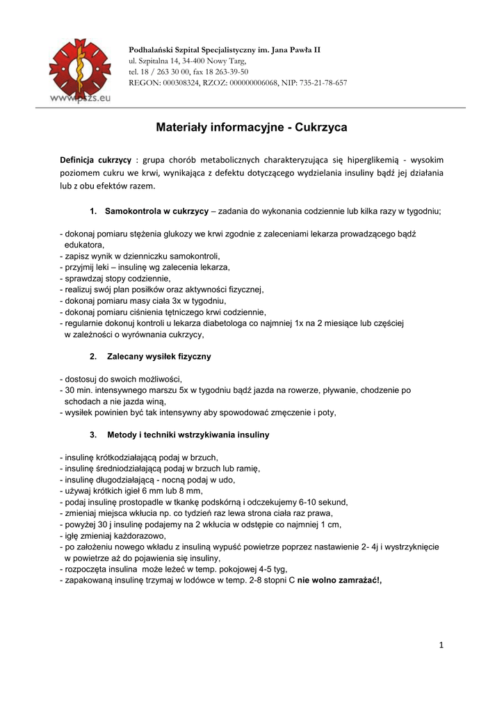Podhalański Szpital Specjalistyczny im. Jana Pawła II ul. Szpitalna 14, 34-400 Nowy Targ, tel. 18 / 263 30 00, fax 18 263-39-50 REGON: 000308324, RZOZ: 000000006068, NIP: 735-21-78-657 Materiały informacyjne - Cukrzyca Definicja cukrzycy : grupa chorób metabolicznych charakteryzująca się hiperglikemią - wysokim poziomem cukru we krwi, wynikająca z defektu dotyczącego wydzielania insuliny bądź jej działania lub z obu efektów razem. 1. Samokontrola w cukrzycy – zadania do wykonania codziennie lub kilka razy w tygodniu; - dokonaj pomiaru stężenia glukozy we krwi zgodnie z zaleceniami lekarza prowadzącego bądź edukatora, - zapisz wynik w dzienniczku samokontroli, - przyjmij leki – insulinę wg zalecenia lekarza, - sprawdzaj stopy codziennie, - realizuj swój plan posiłków oraz aktywności fizycznej, - dokonaj pomiaru masy ciała 3x w tygodniu, - dokonaj pomiaru ciśnienia tętniczego krwi codziennie, - regularnie dokonuj kontroli u lekarza diabetologa co najmniej 1x na 2 miesiące lub częściej w zależności o wyrównania cukrzycy, 2. Zalecany wysiłek fizyczny - dostosuj do swoich możliwości, - 30 min. intensywnego marszu 5x w tygodniu bądź jazda na rowerze, pływanie, chodzenie po schodach a nie jazda winą, - wysiłek powinien być tak intensywny aby spowodować zmęczenie i poty, 3. Metody i techniki wstrzykiwania insuliny - insulinę krótkodziałającą podaj w brzuch, - insulinę średniodziałającą podaj w brzuch lub ramię, - insulinę długodziałającą - nocną podaj w udo, - używaj krótkich igieł 6 mm lub 8 mm, - podaj insulinę prostopadle w tkankę podskórną i odczekujemy 6-10 sekund, - zmieniaj miejsca wkłucia np. co tydzień raz lewa strona ciała raz prawa, - powyżej 30 j insulinę podajemy na 2 wkłucia w odstępie co najmniej 1 cm, - igłę zmieniaj każdorazowo, - po założeniu nowego wkładu z insuliną wypuść powietrze poprzez nastawienie 2- 4j i wystrzyknięcie w powietrze aż do pojawienia się insuliny, - rozpoczęta insulina może leżeć w temp. pokojowej 4-5 tyg, - zapakowaną insulinę trzymaj w lodówce w temp. 2-8 stopni C nie wolno zamrażać!, 1 4. Powikłania w cukrzycy - hipoglikemia – niski poziom cukru we krwi – niedocukrzenie poniżej 60 mg%, - hiperglikemia wysoki poziom cukru we krwi przekraczający 2 godziny po posiłku 140 mg%, - retinopatia powikłania oczne, - nefropatia – uszkodzenie nerek, - neuropatia – uszkodzenie nerwów obwodowych, - zespół stopy cukrzycowej – infekcja , owrzodzenie i/lub zniszczenie głębokich tkanek stopy, połączone z neuropatią i/lub uszkodzeniem tętnic stopy u osoby z cukrzycą, 5. Obsługa gleukometru - zapoznaj się z instrukcją obsługi, - ustaw datę i godzinę, - używaj tego samego gleukometru, - dokonaj pomiaru zaczynając od umycia rąk ciepłą wodą w celu pobudzenia krążenia, - nie odkażaj przed nakłuciem (może zakłócić wynik), - nakłuwaj boczną część palca unikaj palca wskazującego, - wyjęty pasek umieść w odpowiednim miejscu glukometru zgodnie ze strzałką wskazującą, - odczekaj aż pojawi się migająca kropla na ekranie gleukometru, - nanieś kroplę krwi, - po pojawieniu się wyniku zapisz w dzienniku samokontroli, - paski są jednorazowe, - nakłuwacz jest tylko do twojego użytku, - przestrzegaj daty ważności pasków, - przechowuj glukometr zachowując jego czystość w temp. Pokojowej, 6. Zasady dietetyczne w cukrzycy - produkty białkowe stanowią 10-15% dziennego zapotrzebowania, - produkty tłuszczowe stanowią 30-35% dziennego zapotrzebowania, - produkty węglowodanowe stanowią 50% dziennego zapotrzebowania, - zapoznaj się z WW – to jest 10 gram węglowodanu przyswajalnego, - stosując insulinę ludzką przestrzegaj 6 posiłków dziennie insulinę podajemy na 30-40 min przed posiłkiem, - stosując insulinę analogową posiłek spożywaj tuż przed podaniem insuliny bądź w trakcie lub tuż po posiłku, - nie spożywaj węglowodanów prostych ( cukru, sków owocowych, słodyczy, ciastek słodkich owoców; bananów, winogron porzeczek, śliwek, ananasów brzoskwiń z puszki), - nie słódź napojów cukrem, - nie pij napojów kolorowych, - pij wodę mineralną niegazowaną, herbatę, kawę bez cukru, - napoje mleczne pij w ograniczonej ilości nie przekraczaj 200ml na jeden posiłek maksymalnie 2x dziennie, - zamieniaj mięso wieprzowe na drobiowe, - stosuj produkty bogate w błonnik pokarmowy( kasze, ryż brązowy niedogotowane makaron z pełnej mąki), - codziennie jedz warzywa i owoce, - nie przejadaj się, - jedz pełnoziarnisty lub razowy chleb, - ogranicz spożywanie tłuszczów i alkoholu, - dbaj różnorodność spożywanych posiłków, - w przypadku nadwagi lub otyłości redukuj masę ciała, 2
