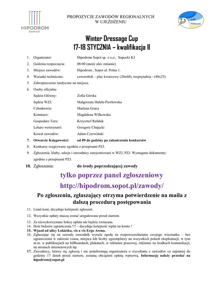 PROPOZYCJE ZAWODÓW REGIONALNYCH W UJEŻDŻENIU Winter Dressage Cup 17-18 STYCZNIA – kwalifikacja II 1. Organizator: Hipodrom Sopot sp. z o.o., Sopocki KJ 2. Godzina rozpoczęcia: 08:00 (może ulec zmianie) 3. Miejsce zawodów: Hipodrom , Sopot ul. Polna 1. 4. Warunki techniczne: czworobok – plac kwarcowy (20x60), rozprężalnia - (48x25) 5. Zabezpieczenie medyczne na miejscu. 6. Osoby oficjalne Sędzia Główny: Zofia Górska Sędzia WZJ: Małgorzata Hałeła-Pawłowska Członkowie: Marlena Gruca Komisarz: Magdalena Wilkowska Gospodarz Toru: Krzysztof Rafalak Lekarz weterynarii: Grzegorz Chajęcki Kowal zawodów: Adam Czerwiński 7. Otwarcie Księgowości: od 09 do godziny po zakończeniu konkursów 8. Konkursy rozgrywane zgodnie z przepisami PZJ. 9. Zgłoszenia: kluby, sekcje i zawodnicy zarejestrowani w WZJ, PZJ. Wymagane dokumenty: zgodnie z przepisami PZJ. 10. Zgłoszenia: do środy poprzedzającej zawody tylko poprzez panel zgłoszeniowy http://hipodrom.sopot.pl/zawody/ Po zgłoszeniu, zgłaszający otrzyma potwierdzenie na maila z dalszą procedurą postępowania 11. Limit koni, decyduje kolejność zgłoszeń. 12. Wszystkie opłaty muszą zostać uregulowane przed startem. 13. 14. 15. 16. Za niewykorzystane boksy opłata nie będzie zwracana. Ilość boksów ograniczona !!! – decyduje kolejność wpłat na konto ! Wjazd od ulicy Łokietka, vis a vis Ergo Arena. Zgłaszając się na zawody zawodnik wyraża zgodę na rozpowszechnianie swojego wizerunku – bez ograniczenia w zakresie czasu, miejsca lub liczby egzemplarzy na wszystkich polach eksploatacji, w tym m.in. w publikacjach na billboardach, plakatach, w reklamie prasowej, reklamie na środkach komunikacji, na stronach internetowych itp. 17. Zawodnicy, którzy się zgłoszą i nie poinformują organizatora o wycofaniu z zawodów co najmniej do godziny 17 dzień przed startem, zostaną obciążeni opłatą wpisową. Informację należy przesłać na [email protected] 18. Opłaty należy dokonywać zgodnie z otrzymanym automatycznym potwierdzeniem zgłoszenia Wpisowe/Startowe na konto Sopockiego KJ (nr konta przyjdzie mailem po zgłoszeniu) Opłata za boksy/prąd na konto Hipodromu (nr konta przyjdzie mailem po zgłoszeniu) Wpisowe: Startowe: Trociny: Prąd do koniowozu: Namiot: Zmiany na listach: 100 zł za dzień, 150 zł za dwa dni – tylko przy wpłacie z góry zgodnie z klasą konkursu Boksy: nowe stajnie 250zł, stare stajnie 200zł 50 zł za paczkę 60 zł/dzień. Płatne z góry przelewem. 30zł / zawody 20pln od konia. 19. Organizator zastrzega sobie prawo do zmian w programie zawodów oraz ich odwołania. 20. Za ewentualne kradzieże, wypadki, szkody i zdarzenia losowe powstałe w trakcie trwania zawodów lub podczas transportu organizator nie ponosi odpowiedzialności. 21. Konkursy zostaną rozegrane przy minimum 3 zgłoszonych koniach PROGRAM ZAWODÓW SOBOTA: Nr Klasa NIEDZIELA: Startowe Nr Klasa Startowe Kwalifikacje do Winter Dressage Cup dla: * 1. 20 zł L–2 (towarzyski) 14. L–3 (towarzyski) 20 zł 2. L–2 20 zł 15. L–3 20 zł 2a 20 zł L–3 (towarzyski) L–2 (towarzyski) 20 zł AMATORÓW 3. P–1 30 zł 16. P–4 30 zł JUN. MŁODSZY, KUCE 4. P–2 30 zł 17. P–3 30 zł JUN. MŁODSZY, KUCE 5. P10R 30 zł 18. P–7 30 zł 6. N–6 40 zł 19. N–7 40 zł 7. N–8 40 zł 20. N–9 40 zł 8. C–4 50 zł 21. C–5 50 zł 9. CC – 1 50 zł 22. CC – 2 50 zł 10. N – 1 (k) 40 zł 23. N – 2 (k) 40 zł 11. CS – 1 60 zł 24. CS – 2 60 zł 12. CC – 4 60 zł 25. CC – 7 60 zł 13. CC – 1 60 zł 26. CC – 3 60 zł 15a AMATORÓW JUNIORÓW SENIORÓW Nagrody: 100% ze startowego dla 25% startujących w konkursie. Dekoracje w niedzielę, tylko za rundy W przypadku zbyt małej liczby zgłoszeń organizator zastrzega prawo do odwołania zawodów, w przypadku zbyt dużej liczby zgłoszeń starty limitowane zostaną do 1 dziennie. KODEKS POSTĘPOWANIA Z KONIEM Polski Związek Jeździecki oczekuje od wszystkich osób zaangażowanych w sport jeździecki respektowania wydanego przez PZJ Kodeksu Postępowania z Końmi, jak również przestrzegania zasady, że dobro koni jest najważniejsze. Dobro koni musi być zawsze uwzględniane we współzawodnictwie sportowym oraz nie może być podporządkowane celom komercyjnym. Na każdym etapie przygotowań i treningu konia do zawodów jego dobro musi być stawiane na pierwszym miejscu. Dotyczy to stałej dbałości o konia, stosowanych metod treningowych, kucia, obrządzania i transportu. Konie i zawodnicy muszą być dobrze przygotowani, zgrani ze sobą, odznaczać się dobrym zdrowiem, zanim zostaną dopuszczeni do startu w zawodach. Odnosi się to również do pomocy weterynaryjnej, zapewnienia bezpieczeństwa po operacjach, w czasie ciąży oraz interwencji w razie złego traktowania konia. Zawody nie mogą zagrażać dobru konia. Oznacza to, że należy zwrócić szczególną uwagę na: prawidłowe przygotowanie terenu zawodów, rodzaj podłoża na hipodromie i trasach, warunki pogodowe, odpowiednie przygotowanie stajni, zapewnienie bezpieczeństwa i wygody koniom w drodze powrotnej z zawodów. Należy dołożyć wszelkich starań, aby zapewnić koniom prawidłową opiekę po starcie w zawodach, jak również humanitarne traktowanie po zakończeniu kariery sportowej. Dotyczy to zwłaszcza odpowiedniej opieki weterynaryjnej, wymaganych szczepień oraz spokojnej starości. FEI zobowiązuje wszystkie osoby zaangażowane w sport jeździecki do stałego podnoszenia na wyższy poziom swojej wiedzy i kwalifikacji w tym zakresie. Serdecznie zapraszamy! Propozycje Zatwierdzone przez Pomorski ZJ W dniu 07.01.2015