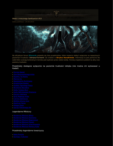Wieści z mrocznego Sanktuarium #13 Data publikacji : 24.04.2014 Na oficjalnym forum Blizzarda pojawiła się lista przedmiotów, które możecie zdobyć wyłącznie na najwyższych poziomach trudności (Udręka/Torment) lub znaleźć w Skrytce Horadrimów. Informacja ta jest pomocna dla osób które szukają konkretnych itemów pod wybrane przez siebie buildy. Poniżej znajdziecie podział na akty oraz poziomy trudności. Przedmioty dostępne wyłącznie na poziomie trudności Udręka (nie można ich wylosować u Kadali) ● ● ● ● ● ● ● ● ● ● ● ● ● ● ● ● ● Pomsta Natalii Zew Nieśmiertelnego Króla Aspekty Tal Rashy Mantra Iny Nawiedzenie Zunimassy Dziedzictwo Raekor Ozdoby Ognistego Ptaka Wcielenie Marudera Szaty Tysiąca Burz Szaty Nefrytowego Żniwiarza Pancerz Akkhana Strój Małpiego Króla Ciernie Zaklinacza Wielkie Arkana Vyra Opończa Cienia Potęga Ziemi Uprząż Piekielnego Kła Legendarne Mikstury ● ● ● ● ● ● Bezdenna Mikstura Wieży Bezdenna Mikstura Diamentu Bezdenna Mikstura Regeneracji Bezdenna Mikstura Pijawki Bezdenna Mikstura Szlachtowania Bezdenna Mikstura Pomocy Kulla Przedmioty legendarne towarzyszy ● ● Ręka Proroka Dymiący Trybularz ● ● ● ● Sztych Ribalda Klucz do Koszmaru Relikt Akarata Olśniewająca Łaska Pozostałe przedmioty ● ● ● ● ● ● Skupienie Powściągliwość Znieważacz Spryt Łotrzyka Siewca Nienawiści Onuce Lut Przedmioty ze Skrytki Horadrimów Akt I ● ● ● ● ● Berło Szalonego Króla Pierścień Królewskiej Wspaniałości Naramienniki Króla Szkieletów Złoty Ryngraf Leoryka Krwawe Łapawice Akt II ● ● ● ● Sabotaż Sabatu Rękawice Czciciela Opończa Oszustwa Iluzoryczne Buty Akt III ● ● ● ● ● ● ● Wybuch Gniewu Buty Pogardy Upadek Dumy Zazdrosna Klinga Opaska Chciwości Nienasycony Pas Przemożne Pragnienie Akt IV Przedmioty ze Skrytki Horadrimów w tym akcie mogą wylosować się z każdego innego aktu. Akt V ● ● ● ● ● Pakt ze Śmiercią Kruszyciel Dusz Poskramiacz Piekieł Zbawienie Obrączka Pandemonium Ważna informacja dla osób grających Szamanami lub Czarownicami. W patchu 2.0.4 pojawił się bug w tarczach Krzyżowca, które losowały błędne wartości szansy na blok. W efekcie czego, przedmioty te posiadały zbyt małe wartości szansy na blok, a legendarne źródła i mojo losowały za duże wartości do obrażeń. Kolejny fix naprawił problem z tarczami Krzyżowca, jednak źródła i mojo generowały po poprawce zaniżone wartości do maksymalnych obrażeń. Problem ten został już rozwiązany. Ponadto w przyszłej aktualizacji twórcy chcą podwyższyć bazowe obrażenia w legendarnych mojo i źródłach, gdyż są one za niskie w stosunku do przedmiotów rzadkich. Niekiedy bywa tak, że przedmioty żółte dają większe wartości do obrażeń niż legendarne odpowiedniki. Blizzard przygląda się umiejętności Szamana - Ofiara. Według twórców istnieją pewne błędy w mechanice tej umiejętności. Na chwilę obecną skill nie zostanie zbuffowany. Krzyżowcy! Uważajcie na umiejętności Żelazna Skóra (z runą Odbijająca Skóra) oraz Kanon Sprawiedliwości (z runą Ochrona Niewinnych). Połączenie tych umiejętności może spowodować błąd krytyczny kończący się śmiercią postaci. Szczególnie uważajcie grając w trybie HC. Autor: BeLial Data publikacji : 24.04.2014 Data modyfikacji : 24.04.2014 Liczba wyświetleń tekstu: 11804 Tagi: umiejętności, Szaman, przedmioty legendarne, Krzyżowiec POWRÓT DRUKUJ PDF POLEĆ ZNAJOMEMU Komentarz (19) dodaj komentarz WOW! To chyba najgorszy bug jaki został odkryty w D3!~SzRaPnEL 2014/04/24 11:43 Chwila Chwila... To jest wykaz unikalnych legend, które NIE MOGĄ być otrzymane u Kadali. Cytuję: "That said, below are Legendary and Set items that CANNOT be obtained via Kadala. Legendary and Set items not listed below should be included on her drop table. " http://us.battle.net/d3/en/forum/topic/12505892002?page=3#45 Belial, proszę o zmianę :)~Vendeur 2014/04/24 12:16 Nie podaliście w końcu które przedmioty wypadają u Kadali. Swoją drogą czy sety Kadala generuje? Co najbardziej oplaca sie u niej brać grając wizzem? Jakie są wasze doświadczenia?~biela82 2014/04/24 12:17 ~Vendeur: Zaznaczyłem w newsie, które itemy są z tormentów, nie napisałem tam, że dostępne są u Kadali, patrz na nagłówki... (dodałem specjalnie dla Ciebie info w nagłówku) ~biela82: U Kadali nie są dostępne itemy z pierwszych czterech list. Ja pierścieni szukałem, bo sety z tormentów nie lecą, więc średnio się opłaca w pozostałe itemy inwestować według mnie. Można trafić jednak na Blackthorna. Butki mi się raz trafiły :-)~BeLial Battlenet Network 2014/04/24 12:47 Wczoraj kupiłem Onuce Lut u Kadali, więc albo jest bug, który na to pozwala, albo Blizzard sam nie wie co gdzie można dostać :-). W sumie to za bardzo nie mam co już kupować u Kadali, za bloodshardy będę po prostu ubierał inne postaci. Poluję na same sety klasowe.~Cin3k 2014/04/24 13:03 ~BeLial Coś musiałeś podmienić :P Ale ja wypowiedź na tamtejszym forum rozumiem tak, że przedmioty ze Skrytki Horadrimów także nie mogą się pojawić u Kadali. Prawdę mówiąc, nie tylko ja tak rozumiem. Na streamach ludzie podobnie piszą. Ta cała lista przedstawia legendy, których Kadala dać nie może. :)~Vendeur 2014/04/24 14:16 no nie mogę wydropić tego pierścienia z 1 aktu :( najgorsze jest to, że chyba miałem go na lvl40 ale zmieliłem xD~VeR 2014/04/24 15:34 ~Vendeur: Nic nie podmieniłem. :-) Popatrz, skoro coś może wypaść tylko ze skrytki, to chyba logiczne jest to, że nie może trafić się u Kadali co nie? :-) Wszystko w newsie jest dobrze napisane. ~VeR: Mam to samo :-)~BeLial Battlenet Network 2014/04/24 19:54 Ja tez gram wizz i do tej pory na jakies 700 wydanych shardow trafilem jedna legende, ktora na drugi dzien wydropilem ... Ogolnie to lipa straszna ciezko cokolwiek t