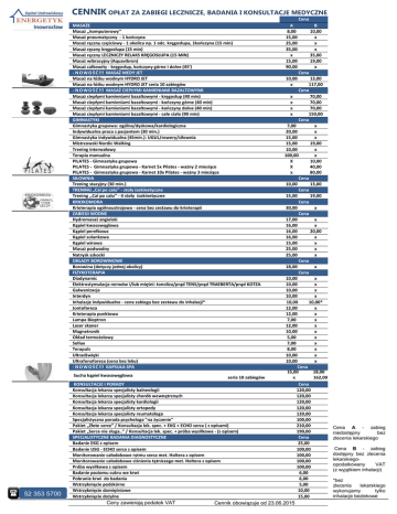 CENNIK OPŁAT ZA ZABIEGI LECZNICZE, BADANIA I KONSULTACJE MEDYCZNE Cena 52 353 5700 00 MASAŻE Masaż ,,komputerowy’’ Masaż pneumatyczny - 1 kończyna Masaż ręczny częściowy - 1 okolica np. 1 odc. kręgosłupa, 1kończyna (15 min) Masaż ręczny kręgosłupa (15 min) Masaż ręczny LECZNICZY RELAKS KRĘGOSŁUPA (15 MIN) Masaż wibracyjny (Aquavibron) Masaż całkowity - kręgosłup, kończyny górne i dolne (45’) - N O W O Ś Ć !!! MASAŻ MEDY JET Masaż na łóżku wodnym HYDRO JET Masaż na łóżku wodnym HYDRO JET seria 10 zabiegów - N O W O Ś Ć !!! MASAŻ CIEPŁYMI KAMIENIAMI BAZALTOWYMI Masaż ciepłymi kamieniami bazaltowymi - kręgosłup (40 min) Masaż ciepłymi kamieniami bazaltowymi - kończyny górne (40 min) Masaż ciepłymi kamieniami bazaltowymi - kończyny dolne (40 min) Masaż ciepłymi kamieniami bazaltowymi - całe ciało (90 min) GIMNASTYKI Gimnastyka grupowa: ogólna/dyskowa/kardiologiczna Indywidualna praca z pacjentem (30 min.) Gimnastyka indywidualna (45min.): UGUL/rowery/siłownia Mistrzowski Nordic Walking Trening interwałowy Terapia manualna PILATES - Gimnastyka grupowa PILATES - Gimnastyka grupowa - Karnet 5x Pilates - ważny 2 miesiące PILATES - Gimnastyka grupowa - Karnet 10x Pilates - ważny 3 miesiące SIŁOWNIA Trening stacyjny (30 min.) TRENING „Cal po calu’’ - stoły izokinetyczne Trening ,,Cal po calu’’ - 4 stoły izokinetyczne KRIOKOMORA Krioterapia ogólnoustrojowa - cena bez zestawu do krioterapii ZABIEGI WODNE Hydromasaż angielski Kąpiel kwasowęglowa Kąpiel perełkowa Kąpiel solankowa Kąpiel wirowa Masaż podwodny Natrysk szkocki OKŁADY BOROWINOWE Borowina (dotyczy jednej okolicy) FIZYKOTERAPIA Diadynamic Elektrostymulacja nerwów i/lub mięśni: tonoliza/prąd TENS/prąd TRAEBERTA/prąd KOTZA Galwanizacja Interdyn Inhalacje indywidualne - cena zabiegu bez zestawu do inhalacji* Jontoforeza Krioterapia punktowa Lampa Bioptron Laser skaner Magnetronik Okład termożelowy Sollux Terapuls Ultradźwięki Ultrafonoforeza (cena bez leku) - N O W O Ś Ć !!! KAPSUŁA SPA FIZYKOTERAPIA Sucha kąpiel kwasowęglowa seria 10 zabiegów KONSULTACJE I PORADY Konsultacja lekarza specjalisty balneologii Konsultacja lekarza specjalisty chorób wewnętrznych Konsultacja lekarza specjalisty kardiologii Konsultacja lekarza specjalisty ortopedy Konsultacja lekarza specjalisty reumatologa Specjalistyczna porada psychologa "na życzenie" Pakiet „Złote serce” / Konsultacja lek. spec. + EKG + ECHO serca ( z opisami) Pakiet „Serce nie sługa..” / Konsultacja lek. spec. + próba wysiłkowa - (z opisem) SPECJALISTYCZNE BADANIA DIAGNOSTYCZNE Badanie EKG z opisem Badanie USG - ECHO serca z opisem Monitorowanie całodobowe rytmu serca met. Holtera z opisem Monitorowanie całodobowe ciśnienia tętniczego met. Holtera z opisem Próba wysiłkowa z opisem Badanie poziomu cukru we krwi Pobranie krwi do badania Wstrzyknięcie podskórne Wstrzyknięcie domięśniowe Wstrzyknięcie dożylne Ceny zawierają podatek VAT A 8,00 15,00 25,00 35,00 x 15,00 90,00 B 10,00 x x x 35,00 19,00 x Cena 10,00 x 13,00 117,00 Cena x 70,00 x 70,00 x 70,00 x 150,00 Cena 7,00 x 20,00 x 15,00 x 15,00 19,00 10,00 x 100,00 x X 10,00 X 40,00 x 80,00 Cena 10,00 13,00 Cena 15,00 19,00 Cena 30,00 x Cena 17,00 x 16,00 x 16,00 20,00 16,00 x 15,00 x 25,00 x 25,00 x Cena 18,00 x Cena 10,00 x 10,00 x 10,00 x 10,00 x 10,00 10,00* 12,00 x 12,00 x 7,00 x 12,00 x 10,00 x 5,00 x 7,00 x 8,00 x 10,00 x 10,00 x Cena 15,00 18,00 Cena x 162,00 Cena 120,00 120,00 120,00 120,00 120,00 100,00 210,00 190,00 Cena 25,00 100,00 100,00 100,00 100,00 6,00 6,00 5,00 10,00 15,00 Cennik obowiązuje od 23.06.2015 Cena A - zabieg niedostępny bez zlecenia lekarskiego Cena B - zabieg dostępny bez zlecenia lekarskiegoopodatkowany VAT (z wyjątkiem inhalacji) *bez zlecenia lekarskiego wykonujemy tylko inhalacje bezlekowe