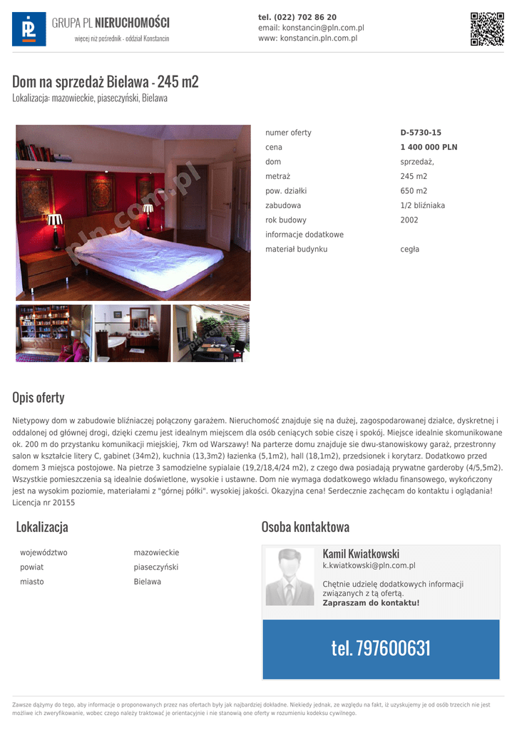 tel. (022) 702 86 20 email: [email protected] www: konstancin.pln.com.pl Dom na sprzedaż Bielawa - 245 m2 Lokalizacja: mazowieckie, piaseczyński, Bielawa numer oferty D-5730-15 cena 1 400 000 PLN dom sprzedaż, metraż 245 m2 pow. działki 650 m2 zabudowa 1/2 bliźniaka rok budowy 2002 informacje dodatkowe materiał budynku cegła Opis oferty Nietypowy dom w zabudowie bliźniaczej połączony garażem. Nieruchomość znajduje się na dużej, zagospodarowanej działce, dyskretnej i oddalonej od głównej drogi, dzięki czemu jest idealnym miejscem dla osób ceniących sobie ciszę i spokój. Miejsce idealnie skomunikowane ok. 200 m do przystanku komunikacji miejskiej, 7km od Warszawy! Na parterze domu znajduje sie dwu-stanowiskowy garaż, przestronny salon w kształcie litery C, gabinet (34m2), kuchnia (13,3m2) łazienka (5,1m2), hall (18,1m2), przedsionek i korytarz. Dodatkowo przed domem 3 miejsca postojowe. Na pietrze 3 samodzielne sypialaie (19,2/18,4/24 m2), z czego dwa posiadają prywatne garderoby (4/5,5m2). Wszystkie pomieszczenia są idealnie doświetlone, wysokie i ustawne. Dom nie wymaga dodatkowego wkładu finansowego, wykończony jest na wysokim poziomie, materiałami z "górnej półki". wysokiej jakości. Okazyjna cena! Serdecznie zachęcam do kontaktu i oglądania! Licencja nr 20155 Lokalizacja Osoba kontaktowa Kamil Kwiatkowski województwo mazowieckie powiat piaseczyński [email protected] miasto Bielawa Chętnie udzielę dodatkowych informacji związanych z tą ofertą. Zapraszam do kontaktu! tel. 797600631 Zawsze dążymy do tego, aby informacje o proponowanych przez nas ofertach były jak najbardziej dokładne. Niekiedy jednak, ze względu na fakt, iż uzyskujemy je od osób trzecich nie jest możliwe ich zweryfikowanie, wobec czego należy traktować je orientacyjnie i nie stanowią one oferty w rozumieniu kodeksu cywilnego.