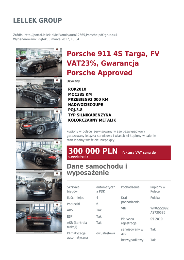 LELLEK GROUP Źródło: http://portal.lellek.pl/lel/komis/auto12665,Porsche.pdf?grupa=1 Wygenerowano: Piątek, 3 marca 2017, 18:04 Porsche 911 4S Targa, FV VAT23%, Gwarancja Porsche Approved Używany ROK2010 MOC385 KM PRZEBIEG93 000 KM NADWOZIECOUPE POJ.3.8 TYP SILNIKABENZYNA KOLORCZARNY METALIK kupiony w polsce serwisowany w aso bezwypadkowy garażowany książka serwisowa I właściciel kupiony w salonie stan idealny właściciel niepalący 300 000 PLN faktura VAT cena do uzgodnienia Dane samochodu i wyposażenie Skrzynia biegów automatyczn a PDK Pochodzenie kupiony w Polsce Ilość miejsc 4 Polska Poduszki 6 Kraj pochodzenia ABS Tak VIN WP0ZZZ99Z AS730586 ESP Tak Tak Pierwsza rejestracja 05-2010 ASR (kontrola trakcji) dwustrefowa serwisowany w aso Tak Klimatyzacja automatyczna bezwypadkowy Tak Xenony garażowany Tak książka serwisowa Tak I właściciel Tak kupiony w salonie Tak tunning homologacja stan idealny Tak właściciel niepalący Tak Tak Handlowiec Elektryczne szyby Tak Elektryczne lusterka Tak Wspomaganie kierownicy Tak Komputer Tak Alarm Tak Immobilizer Tak Centralny zamek Tak Nawigacja satelitarna Tak Światła przeciwmgieln e Tak Czujnik deszczu Tak Czujniki parkowania Tak Kierownica wielofunkcyjna Tak Podgrzewane fotele Tak Tempomat Tak 4x4 Tak System Start-Stop Tak Czujniki parkowania przód Tak Dach panoramiczny Tak Alufelgi 19 Cali Porsche Centrum Sopot / Approved Marcin Teske, Maciej Słobodowski +48 661 911 912 zapytaj mobile +48 515 000 911 Miejsce postoju dostępna Opis dodatkowy Gwarancja Gwarancja Ubezpieczenie Porsche 911 4S Targa Ubezpieczenie dostępne Kolor: Basalt Black Metallic Tapicerka: Leather interior in natural leather brown Kredyt Kredyt Wyposażenie: dostępny Zeskanuj kod, aby zobaczyć ofertę online 250 7-speed Porsche Doppelkupplung (PDK) 342 Heated Seats 404 19" Turbo Wheel 541 Seat Ventilation 567 Windscreen with grey top tint 635 Park Assist System 640 Sport Chrono Package Plus 672 Navigation Module for PCM 680 BOSE High End Sound Package 693 6-Disc CD/DVD Changer 810 Floor Mats in Interior Color 844 3-Spoke Multifunction Steering Wheel in Smooth Leather 998 Leather Interior Natural Leather P12 Automatically dimming interior and exterior mirrors with integrated rain sensor P15 Power Comfort Seats with Driver Memory XMZ Rear Center Console in Leather XNS Steering Column in Leather XSC Porsche Crest in Headrests XV1 Defroster Trim in Leather Nota prawna Informacja nie stanowi oferty w rozumieniu art. 66 Kodeksu Cywilnego. Podane dane mają charakter wyłącznie informacyjny. Pełna informacja dostępna jest u handlowca. Sprzedający nie odpowiada za ewentualne błędy lub nieaktualność ogłoszenia.
