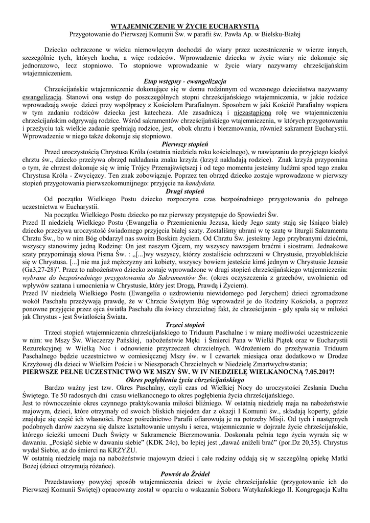 WTAJEMNICZENIE W ŻYCIE EUCHARYSTIĄ Przygotowanie do Pierwszej Komunii Św. w parafii św. Pawła Ap. w Bielsku-Białej Dziecko ochrzczone w wieku niemowlęcym dochodzi do wiary przez uczestniczenie w wierze innych, szczególnie tych, których kocha, a więc rodziców. Wprowadzenie dziecka w życie wiary nie dokonuje się jednorazowo, lecz stopniowo. To stopniowe wprowadzanie w życie wiary nazywamy chrześcijańskim wtajemniczeniem. Etap wstępny - ewangelizacja Chrześcijańskie wtajemniczenie dokonujące się w domu rodzinnym od wczesnego dzieciństwa nazywamy ewangelizacją. Stanowi ona wstęp do poszczególnych stopni chrześcijańskiego wtajemniczenia, w jakie rodzice wprowadzają swoje dzieci przy współpracy z Kościołem Parafialnym. Sposobem w jaki Kościół Parafialny wspiera w tym zadaniu rodziców dziecka jest katecheza. Ale zasadniczą i niezastąpioną rolę we wtajemniczeniu chrześcijańskim odgrywają rodzice. Wśród sakramentów chrześcijańskiego wtajemniczenia, w których przygotowaniu i przeżyciu tak wielkie zadanie spełniają rodzice, jest, obok chrztu i bierzmowania, również sakrament Eucharystii. Wprowadzenie w niego także dokonuje się stopniowo. Pierwszy stopień Przed uroczystością Chrystusa Króla (ostatnia niedziela roku kościelnego), w nawiązaniu do przyjętego kiedyś chrztu św., dziecko przeżywa obrzęd nakładania znaku krzyża (krzyż nakładają rodzice). Znak krzyża przypomina o tym, że chrzest dokonuje się w imię Trójcy Przenajświętszej i od tego momentu jesteśmy ludźmi spod tego znaku Chrystusa Króla - Zwycięzcy. Ten znak zobowiązuje. Poprzez ten obrzęd dziecko zostaje wprowadzone w pierwszy stopień przygotowania pierwszokomunijnego: przyjęcie na kandydata. Drugi stopień Od początku Wielkiego Postu dziecko rozpoczyna czas bezpośredniego przygotowania do pełnego uczestnictwa w Eucharystii. Na początku Wielkiego Postu dziecko po raz pierwszy przystępuje do Spowiedzi Św. Przed II niedzielą Wielkiego Postu (Ewangelia o Przemienieniu Jezusa, kiedy Jego szaty stają się lśniąco białe) dziecko przeżywa uroczystość świadomego przyjęcia białej szaty. Zostaliśmy ubrani w tę szatę w liturgii Sakramentu Chrztu Św., bo w nim Bóg obdarzył nas swoim Boskim życiem. Od Chrztu Św. jesteśmy Jego przybranymi dziećmi, wszyscy stanowimy jedną Rodzinę: On jest naszym Ojcem, my wszyscy nawzajem braćmi i siostrami. Jednakowe szaty przypominają słowa Pisma Św. : „[...]wy wszyscy, którzy zostaliście ochrzczeni w Chrystusie, przyoblekliście się w Chrystusa. [...] nie ma już mężczyzny ani kobiety, wszyscy bowiem jesteście kimś jednym w Chrystusie Jezusie (Ga3,27-28)”. Przez to nabożeństwo dziecko zostaje wprowadzone w drugi stopień chrześcijańskiego wtajemniczenia: wybrane do bezpośredniego przygotowania do Sakramentów Św. (okres oczyszczenia z grzechów, uwolnienia od wpływów szatana i umocnienia w Chrystusie, który jest Drogą, Prawdą i Życiem). Przed IV niedzielą Wielkiego Postu (Ewangelia o uzdrowieniu niewidomego pod Jerychem) dzieci zgromadzone wokół Paschału przeżywają prawdę, że w Chrzcie Świętym Bóg wprowadził je do Rodziny Kościoła, a poprzez ponowne przyjęcie przez ojca światła Paschału dla świecy chrzcielnej fakt, że chrześcijanin - gdy spala się w miłości jak Chrystus - jest Światłością Świata. Trzeci stopień Trzeci stopień wtajemniczenia chrześcijańskiego to Triduum Paschalne i w miarę możliwości uczestniczenie w nim: we Mszy Św. Wieczerzy Pańskiej, nabożeństwie Męki i Śmierci Pana w Wielki Piątek oraz w Eucharystii Rezurekcyjnej w Wielką Noc i odnowienie przyrzeczeń chrzcielnych. Wdrożeniem do przeżywania Triduum Paschalnego będzie uczestnictwo w comiesięcznej Mszy św. w I czwartek miesiąca oraz dodatkowo w Drodze Krzyżowej dla dzieci w Wielkim Poście i w Nieszporach Chrzcielnych w Niedzielę Zmartwychwstania; PIERWSZE PEŁNE UCZESTNICTWO WE MSZY ŚW. W IV NIEDZIELĘ WIELKANOCNĄ 7.05.2017! Okres pogłębienia życia chrześcijańskiego Bardzo ważny jest tzw. Okres Paschalny, czyli czas od Wielkiej Nocy do uroczystości Zesłania Ducha Świętego. Te 50 radosnych dni czasu wielkanocnego to okres pogłębienia życia chrześcijańskiego. Jest to równocześnie okres czynnego praktykowania miłości bliźniego. W ostatnią niedzielę maja na nabożeństwie majowym, dzieci, które otrzymały od swoich bliskich niejeden dar z okazji I Komunii św., składają koperty, gdzie znajduje się część ich własności. Przez pośrednictwo Parafii ofiarowują je na potrzeby Misji. Od tych i następnych podobnych darów zaczyna się dalsze kształtowanie umysłu i serca, wtajemniczanie w dojrzałe życie chrześcijańskie, którego ścieżki umocni Duch Święty w Sakramencie Bierzmowania. Doskonała pełnia tego życia wyraża się w dawaniu. „Posiąść siebie w dawaniu siebie” (KDK 24c), bo lepiej jest „dawać aniżeli brać” (por.Dz 20,35). Chrystus wydał Siebie, aż do śmierci na KRZYŻU. W ostatnią niedzielę maja na nabożeństwie majowym dzieci i całe rodziny oddają się w szczególną opiekę Matki Bożej (dzieci otrzymują różańce). Powrót do Źródeł Przedstawiony powyżej sposób wtajemniczenia dzieci w życie chrześcijańskie (przygotowanie ich do Pierwszej Komunii Świętej) opracowany został w oparciu o wskazania Soboru Watykańskiego II. Kongregacja Kultu Bożego wydała w roku 1972, zatwierdzone przez Ojca Świętego, gotowe wzory - odnowionych na podobieństwo dawnych, ukształtowanych w czasach apostolskich - obrzędów chrześcijańskiego wtajemniczenia. Zaleca się stosować je nie tylko w przygotowaniu dorosłych, ale również dzieci, które osiągnęły wiek katechizacyjny, zarówno nieochrzczonych, jak i przygotowujących się do Pierwszej Spowiedzi i Komunii Św. Drodzy Rodzice! Wasz syn(córka) przygotowuje się w tym roku szkolnym do przyjęcia sakramentów Pokuty i Eucharystii. Jest t