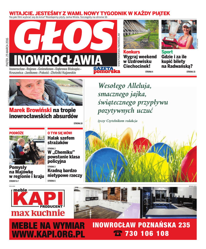 WITAJCIE. JESTEŚMY Z WAMI. NOWY TYGODNIK W KAŻDY PIĄTEK Inowrocław Rojewo Gniewkowo Dąbrowa Biskupia Kruszwica Janikowo Pakość Złotniki Kujawskie A A A Konkurs Wygraj weekend w Uzdrowisku Ciechocinek! FOT. NADESŁANE Sport Gdzie i za ile kupić bilety na Radwańską? A A STRONA 4 STRONA 15 FOT. DARIUSZ NAWROCKI A A FOT. NADESŁANE PIĄTEK, 25 MARCA 2016 WWW.POMORSKA/INOWROCLAW Na jaki film wybrać się do kina? Rozdajemy płyty Jarka Wista. Szczegóły na stronie 16 Marek Browiński na tropie inowrocławskich absurdów STRONA 10 PODRÓ E O TYM SIĘ MÓWI Halak szefem stra aków FOT. NADESŁANE STRONA 3 W „Chemiku” powstanie klasa policyjna STRONA 3 Pomysły Kradną bardzo na Majówkę w regionie i kraju nietypowe rzeczy STRONY 6-7 REKLAMA STRONA 5 B056001089A GŁOS INOWROCŁAWIA 2 Z DRUGIEJ STRONY PIĄTEK, 25 MARCA, 2016 NIEDZIELA SOBOTA ŁEK PONIEDZIA WTOREK ŚRODA CZWARTEK 25 26 27 28 29 30 31 PIĄTEK marca marca Na imieniny idziemy do: Marioli, Łucji, Ireneusza Na imieniny idziemy do: Larysy, Feliksa, Teodora Wielki Piątek Dzień Świętości ycia Międzynarodowy Dzień Gofra Dzień Czytania Tolkiena Wielka Sobota Godzina dla Ziemi Dzień Dobrego Łotra Dzień Niedźwiedzia Grizzl marca Na imieniny idziemy do: Lidii, Aleksandra, Ernesta, Franciszka, Roberta, Ruperta Wielkanoc Dzień Teatru CYTAT TYGODNIA marca Na imieniny idziemy do: Anieli, Joanny, Renaty, Jana, Kastora, Rogata Poniedziałek Wielkanocny Dzień Chwastów Dzień elków marca marca marca Na imieniny idziemy do: Eustazji, Ludolfiny, Satury, Eustachego, Ludolfa, Marka, Satura, Stefana, Teodora, Wiktoryna Na imieniny idziemy do: Amadeusza, Jana, Mamertyna, Piotra Na imieniny idziemy do: Balbiny, Neli, Achacego, Amosa, Beniamina, Gwidona, Myślidara Dzień Muffinka Dzień Pośrednika w Obrocie Nieruchomościami Światowy Dzień Backupu Światowy Dzień Budyniu Święto Wolności Malty Dzień Metalowca FOTO TYGODNIA Może nawet z tą moją lotną głową zrobiłbym jakąś karierę. Do tego zabrakło jednak wykształcenia. Naczelnikiem w ratuszu bez papierka nie zostanę FOT. DOMINIK FIJAŁKOWSKI Marek Browiński o tym, że w młodości popełnił błąd, rzucił studia Redaktor prowadzący [email protected] Życzę wszystkim rodzinnych świąt! RYSUNEK W GŁOSIE PLUSY FOT. NADESŁANE cami naszego kraju. Każdy znajdzie coś dla siebie. Przybliżamy postać kontrowersyjnego taksówkarza i dziennikarza obywatelskiego Marka Browińskiego. Tropi z zapałem absurdy (głównie drogowe). Ma spore grono zwolenników, ale też ogromną ilość wrogów. Bardzo mi miło, że konkurs plastyczny dla uczniów klas I-III szkół podstawowych oraz plebiscyt na najlepszy warsztat samochodowy w Inowrocławiu i okolicy, cieszyły się tak dużym zainteresowaniem. Brawa dla zwycięzców. Dziękuję za udział i zapraszam do kolejnych akcji. Redakcja Głosu Inowrocławia życzy naszym Czytelnikom wesołych, rodzinnych świąt. Do zobaczenia za tydzień. Redaktor prowadzący Maciej Drabikowski, tel. 519 503 715 e-mail: [email protected] Doradca ds. reklamy Dawid Sołtysiak, tel. 697 771 936 [email protected] RYS. JARO W itam przedświątecznie wszystkich Czytelników Głosu Inowrocławia . W niedzielę i poniedziałek większość z nas zasiądzie do wielkanocnego stołu. Dwa dni odpoczynku, relaksu i spotkań z najbliższymi nikomu nie zaszkodzą. Z pewnością część czasu wolnego spędzicie z naszym tygodnikiem. W świątecznym numerze radzimy, gdzie najlepiej wybrać się na majowe weekendy. W tym roku będą tylko czterodniowe, ale za to aż dwa. Prezentujemy propozycje wyjazdów do pobliskich miejsc w regionie, ale także oferty dalszych podróży w Polsce i poza grani- Potę na eksplozja wstrząsnęła w środę po południu Trlągiem, wsią w gminie Janikowo. W kilka sekund zamieniła jednorodzinny dom w stertę gruzów. W akcji ratowniczej uczestniczyło 60 stra aków. Z gruzowiska wydobyli 86letnią kobietę. Jej stan był cię ki. Poszkodowana zmarła w szpitalu. (FI) FOT. NADESŁANE Maciej Drabikowski Brejza obniży karę mieszkańcówi Polanisz otrzymał stypendium sportowe Niepełnosprawny inowrocławianin został przyłapany przez stra ników miejskich na gorącym uczynku w trakcie rozklejania ulotek na słupach. Dostał 500 złotych mandatu. Dzięki wsparciu Zbigniewa Gedowskiego i Dariusza Mielcarka (pomogli znaleźć pracę i napisać pismo) o sprawie dowiedział się Ryszard Brejza. Prezydent Inowrocławia nie ma prawnej mo liwości umorzenia mandatu, ale zdecydował się na obni enie kary mieszkańcowi o 450 złotych. Inowrocławianin Emil Polanisz znalazł się w gronie 242 zawodników, którzy otrzymali stypendium sportowe prezydenta Torunia za dobre wyniki w 2015 roku. Trzykrotny mistrz Polski seniorów na co dzień trenuje w Kręgielni Inowrocław. Reprezentuje jednak barwy TKB Toruń. Udanie powrócił na bowlingowe tory po powa nym wypadku samochodowym. W minionym sezonie triumfował w mistrzostwach kraju dwójek i trójek, które odbyły się w Toruniu. O TYM SIĘ MÓWI 3 GŁOS INOWROCŁAWIA PIĄTEK, 25 MARCA, 2016 FOT. NADESŁANE Halak szefem strażaków w regionie Inowrocławianin Janusz Halak zastąpi Tomasza Leszczyńskiego na stanowisku komendanta wojewódzkiego Państwowej Straży Pożarnej. Akt powołania wręczył mu sekretarz stanu w MSWiA Jarosław Zieliński. 46-letni Halak zajmował różne stanowiska służbowe, m.in. dowódcy sekcji, starszego specjalisty, a następnie dowódcy jednostki ratowniczo-gaśniczej w Inowrocławiu, głównego specjalisty w komendzie Głównej PSP, naczelnika wydziału kadr KW PSP w Toruniu. - Posiada pełne przygotowanie zawodowe, zdobytą wiedzę fachową oraz doświadczenie niezbędne do realizacji zadań organizacyjnych, operacyjnych i kontrolno-rozpoznawczych - informuje Joanna Matusiak, z wydziału informacji i promocji KG PSP. a REKLAMA Od wrześna w Zespole Szkół Ponadgimnazjalnych nr 1 w Inowrocławiu powstanie klasa o profilu policyjnym. W szkole odby