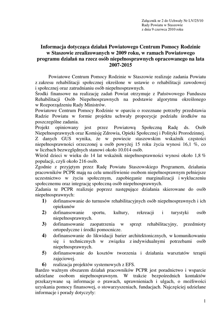 Załącznik nr 2 do Uchwały Nr LV/25/10 Rady Powiatu w Staszowie z dnia 9 czerwca 2010 roku Informacja dotycząca działań Powiatowego Centrum Pomocy Rodzinie w Staszowie zrealizowanych w 2009 roku, w ramach Powiatowego programu działań na rzecz osób niepełnosprawnych opracowanego na lata 2007-2015 Powiatowe Centrum Pomocy Rodzinie w Staszowie realizuje zadania Powiatu z zakresu rehabilitacji społecznej określone w ustawie o rehabilitacji zawodowej i społecznej oraz zatrudnianiu osób niepełnosprawnych. Środki finansowe na realizację zadań Powiat otrzymuje z Państwowego Funduszu Rehabilitacji Osób Niepełnosprawnych na podstawie algorytmu określonego w Rozporządzeniu Rady Ministrów. Powiatowe Centrum Pomocy Rodzinie w oparciu o rozeznane potrzeby przedstawia Radzie Powiatu w formie projektu uchwały propozycje podziału środków na poszczególne zadania. Projekt opiniowany jest przez Powiatową Społeczną Radę ds. Osób Niepełnosprawnych oraz Komisję Zdrowia, Opieki Społecznej i Polityki Prorodzinnej. Z danych GUS wynika, że w powiecie staszowskim wskaźnik częstości niepełnosprawności orzeczonej u osób powyżej 15 roku życia wynosi 16,1 %, co w liczbach bezwzględnych stanowi około 10.014 osób. Wśród dzieci w wieku do 14 lat wskaźnik niepełnosprawności wynosi około 1,8 % populacji, czyli około 216 osób. Zgodnie z przyjętym przez Radę Powiatu Staszowskiego Programem, działania pracowników PCPR mają na celu umożliwienie osobom niepełnosprawnym pełniejsze uczestnictwo w życiu społecznym, zapobieganie marginalizacji i wykluczeniu społecznemu oraz integrację społeczną osób niepełnosprawnych. Zadania te PCPR realizuje poprzez następujące działania skierowane do osób niepełnosprawnych: 1) dofinansowanie do turnusów rehabilitacyjnych osób niepełnosprawnych i ich opiekunów 2) dofinansowanie sportu, kultury, rekreacji i turystyki osób niepełnosprawnych. 3) dofinansowanie zaopatrzenia w sprzęt rehabilitacyjny, przedmioty ortopedyczne i środki pomocnicze. 4) dofinansowanie do likwidacji barier architektonicznych, w komunikowaniu się i technicznych w związku z indywidualnymi potrzebami osób niepełnosprawnych. 5) dofinansowanie do kosztów tworzenia i działania warsztatów terapii zajęciowej. 6) realizacja projektów systemowych z EFS. Bardzo ważnym obszarem działań pracowników PCPR jest poradnictwo i wsparcie udzielane osobom niepełnosprawnym. W trakcie bezpośrednich kontaktów przekazywane są informacje o prawach, uprawnieniach i ulgach, o możliwości uzyskania pomocy finansowej, o stowarzyszeniach, fundacjach. Najczęściej udzielane informacje i porady dotyczyły: 1 - ulg przy przejazdach PKP i PKS, w opłacie abonamentu telefonicznego i radiowo-telewizyjnego, - zasad i uprawnień do korzystania z karty parkingowej, - korzystania z dofinansowania do zadań realizowanych przez PCPR (turnusy, bariery, sport i rekreacja, sprzęt ortopedyczny) - korzystania z środowiskowych form wsparcia takich jak: warsztaty terapii zajęciowej, środowiskowe domy samopomocy, - korzystania ze świadczeń pomocy społecznej oraz z systemu zabezpieczenia społecznego ZUS i KRUS (renty inwalidzkie, renty socjalne, zasiłki pielęgnacyjne, orzekanie o stopniu niepełnosprawności) - zasadach orzekania przez Powiatowe Zespoły ds. Orzekania o Niepełnosprawności, wydawania legitymacji - programów realizowanych przez Oddział Świętokrzyski PFRON (dofinansowanie do zakupu: komputera, elektrycznego wózka inwalidzkiego, dla osób niepełnosprawnych kształcących się na wyższych uczelniach ). Środki PFRON na rehabilitację społeczną osób niepełnosprawnych w latach 2005-2009. Lp. Zadanie 2005 2006 2007 2008 2009 1 Finansowanie Warsztatu 600.000 576.560 542.060 536.560 621.432 Terapii Zajęciowej w Połańcu 2 Dofinansowanie do zakupu 168.745 438.984 359.904 309.609 224.696 sprzętu rehabilitacyjnego, przedmiotów ortopedycznych i środków pomocniczych dla indywidualnych osób i podmiotów prowadzących działalność rehabilitacyjną 3 Dofinansowanie do likwidacji 270.042 240.000 265. 208 146.140 119.737 barier architektonicznych, w komunikowaniu się oraz technicznych dla osób indywidualnych 4 Dofinansowanie do 121.344 124.572 115.006 114.139 95.082 uczestnictwa w turnusach rehabilitacyjnych 5 Dofinansowanie do sportu, 14.197 22.942 17.033 15.000 14.000 kultury, rekreacji i turystyki osób niepełnosprawnych Ogółem 1.174.328 1.403.058 1.299.211 1.121.448 1.074.947 W ciągu roku na bieżąco była prowadzona ewidencja i kontrola wykorzystania środków na podstawie czego wnioskowano do Rady Powiatu o dokonywanie zmian w planie środków na realizację poszczególnych zadań. Środki na rehabilitację społeczną zostały wykorzystane w 99,97 %. 2 1. Warsztat Terapii Zajęciowej w Połańcu. W terapii realizowanej przez WTZ uczestniczyło 42 osoby niepełnosprawne w stopniu znacznym i umiarkowanym. Łącznie z dodatkowymi środkami koszt działalności WTZ wynosił 690.480,00 zł., w tym 69.048,00 zł. stanowiła dotacja Powiatu. Średni m-czny koszt pobytu jednego uczestnika wynosił 1.370,00 zł. Celem zajęć terapeutycznych realizowanych przez pracowników WTZ jest poprawa kondycji fizycznej i psychicznej uczestników, rozwijanie ich umiejętności i kompetencji społecznych. Do realizacji tych celów pracownicy wykorzystują elementy terapii leczniczej, zajęciowej, prowadzą zajęcia mające na celu naukę zachowań społecznych. 2. Dofinansowanie do zakupu sprzętu rehabilitacyjnego otrzymało 8 osób niepełnosprawnych na łączną kwotę 16.310,00 zł. W roku 2009 wpłynęło 26 wniosków o dofinansowanie do zakupu sprzętu rehabilitacyjnego z tego: - 8 wniosków zostało zrealizowanych, - 18 wniosków niezrealizowano z powodu braku środków finansowych. Dofinansowanie do zakupu sprzętu rehabilitacyjnego dla indywidualnych osób wynosi 60% wartości zakupionego sprzętu. Dofinansowanie do zakupu przedmiotów ortopedy