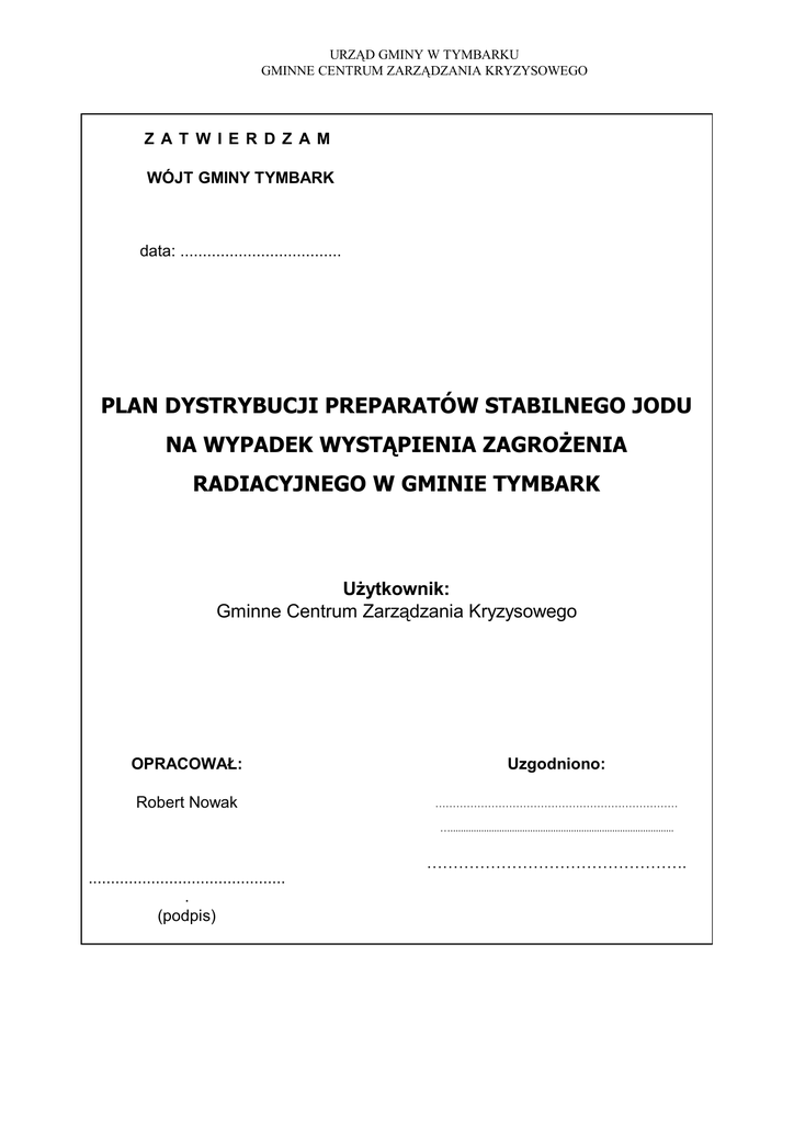 URZĄD GMINY W TYMBARKU GMINNE CENTRUM ZARZĄDZANIA KRYZYSOWEGO Z AT W I E R D Z AM WÓJT GMINY TYMBARK data: .................................... PLAN DYSTRYBUCJI PREPARATÓW STABILNEGO JODU NA WYPADEK WYSTĄPIENIA ZAGROŻENIA RADIACYJNEGO W GMINIE TYMBARK Użytkownik: Gminne Centrum Zarządzania Kryzysowego OPRACOWAŁ: Uzgodniono: Robert Nowak …………………………………………………………… …....................................................................................... ............................................ . (podpis) …………………………………………. KARTA AKTUALIZACJI PLANU DYSTRYBUCJI PREPARATÓW STABILNEGO JODU NA WYPADEK WYSTĄPIENIA ZAGROŻENIA RADIACYJNEGO W GMINIE TYMBARK LP 1 2 3 4 5 6 7 8 9 10 11 12 13 14 DATA AKTUALIZACJI PRZEDMIOT AKTUALIZACJI PODPIS I. OGÓLNE ZASADY PROWADZENIA AKCJI JODOWEJ 1. PODSTAWA PRAWNA Art. 90 pkt 3 ustawy prawo atomowe z dnia 29 listopada 2000 r. (tekst jednolity Dz. U. z 2004 r. Nr 161, poz. 1689 z późniejszymi zmianami) oraz § 1 pkt 3 rozporządzenia Rady Ministrów z dnia 27 kwietnia 2004 r. w sprawie wartości poziomów interwencyjnych oraz kryteriów odwołania tych działań (Dz. U. Nr 98, poz. 987 ). Prawo atomowe: Art. 90. Działaniami interwencyjnymi wprowadzanymi w razie możliwości przekroczenia poziomów interwencyjnych są: 1) ewakuacja; 2) nakaz pozostania w pomieszczeniach zamkniętych; 3) podanie preparatów ze stabilnym jodem; 4) zakaz lub ograniczenie: spożywania skażonej żywności i skażonej wody przeznaczonej do spożycia przez ludzi, żywienia zwierząt skażonymi środkami żywienia zwierząt i pojenia skażoną wodą oraz wypasu zwierząt na skażonym terenie; 5) czasowe przesiedlenie ludności; 6) stałe przesiedlenie ludności. Prawo atomowe : po art. 91 dodaje się art. 91a w brzmieniu: "Art. 91a. W zakresie działań interwencyjnych, o których mowa w art. 90, wojewodzie są podporządkowane organy i jednostki organizacyjne administracji rządowej i samorządu województwa oraz inne siły i środki wydzielone do jego dyspozycji i skierowane do wykonywania tych działań.”; Rozporządzenie Rady Ministrów w sprawie wartości poziomów interwencyjnych oraz kryteriów odwołania tych działań : § 1. Ustala się następujące wartości poziomów interwencyjnych dla poszczególnych rodzajów działań interwencyjnych: 3) podanie preparatów ze stabilnym jodem - jeżeli u dowolnej osoby z zagrożonego terenu zachodzi możliwość otrzymania na tarczycę dawki pochłoniętej równej co najmniej 100 mGy (miligrejom); 2. WPROWADZENIE W związku z rzeczywistym i potencjalnym narażeniem na promieniowanie jonizujące, pochodzące od : - sztucznych źródeł promieniotwórczych związanych z wykorzystaniem energii atomowej (elektrownie jądrowe zlokalizowane w krajach sąsiednich), - materiałów jądrowych , - urządzeń wytwarzających promieniowanie jonizujące, - odpadów promieniotwórczych, - wypalonego paliwa jądrowego, - skutków ataku terrorystycznego zaplanowano tzw. działania interwencyjne. Są to działania, które zapobiegają narażeniu lub zmniejszają narażenie ludzi w wyniku zdarzenia radiacyjnego, polegające na oddziaływaniu na : - źródło promieniowania jonizującego, - źródło skażeń promieniotwórczych, - drogi rozprzestrzeniania tych skażeń, - ludzi. Jednym z potencjalnych działań interwencyjnych jest podanie preparatów ze stabilnym jodem (tzn. nie promieniotwórczym izotopem – J127) w celu ochrony tarczycy. Działanie to jest dalej nazywane „akcją jodową”. W Polsce, preparaty ze stabilnym jodem planuje się podać ludności w postaci tabletek. 3. ZASADY PROWADZENIA AKCJI JODOWEJ Akcje jodową prowadzi się jeżeli u dowolnej osoby z zagrożonego terenu zachodzi możliwość otrzymania na tarczycę dawki pochłoniętej równej co najmniej 100 mGy (miligrejom) W przypadku wystąpienia zagrożenia o zasięgu wojewódzkim ,wojewoda występuje z wnioskiem o zwolnienie z rezerw państwowych preparatów stabilnego jodu. Miejscem odbioru preparatów stabilnego jodu w postaci tabletek w ilości przewidzianej dla gminy będzie Powiatowy Punkt Dystrybucji / PPD / organizowany w Szpitalu Powiatowym w Limanowej ul. Piłsudskiego 63 na sygnał przekazany przez Powiatowe Centrum Zarządzania Kryzysowego. 4. Organizacja dystrybucji i wydawania preparatów jodowych na terenie gminy: I. Wykaz Punktu Dystrybucji / PPD /: Lp. 1. NAZWA I ADRES Szpital Powiatowy w Limanowej ul. Piłsudskiego 63 TELEFON 3372025 II. Miejsce Rozmieszczenia Na Terenie Gminy Tymbark Punktu Dystrybucji Preparatów Jodowych: LP. 1. NAZWA I ADRES TELEFON Niepubliczny Zakład Opieki Zdrowotnej w Tymbarku 3325-220 III. Miejsce Rozmieszczenia Na Terenie Gminy Tymbark Punktów Wydawania Preparatów Jodowych: Lp. NAZWA I ADRES TELEFON 1. Szkoła Podstawowa w Tymbarku 3325-280 2. Szkoła Podstawowa w Podłopieniu 3325-072 IV. Wykaz Środków Transportowych Przeznaczonych Do Przewozu Preparatów Jodowych Z Powiatowego Punktu Dystrybucji Do Gminnego Oraz Z Gminnego Punktu Dystrybucji Do Punktów Wydawania Preparatów Jodowych. Lp Nazwa dysponenta samochodu 1. Ochotnicza Straż Pożarna w Marka samochodu Lublin TELEFON 606808534 Tymbarku 2. Pracownicy UG V. Sposób Informowania Ludności O Celu I Miejscach Wydawania Preparatów Jodowych: - komunikaty przekazywane do sołtysów - informowanie ludności za pomocą środków nagłaśniających będących w dyspozycji Policji i Straży Pożarnej VI. Dane Statystyczne Liczebności Ludności Gminy W Poszczególnych Grupach Ryzyka. Liczba mieszkańców Lp. Gmina Ogółem Noworodk Niemowlęt Dzieci Dzieci Młodzież Kobiety /suma i a Pow.2 pow.6 od 17 do ciężarne Liczb z Do Powyżej Roku roku 18 roku rubryk 3 m-cy 3 m-cy i Życia do życia i życia i Dzieci do 2 6 lat młodzież dorośli do 16 lat do lat 40 4-9/ lat 1 1. 2 3 4 5 6 7 3167 19 3167 19 8 9 103 161 515 2339 30 103 161 515 2339 30 Tymbark 6421 mieszkańcó w Razem Iloś