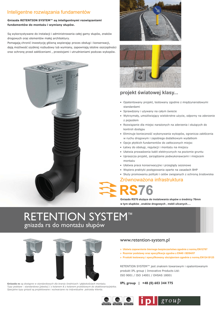 Inteligentne rozwiązania fundamentów Gniazda RETENTION SYSTEM™ są inteligentnymi rozwiązaniami fundamentów do montażu i wymiany słupów. Są wykorzystywane do instalacji i administrowania całej gamy słupów, znaków drogowych oraz elementów małej architektury. Pomagają chronić inwestycję główną wspierając proces obsługi i konserwacji, dają możliwość szybkiej rozbudowy lub wymiany, zapewniają istotne oszczędności oraz ochronę przed zakłóceniami , przestojami i utrudnieniami podczas wykopów. projekt światowej klasy... • Opatentowany projekt, testowany zgodnie z międzynarodowymi standardami • Sprawdzony i używany na całym świecie • Wytrzymały, umożliwiający wielokrotne użycie, odporny na zderzenie z pojazdem • Rozwiązanie dla miejsc narażonych na zderzenia i służących do kontroli dostępu • Eliminuje konieczność wykonywania wykopów, ogranicza zakłócenia w ruchu drogowym i zapobiega dodatkowym wydatkom • Opcje płytkich fundamentów do zatłoczonych miejsc • Łatwy do obsługi, regulacji i montażu na miejscu • Ułatwia prowadzenia kabli elektrycznych na poziomie gruntu • Upraszcza projekt, zarządzanie podwykonawcami i miejscem montażu • Ułatwia prace konserwacyjne i przeglądy sezonowe • Wspiera praktyki postępowania oparte na zasadach BHP • Służy promowaniu polityki i celów związanych z ochroną środowiska Zrównoważona infrastruktura RS76 Gniazdo RS76 służące do instalowania słupów o średnicy 76mm w tym słupków , znaków drogowych , mebli ulicznych…. RETENTION SYSTEM™ gniazda rs do montażu słupów www.retention-system.pl » Ułatwia zapewnienie biernego bezpieczeństwa zgodnie z normą EN12767 » Rozmiar podstawy oraz specyfikacja zgodne z EN40 i BD94/07 » Produkt testowany i specyfikowany obciążeniem zgodnie z normą EN124 B125 RETENTION SYSTEM™ jest znakiem towarowym i opatentowanym produkt IPL group | Innovative Products Ltd: ISO 9001 / ISO 14001 / OHSAS 18001 Gniazda RS są dostępne w standardowych dla branży średnicach i głębokościach montażu. Typy podstaw : standardowa [płaska] / z kolanem & z kolanem przelotowym do okablowania/płytka. Specjalne typy gniazd są projektowane i wytwarzane na indywidualne potrzeby klienta. IPL group | +48 (0) 603 344 775 gniazda RS Instalacja i specyfikacja... słup Instalacja gniazd RS powinna być prowadzona z uwzględnieniem przepisów bezpieczeństwa i higeny pracy oraz zasadami wiedzy budowlanej. korek pokrywa fundament betonowy nawierzchnia iazda wysokość gn 1. Przygotować otwór jak na rys. co najmniej 75mm głębszy niż całkowita wysokość gniazda. 2. Zagęścić 75mm warstwę tłucznia lub żwiru. 3. Ustawić gniazdo po środku otworu zapewniając dostęp z każdej strony. 4. Ustawić głowę gniazda w żądanym kierunku 5. Zdemontować pokrywę komory mocującej oraz kolumny montażowej 6. Zainstalować tymczasowy słupek montażowy, dokręcić go śrubą mocującą 7. Zamknąć pokrywę komory mocującej, wypełnić wykop betonem (klasa betonu min.B20) 8. Upewnić się, że gniazdo jest w pionie i dobrze zagęścić 9. Sprawdzić czy element wraz z gniazdem jest w pionie, ostrożnie zdemontować słupek montażowy, zamknąć pokrywy gniazda i pozostawić do związania 10. Po związaniu betonu obudować gniazdo nawierzchnią tu wy mi ary en fun da W celu uzyskania dodatkowych informacji dla nietypowych warunków montażu prosimy o kontakt z dostawcą. y me r ia ntu m da n fu ym w zagęszczona podsypka do drenażu Uwaga : Szczegółowa instrukcja dostarczana jest wraz z gniazdem Gniazdo RS76 służące do instalowania słupów o średnicy 76mm Nr Ref: C - zmienna D - zmienna Ø 78 B - 138 A - 230 RS76x300sf RS76x300 RS76x450 A (mm) płytka 230 standardowa [płaska] 230 standardowa [płaska] 230 RS76x450df z kolanem 230 138 450 310 10.6 RS76x450t RS76x600 z kolanem przelotowym 230 138 138 450 600 310 600 18.5 10.6 Typy Podstaw RS76x600df standardowa [płaska] 230 z kolanem 230 RS76x600t z kolanem przelotowym 230 D** (mm) Waga (kg) 138 138 138 300 300 450 210 300 450 17 10 10.5 138 600 460 10.8 138 138 600 750 460 750 19 11 RS76x750 standardowa [płaska] 230 z kolanem 230 138 750 610 11.1 RS76x750t RS76x900 z kolanem przelotowym 230 138 138 750 900 610 900 19.2 11.5 RS76x900df z kolanem 230 138 900 760 11.6 RS76x900t z kolanem przelotowym 230 138 900 760 19.5 standardowa [płaska] 230 Rura montażowa do gniazd RS | Nakładka do gniazd RS Redukcje do gniazd RS na Ø60.3mm / Ø48.3mm (niestandardowe wysokości i podstawy pod nietypowe instalacje) Specyfikacja Materiałowa: C* całkowita głębokość fundamentu D** całkowita głębokość słupa w gnieździe Rysunki techniczne wszystkich typów gniazd RS udostępnione są przez IPL group. Powyższy rysunek nie przedstawia wielkości rzeczywistej. Ilustracje , informacje techniczne , wymiary i waga mogą ulec zmianie C* (mm) RS76x750df Opcje: RS76 B (mm) Korpus, Korek, Pokryawa: Koluma: Płaska podstawa: Kolano: Podstawa przelotowa: Śruba Mocująca: Śruba Montażowa: Wykończenie: Staliwo EN 10340 GS240 PP - Polipropylen Stal PC/ABS - Poliwęglan Żeliwo Sferoidalne (BS2789 500-7) M16 A2 Stal Nierdzewna M12 A2 Stal Nierdzewna Cynkowanie Ogniowe Retention System oraz gniazda RS są opatentowane i posiadają znak towarowy. W celu uzyskania dodatkowych informacji na temat gniazd RS oraz elementów wyposażenia dodatkowego należy skontaktować się z lokalnym dystrybutorem lub główną siedzibą firmy. © Czerwiec 2016 . RETENTION SYSTEM™ www.retention-system.pl Industrial Plant Limited Sp. z o.o., Oddzial w Polsce, ul. Kardynała Stefana Wyszyńskiego 35/9. 66-400 Gorzów Wielkopolski | T: +48 603 344 775 | E: [email protected] | W: www.iplgroup.pl