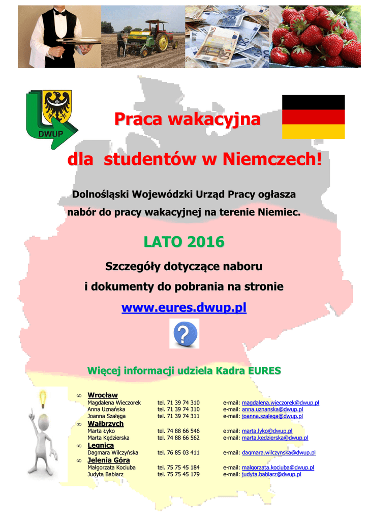 Praca wakacyjna dla studentów w Niemczech! Dolnośląski Wojewódzki Urząd Pracy ogłasza nabór do pracy wakacyjnej na terenie Niemiec. LATO 2016 Szczegóły dotyczące naboru i dokumenty do pobrania na stronie www.eures.dwup.pl Więcej informacji udziela Kadra EURES • • • • Wrocław Magdalena Wieczorek Anna Uznańska Joanna Szałęga tel. 71 39 74 310 tel. 71 39 74 310 tel. 71 39 74 311 e-mail: [email protected] e-mail: [email protected] e-mail: [email protected] tel. 74 88 66 546 tel. 74 88 66 562 e:mail: [email protected] e-mail: [email protected] tel. 76 85 03 411 e-mail: [email protected] tel. 75 75 45 184 tel. 75 75 45 179 e-mail: [email protected] e-mail: [email protected] Wałbrzych Marta Łyko Marta Kędzierska Legnica Dagmara Wilczyńska Jelenia Góra Małgorzata Kociuba Judyta Babiarz