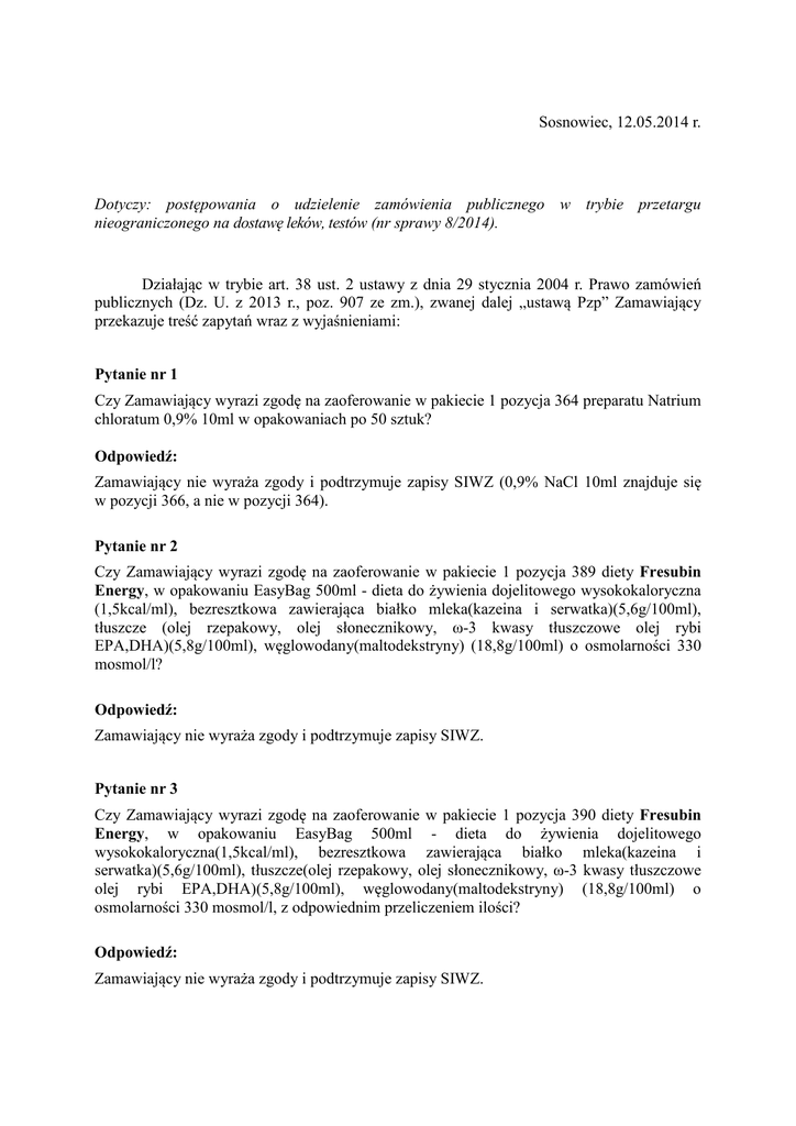 Sosnowiec, 12.05.2014 r. Dotyczy: postępowania o udzielenie zamówienia publicznego w trybie przetargu nieograniczonego na dostawę leków, testów (nr sprawy 8/2014). Działając w trybie art. 38 ust. 2 ustawy z dnia 29 stycznia 2004 r. Prawo zamówień publicznych (Dz. U. z 2013 r., poz. 907 ze zm.), zwanej dalej „ustawą Pzp” Zamawiający przekazuje treść zapytań wraz z wyjaśnieniami: Pytanie nr 1 Czy Zamawiający wyrazi zgodę na zaoferowanie w pakiecie 1 pozycja 364 preparatu Natrium chloratum 0,9% 10ml w opakowaniach po 50 sztuk? Odpowiedź: Zamawiający nie wyraża zgody i podtrzymuje zapisy SIWZ (0,9% NaCl 10ml znajduje się w pozycji 366, a nie w pozycji 364). Pytanie nr 2 Czy Zamawiający wyrazi zgodę na zaoferowanie w pakiecie 1 pozycja 389 diety Fresubin Energy, w opakowaniu EasyBag 500ml - dieta do żywienia dojelitowego wysokokaloryczna (1,5kcal/ml), bezresztkowa zawierająca białko mleka(kazeina i serwatka)(5,6g/100ml), tłuszcze (olej rzepakowy, olej słonecznikowy, ω-3 kwasy tłuszczowe olej rybi EPA,DHA)(5,8g/100ml), węglowodany(maltodekstryny) (18,8g/100ml) o osmolarności 330 mosmol/l? Odpowiedź: Zamawiający nie wyraża zgody i podtrzymuje zapisy SIWZ. Pytanie nr 3 Czy Zamawiający wyrazi zgodę na zaoferowanie w pakiecie 1 pozycja 390 diety Fresubin Energy, w opakowaniu EasyBag 500ml - dieta do żywienia dojelitowego wysokokaloryczna(1,5kcal/ml), bezresztkowa zawierająca białko mleka(kazeina i serwatka)(5,6g/100ml), tłuszcze(olej rzepakowy, olej słonecznikowy, ω-3 kwasy tłuszczowe olej rybi EPA,DHA)(5,8g/100ml), węglowodany(maltodekstryny) (18,8g/100ml) o osmolarności 330 mosmol/l, z odpowiednim przeliczeniem ilości? Odpowiedź: Zamawiający nie wyraża zgody i podtrzymuje zapisy SIWZ. Pytanie nr 4 Czy Zamawiający wyrazi zgodę na zaoferowanie w pakiecie 1 pozycja 392 diety Fresubin Energy Drink 200ml o smaku waniliowym - dieta wysokokaloryczna(1,5 kcal/ml), bezresztkowa, zawierająca białko mleka(kazeina, serwatka) (5,6g/100ml), tłuszcze (olej rzepakowy, olej słonecznikowy) (5,8g/100ml), węglowodany (maltodekstyny, cukier trzcinowy)(18,8g/100ml) o osmolarności 405 mosmol/l? Odpowiedź: Zamawiający nie wyraża zgody i podtrzymuje zapisy SIWZ. Pytanie nr 5 Czy Zamawiający wyrazi zgodę na zaoferowanie w pakiecie 1 pozycja 393 diety Frebini Orginal w opakowaniu EasyBag o objętości 500ml - kompletna dieta do żywienia dojelitowego dla dzieci od 1 do 12 roku życia, normokaloryczna (1,0 kcal/ml), bezresztkowa, zawierająca białko (z tauryną): białka mleka(2,5g100ml), tłuszcze (zawiera EPA i DHA z oleju rybiego, 20% MCT): olej rzepakowy, MCT, olej rybi (EPA, DHA)(4,4g/100ml), węglowodany: maltodekstryny(12,5g/100ml) o osmolarności 220 mosmol/l? Odpowiedź: Zamawiający nie wyraża zgody i podtrzymuje zapisy SIWZ. Pytanie nr 6 Czy Zamawiający wyrazi zgodę na zaoferowanie w pakiecie 1 pozycja 394 diety Frebini Energy Fibre w opakowaniu EasyBag o objętości 500ml - kompletna dieta do żywienia dojelitowego dla dzieci od 1 do 12 roku życia – wysokokaloryczna(1,5kcal/ml), bogatoresztkowa zawierająca białko(z tauryną) mleka (3,8g/100ml), tłuszcze (zawiera EPA i DHA z oleju rybiego, 19% MCT): olej rzepakowy, MCT, olej rybi (EPA, DHA) (6,7g/100ml), węglowodany (maltodekstryny, cukier trzcinowy) (18,7 g/100ml), błonnik(inulina-prebiotyk, celuloza, dekstryny pszenicy)(1,1g/100ml) o osmolarności 345 mosmol/l? Odpowiedź: Zamawiający nie wyraża zgody i podtrzymuje zapisy SIWZ. Pytanie nr 7 Czy Zamawiający wyrazi zgodę na zaoferowanie w pakiecie 1 pozycja 445 preparatu w opakowaniu ampułka? Odpowiedź: Zamawiający dopuszcza również. Pytanie nr 8 Czy Zamawiający wyrazi zgodę na zaoferowanie w pakiecie 5 pozycja 4, 5, 16-18, 22, opakowań KabiPac? Opakowanie KabiPac to butelka wolnostojąca, posiadająca dwa oddzielne korki poliizoprenowe, z oznakowanym zamknięciem w celu eliminacji pomyłki w trakcie użytkowania. Większy służy do przyłączenia zestawu do infuzji, mniejszy do dodania leku, zarówno przed infuzją jak i w trakcie infuzji. Jałowe korki nie wymagają dezynfekcji przed pierwszym użyciem, co zmniejsza koszty użytkowania w stosunku do innych opakowań. Po usunięciu zestawu do infuzji lub igły po dodaniu leku korki samouszczelniają się i nie ma niebezpieczeństwa wycieku płynu, co eliminuje niebezpieczeństwo skażenia otoczenia, jeśli w opakowaniu był lek toksyczny i wykonywania dodatkowych czynności przez personel. Dzięki zastosowaniu polietylenu klasy medycznej i płaskiemu kształtowi butelka samoistnie opróżnia się w trakcie infuzji bez potrzeby dodatkowego napowietrzania. Opakowanie nie wchodzi w reakcje z dodawanymi do płynów lekami. Odpowiedź: Zamawiający nie wyraża zgody i podtrzymuje zapisy SIWZ. Pytanie nr 9 Czy Zamawiający w pakiecie 5 pozycja 13, 14 wyrazi zgodę na zaoferowanie produktu leczniczego Mannitol 20% w opakowaniu szklanym? Opakowanie szklane jest znacznie bezpieczniejsze w przypadku Mannitolu, gdyż jest całkowicie przezierne, co daje możliwość zauważenia i rozpuszczenia wszystkich skrystalizowanych cząsteczek Odpowiedź: Zamawiający nie wyraża zgody i podtrzymuje zapisy SIWZ. Pytanie nr 10 Czy Zamawiający w pakiecie 5 w pozycji 30 wyrazi zgodę na zaoferowanie emulsji tłuszczowej SMOFlipid 200mg/ml – zawierającej w 1000ml olej sojowy(60,0g), tryglicerydy o średniej długości łańcucha(60,0g), olej z oliwek oczyszczony (50,0g), olej rybny bogaty w omega-3 kwasy(30,0g) w butelce 500ml do podawania również wcześniakom i dzieciom z niską urodzeniową masą ciała? Odpowiedź: Zamawiający nie wyraża zgody i podtrzymuje zapisy SIWZ. Pytanie nr 11 Czy Zamawiający wyrazi zgodę na wykreślenie z pakietu 5 pozycji 31 i 32, albowiem produkty te nie są już dostępne na rynku? Odpowiedź: Zamawiający nie wyraża zgody i podtrzymuje zapisy SIWZ. Pytanie nr 12 Czy Zamawiający w pakiecie 5 w pozycji 35 wyrazi zgodę na zaoferowanie emulsji tłuszczowe