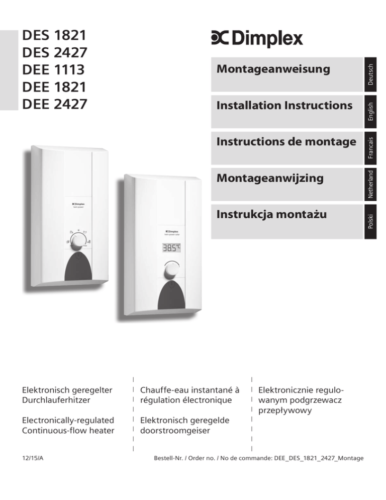 Instructions de montage Montageanwijzing Instrukcja montażu Elektronisch geregelter Durchlauferhitzer Chauffe-eau instantané à régulation électronique Electronically-regulated Continuous-flow heater Elektronisch geregelde doorstroomgeiser 12/15/A Elektronicznie regulowanym podgrzewacz przepływowy Bestell-Nr. / Order no. / No de commande: DEE_DES_1821_2427_Montage Deutsch English Francais Installation Instructions Netherland Montageanweisung Polski DES 1821 DES 2427 DEE 1113 DEE 1821 DEE 2427 DE Bestimmungsgemäßer Gebrauch Dieses Gerät ist für den Haushalt oder für haushaltsähnliche, nicht gewerbliche Anwendungen bestimmt. Haushaltsähnliche Anwendungen umfassen z. B. die Verwendung in Mitarbeiterküchen von Läden, Büros, landwirtschaftlichen und anderen gewerblichen Betrieben, sowie die Nutzung durch Gäste von Pensionen, kleinen Hotels und ähnlichen Wohneinrichtungen. Sicherheitshinweise Die Montageanleitung bitte sorgfältig durchlesen, danach handeln und aufbewahren! Bei Weitergabe des Gerätes diese Montageanleitung beilegen. ■ Das Gerät nur von einem Fachmann anschließen und in Betrieb nehmen lassen. ■ Das Gerät wie in Text und Bild beschrieben montieren und bedienen. Wir übernehmen keine Haftung für Schäden, die durch Nichtbeachtung dieser Anleitung entstehen. ■ Beiliegende Wasseranschlussstutzen unbedingt verwenden und wie im Beiblatt angegeben montieren. Sicherstellen, dass im Kaltwasserzulauf ein Rückschlagventil eingebaut wird. ■ Vorsicht: Geerdete Wasserleitungen können das Vorhandensein eines Schutzleiters vortäuschen. ■ Das Gerät muss dauerhaft an festverlegte Leitungen angeschlossen werden. Der Leitungsquerschnitt muss der zu installierenden Leistung entsprechen. ■ Zur Erfüllung der einschlägigen Sicherheitsvorschriften muss installationsseitig eine allpolige Trennvorrichtung vorhanden sein. Die Kontaktöffnung muss mindestens 3 mm betragen. ■ Das Gerät ist nur für den geschlossenen (druckfesten) Betrieb geeignet. ■ Armaturen müssen für den Betrieb mit geschlossenen (druckfesten) Durchlauferhitzern zugelassen sein. ■ Das Gerät kann an eine Kaltwasserleitung angeschlossen oder mit vorgewärmtem Wasser betrieben werden (nur bei DES). Dazu technische Daten und Sonderzubehör beachten. ■ Der spezifische Wasserwiderstand darf nicht unter 1 300 Ωcm liegen. Den Wasserwiderstand beim örtlichen Wasserversorger erfragen. ■ Das Gerät ist für den Anschluss an DVGWgeprüfte Kunststoffrohre geeignet. ■ Dieses Gerät ist für den Gebrauch bis zu einer Höhe von 2 000 m über dem Meeresspiegel bestimmt. ■ Das elektrische Anschlusskabel vor der Montage spannungslos machen und die Wasserzuleitung absperren! ■ Das Gerät nur in einem frostfreien Raum installieren und lagern (Restwasser). ■ Den Elektroanschluss erst nach dem Wasseranschluss durchführen. Stromschlaggefahr! Schalten Sie im Fehlerfall sofort die Netzspannung ab! Vor dem Öffnen des Gerätes die Stromzufuhr zum Gerät unterbrechen. Bei einer Undichtigkeit am Gerät sofort die Kaltwasserleitung schließen. ■ Die gesetzlichen Vorschriften des jeweiligen Landes, des örtlichen Elektrizitäts-Versorgungsunternehmens und des Wasserwerkes müssen eingehalten werden. ■ Der Durchlauferhitzer ist ein Gerät der Schutzklasse I und muss an den Schutzleiter angeschlossen werden. 2 ■ In der Rückwand nur die Öffnungen herstellen, die für die Montage benötigt werden. Bei erneuter Montage müssen die unbenutzten Öffnungen wasserdicht verschlossen werden. ■ Spannungsführende Teile dürfen nach der Montage nicht mehr berührbar sein. ■ Keine Scheuermittel oder anlösende Reinigungsmittel verwenden. ■ Keinen Dampfreiniger benutzen. DE Herzlichen Glückwunsch zum Kauf dieses Geräts aus unserem Hause Dimplex. Sie haben ein hochwertiges Produkt erworben, das Ihnen viel Freude bereiten wird. Montageanleitung IV. ■ Den Wasseranschluss vornehmen, anschließend die Kaltwasserzuleitung öffnen. ■ Das Gerät muss entlüftet werden. Dazu Warmwasserhahn ganz öffnen und das Gerät 1 Minute lang spülen. V. Diese Montageanleitung gilt für verschiedene Gerätemodelle. Die Darstellung kann deshalb vom gekauften Gerät abweichen. ■ Montieren Sie das Gerät wie im Bildteil beschrieben. Die Bildseiten finden Sie in der Mitte der Anleitung. Beachten Sie die Hinweise im Text. Montage I. Auspacken/Haube abnehmen ■ Gerät auspacken und auf Transportschäden kontrollieren. Liegt ein Schaden vor, Gerät nicht anschließen. ■ Lieferumfang kontrollieren: Gerät, Montagesatz mit Beiblatt, Montageanleitung, Gebrauchsanleitung. ■ Verpackung und Altgerät umweltgerecht entsorgen. ■ Beim Abnehmen der Haube beachten: Die Haube ist durch einen zentralen Verschluss hinter der Serviceklappe fixiert. Wasseranschluss Elektroanschluss/Montage ■ Nur bei Geräten mit Leistungsumschaltung: Vor Anschluss der Leitungen an die Netzanschlussklemme die Leistung mit dem Leistungsumschalter einstellen: nominale Leistung links, reduzierte Leistung rechts (Bild V., 1.) und die eingestellte Leistung am Typenschild markieren. ■ Die Leitungen an der Netzanschlussklemme festschrauben. ■ Sicherheitsbegrenzer einschalten (Bild V., 3.) ■ Haube montieren (Bild V., 4. – 7.) Installationshinweis ■ Die Installation nicht-steckerfertiger Geräte ist vom jeweiligen Netzbetreiber oder von einem eingetragenen Fachbetrieb vorzunehmen, der Ihnen auch bei der Einholung der Zustimmung des jeweiligen Netzbetreibers für die Installation des Gerätes behilflich ist. VI. Inbetriebnahme Das Gerät stimmt mit IEC 61000-3-12 überein. II. Montagevorbereitung Erstinbetriebnahme Wichtig: Nur den beiliegenden Montagesatz verwenden. Die mitgelieferten Wasseranschlussstutzen müssen unbedingt eingebaut werden! ■ Sicherungen einschalten. ■ Wasserzuleitung absperren. Der elektrische Anschluss (Anschlusskabel) muss spannungsfrei sein. Sicherungen herausdrehen oder ausschalten. ■ Startspülung: Warmwasserhahn ganz