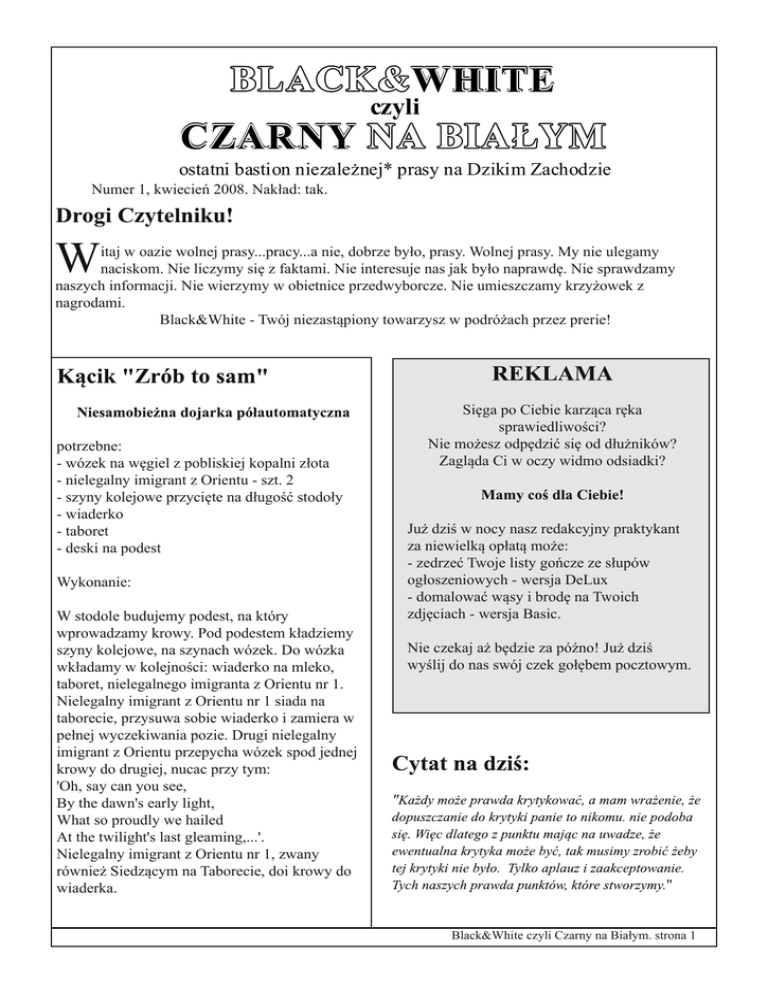 Numer 1, kwiecień 2008. Nakład: tak. W itaj w oazie wolnej prasy...pracy...a nie, dobrze było, prasy. Wolnej prasy. My nie ulegamy naciskom. Nie liczymy się z faktami. Nie interesuje nas jak było naprawdę. Nie sprawdzamy naszych informacji. Nie wierzymy w obietnice przedwyborcze. Nie umieszczamy krzyżowek z nagrodami. Black&White - Twój niezastąpiony towarzysz w podróżach przez prerie! potrzebne: - wózek na węgiel z pobliskiej kopalni złota - nielegalny imigrant z Orientu - szt. 2 - szyny kolejowe przycięte na długość stodoły - wiaderko - taboret - deski na podest Wykonanie: W stodole budujemy podest, na który wprowadzamy krowy. Pod podestem kładziemy szyny kolejowe, na szynach wózek. Do wózka wkładamy w kolejności: wiaderko na mleko, taboret, nielegalnego imigranta z Orientu nr 1. Nielegalny imigrant z Orientu nr 1 siada na taborecie, przysuwa sobie wiaderko i zamiera w pełnej wyczekiwania pozie. Drugi nielegalny imigrant z Orientu przepycha wózek spod jednej krowy do drugiej, nucac przy tym: 'Oh, say can you see, By the dawn's early light, What so proudly we hailed At the twilight's last gleaming,...'. Nielegalny imigrant z Orientu nr 1, zwany również Siedzącym na Taborecie, doi krowy do wiaderka. Sięga po Ciebie karząca ręka sprawiedliwości? Nie możesz odpędzić się od dłużników? Zagląda Ci w oczy widmo odsiadki? Już dziś w nocy nasz redakcyjny praktykant za niewielką opłatą może: - zedrzeć Twoje listy gończe ze słupów ogłoszeniowych - wersja DeLux - domalować wąsy i brodę na Twoich zdjęciach - wersja Basic. Nie czekaj aż będzie za późno! Już dziś wyślij do nas swój czek gołębem pocztowym. " Black&White czyli Czarny na Białym. strona 1 D ziś naszym gościem jest szef kuchni w restauracji "Ostatnie Życzenie'. Ze względu na możliwe pozwy o odszkodowanie za uszczerbek na zdrowiu po zjedzeniu potrawy wg poniżej zamieszczonego przepisu, postanowił nie podawać swojego imienia. Makaron z grzechotnikiem na ostro 1/4 kubka oleju 3 duże zabki czosnku, starte 1 puszka włoskich pomidorów 1 wysuszona ostra papryczka chili, starta 1 łyżeczka oregano 2 łyżeczki wysuszonej bazylii 2 łyżeczki czarnego pieprzu 1 łyżeczka soli sok z 1/2 cytryny 300g mięsa grzechotnika 600g makaronu penne Wpadłeś podczas napadu na bank? Podwinęła Ci się noga przy kradzieży krów? Najlepszy przyjaciel Cię wsypał? Bez względu na to, czy zostało Ci 10 czy 1000 dni odsiadki, nasz produkt odmieni Twoj los! Tylko pomyśl, ile rzeczy bedziesz mógł napisać na murach swojej celi naszym produktem! Koniec z mozolnym drapaniem w scianie Dusić grzechotnika w wodzie z sokiem z cytryny przez godzinę, następnie oddzielić mięso od kości. widelcem, powiedz 'nie' nudzie i monotonii. Zamów już dziś, dla stałych klientów rabaty. Zmieszać pozostałe składniki (prócz makaronu!), Przy zamówieniu powyżej 10 sztuk oscypek dodać mięso i dusić przez następne 30 minut. Ugotować makaron al dente. Podawać gdy gotowe. gratis! - pociski dum-dum do colta .45 - jak zrobić podkop w 24 godziny - przepis na zupę z kaktusa oraz wiele innych atrakcji dla całej rodziny! oferujemy: - szkalowanie konkurencji, artykuły sponsorowane, sondaże (do 100% poparcia ustalonej odgórnie tezy), czarny PR, ściemnianie, dzielenie włosa na czworo, tendencyjne pytania, recenzje nieprzeczytanych książek oraz szeroki wybór chwytów poniżej pasa. Zapytania cenowe, listy z pogróżkami, niezapłacone rachunki oraz pocztówki z wakacji prosimy kierować za pośrednictwem Poczty Farmerskiej na ręce zastępcy sekretarki kolegi młodszego brata praktykanta, na adres: Black&White czyli Czarny na Białym. strona 2 Z najdź jak najwięcej szczegółów różniących poniższe obrazki, żeby wygrać jakąś nagrodę (niewiadomo jeszcze co, ale raczej nie będzie to warte tego całego czasu, jaki poświęcisz na szukanie tych szczególików). Nie wiadomo tak naprawdę ile ich jest, bo nasz redakcyjny grafik wiedział ale nie powiedział, a to było tak: Black&White czyli Czarny na Białym. strona 3