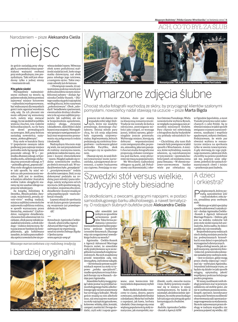 Magazyn RodzinnyPolska | Polska Gazeta Wrocławska | 21 kwietnia 2012 | 5 Gazeta Wrocławska | 21–22 www.gazetawroclawska.pl ACH, CO TO BYŁ ZA ŚLUB Narodzeniem – pisze Aleksandra Cieśla Kto gdzie siedzi Niewątpliwie najważniejszymi osobami na weselu są państwomłodzi,którzypowinni zajmować miejsce honorowe – najbardziej wyeksponowane, być widocznymi dla wszystkich gości i móc ogarniać wzrokiem całą salę. Za ich plecami nie może odbywać się wzmożony ruch, należy więc zwracać uwagę,byniesiedzieliwpobliżu wyjścia z kuchni, tzw. traktów komunikacyjnych, na tle baru czy drzwi prowadzących na zewnątrz. Stół, przy którym zasiadają nowożeńcy, nazywamy „stołem głównym”. Przy stole w kształcie litery U (popularnie zwanym także podkową) para zajmuje miejsce pośrodku stołu łączącego dwie pozostałe odnogi. W L – pośrodku dłuższej odnogi, w E pośrodkustołu,odktóregoodchodzą trzy pozostałe odnogi, w T –pośrodkugórnej„poprzeczki”. Przy stole okrągłym natomiast w taki sposób, by mieć widok na całe pomieszczenie weselne. Jeśli jest to możliwe, w każdym układzie i kształcie stołów (także okrągłych) staramy się nie usadzać nikogo naprzeciw młodej pary. Za książką Zdzisława K. Dembka „Wesele polskie. Zwyczaje, wyjaśnienia, porady, savoir-vivre” według tradycji, miejsca najbliżej nowożeńców zajmowała najbliższa rodzina, w sposób wyznaczany przez hierarchię„ważności”.Czylirodzice, następnie dziadkowie, chrzestni(lubodwrotnie)itd.Co ciekawe,obokpannymłodejzasiadalijejteściowie,aobokmłodego – rodzice dziewczyny. Sytuacja jeszcze bardziej się komplikowała, gdy hołdowano zasadzie,żeżadnaparamałżeńskaoprócznowożeńcówniepo- Izabela i Tomasz – sesja w plenerze Wymarzone zdjęcia ślubne Chociaż studia fotografii wychodzą ze skóry, by przyciągnąć klientów szalonymi pomysłami, nowożeńcy nadal stawiają na uczucie – pisze Marta Bigda eszcze nie tak dawno nie wypadało robić zdjęć ślubnych, które nie miałyby poważnego, dostojnego charakteru. Dzisiaj młode pary chcą, by ich sesja zdjęciowa była naprawdę niepowtarzalna. Stąd wyzwania, których podejmują się niektórzy fotografowie – nurkowanie gdzieś pośrodku Pacyfiku, skok na bungee czy ze spadochronem. Okazuje się też, że sesji ślubnej towarzyszyć może narzeczeńska, z przygotowań do ceremonii, a nawet buduarowa czy ciążowa. Pomijając te sza- J leństwa, dużo par stawia na klasyczną romantyczność. Tradycje nie zostały do końca odrzucone, postrzeganie miłości jako czegoś, co wymaga jasnej, lekkiej oprawy, gdzieniegdzie jeszcze pozostało. Wybierając miejsce, kierują się dobrymi wspomnieniami z nim związanymi albo, po prostu, atmosferą, jaka tam panuje. I chociaż studia fotograficzne proponują ciekawe rozwiązania pod dachem, sesje plenerowe nie tracą na popularności. We Wrocławiu najbardziej oblegane są parki, jak Południowy czy Staromiejski, i oko- w Ogrodzie Japońskim, a most Tumski przeżywa nalot zakochanych z całej Polski. Są to również miejsca w jakiś sposób związane z naszym narzeczeństwem, randkami i wspólnie spędzonymi, miłymi chwilami. Podejrzewam, że wiele par również wybiera te romantyczne miejsca na spotkania tylko w swoim towarzystwie. A gdy dotrwają do tego pięknego momentu, jakim jest ślub, chcieliby na pewno podobnie jak my, poprzez sesje zdjęciowe, powrócić do tamtych romantycznych chwil i miejsc – przekonuje pani Izabela. lice Ostrowa Tumskiego. Wielu nowożeńców wybiera Rynek, ze względu na panującą tam atmosferę minionych wieków. Pary chętnie też odwiedzają z fotografem dachy budynków czy pokłady odrzańskich barek. – Chcieliśmy, aby nasz ślub i wesele były powiązane w jakiś sposób z Wrocławiem. A miejsca, które wybraliśmy, naszym zdaniem, są najciekawszymi w tym mieście – opowiada Izabela Gaweł, od niedawna żona pana Tomasza. – W okresie majowo-czerwcowym bardzo wiele par oświadcza się A dzieci i orkiestra? Szwedzki stół versus wielkie, tradycyjne stoły biesiadne ufet szwedzki jest jednymzesposobów serwowania posiłków. Taka forma podawania i prezentowaniajedzeniajestbardzopopularna podczas bankietów i eventów firmowych. Dlaczego więc nie zorganizować szwedzkiego bufetu na weselu? Agnieszka Ćwikła-Suszek z Agencji Advanced Marriage Projects mówi, że szwedzkie stoły praktykowane są w szczególnościnaweselachmiędzynarodowych. Na nich znajdziemy przede wszystkim całą tzw. zimnąpłytę,czylizimnezakąski. –Serwowaniepotrawnapółmiskach wprost na stoły to typowo „polska specjalność”, rzadkospotykanawinnychkrajachEuropyczywStanach–dodaje pani Agnieszka. Szwedzkiebufetymogąprzyjąć także postać na przykład samoobsługowego barku alkoholowego(gdyniejestaranżowany bar serwujący koktajle). Wtedy goście znajdą na nim alkohole inne, niż zwyczajowo stawiane na stoły najczęściej gatunkowe, kolorowe:whisky,dżin,koniaki, campari,martiniitd.Dotegododatki, czyli soki i napoje gazo- B Waszego narzeczeństwa czy rodzinną tradycją FOT.123RF i bardziej oryginalni Szwedzki bufet to nowoczesne podejście do serwowania posiłków wane, oraz koniecznie lód. Ioczywiściedopasowanywybór szkła. Bufetsłodkilubsłodko-owocowy to ciasta, desery, patery zowocami,czekoladowefondue zdodatkami.Możebyćteżbufet z napojami, jak kawa, herbata idodatki.Orazcieszącesięcoraz większąpopularnościąstołytematyczne, jak staropolski, my- śliwski, sushi, owoców morza i inne. Bufety powinny znajdować się w miejscu w miarę wyeksponowym, by każdy je zauważył,alejednocześnie spokojnym,byosobyprzechodzące lub tańczące nie potrącały gości korzystających z bufetów. AJC Radziła: Agnieszka Ćwikła-Suszek z Agencji ADM odopiecznych, którzy potrafią samodzielnie jeść –czyliodokoło6.rokużycia, posadźmy przy osobnym stole. – Można go w jakiś specjalny sposóbudekorować