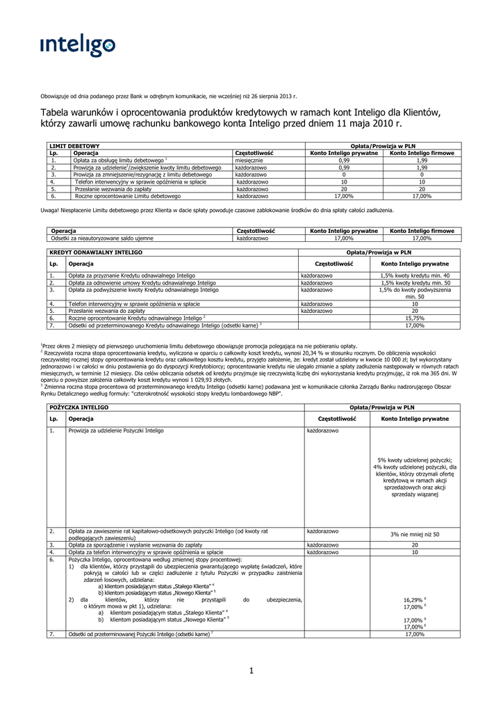 Obowiązuje od dnia podanego przez Bank w odrębnym komunikacie, nie wcześniej niż 26 sierpnia 2013 r. Tabela warunków i oprocentowania produktów kredytowych w ramach kont Inteligo dla Klientów, którzy zawarli umowę rachunku bankowego konta Inteligo przed dniem 11 maja 2010 r. LIMIT DEBETOWY Lp. Operacja 1. Opłata za obsługę limitu debetowego 1 2. Prowizja za udzielenie1/zwiększenie kwoty limitu debetowego 3. Prowizja za zmniejszenie/rezygnację z limitu debetowego 4. Telefon interwencyjny w sprawie opóźnienia w spłacie 5. Przesłanie wezwania do zapłaty 6. Roczne oprocentowanie Limitu debetowego Częstotliwość miesięcznie każdorazowo każdorazowo każdorazowo każdorazowo każdorazowo Opłata/Prowizja w PLN Konto Inteligo prywatne Konto Inteligo firmowe 0,99 1,99 0,99 1,99 0 0 10 10 20 20 17,00% 17,00% Uwaga! Niespłacenie Limitu debetowego przez Klienta w dacie spłaty powoduje czasowe zablokowanie środków do dnia spłaty całości zadłużenia. Operacja Odsetki za nieautoryzowane saldo ujemne Częstotliwość każdorazowo Konto Inteligo prywatne 17,00% KREDYT ODNAWIALNY INTELIGO Konto Inteligo firmowe 17,00% Opłata/Prowizja w PLN Lp. Operacja Częstotliwość 1. 2. 3. Opłata za przyznanie Kredytu odnawialnego Inteligo Opłata za odnowienie umowy Kredytu odnawialnego Inteligo Opłata za podwyższenie kwoty Kredytu odnawialnego Inteligo każdorazowo każdorazowo każdorazowo 4. 5. 6. 7. Telefon interwencyjny w sprawie opóźnienia w spłacie Przesłanie wezwania do zapłaty Roczne oprocentowanie Kredytu odnawialnego Inteligo 2 Odsetki od przeterminowanego Kredytu odnawialnego Inteligo (odsetki karne) każdorazowo każdorazowo Konto Inteligo prywatne 1,5% kwoty kredytu min. 40 1,5% kwoty kredytu min. 50 1,5% do kwoty podwyższenia min. 50 10 20 15,75% 17,00% 3 1 Przez okres 2 miesięcy od pierwszego uruchomienia limitu debetowego obowiązuje promocja polegająca na nie pobieraniu opłaty. Rzeczywista roczna stopa oprocentowania kredytu, wyliczona w oparciu o całkowity koszt kredytu, wynosi 20,34 % w stosunku rocznym. Do obliczenia wysokości rzeczywistej rocznej stopy oprocentowania kredytu oraz całkowitego kosztu kredytu, przyjęto założenie, że: kredyt został udzielony w kwocie 10 000 zł; był wykorzystany jednorazowo i w całości w dniu postawienia go do dyspozycji Kredytobiorcy; oprocentowanie kredytu nie ulegało zmianie a spłaty zadłużenia następowały w równych ratach miesięcznych, w terminie 12 miesięcy. Dla celów obliczania odsetek od kredytu przyjmuje się rzeczywistą liczbę dni wykorzystania kredytu przyjmując, iż rok ma 365 dni. W oparciu o powyższe założenia całkowity koszt kredytu wynosi 1 029,93 złotych. 3 Zmienna roczna stopa procentowa od przeterminowanego kredytu Inteligo (odsetki karne) podawana jest w komunikacie członka Zarządu Banku nadzorującego Obszar Rynku Detalicznego według formuły: "czterokrotność wysokości stopy kredytu lombardowego NBP". 2 POŻYCZKA INTELIGO Lp. Operacja 1. Prowizja za udzielenie Pożyczki Inteligo Opłata/Prowizja w PLN Częstotliwość Konto Inteligo prywatne każdorazowo 5% kwoty udzielonej pożyczki; 4% kwoty udzielonej pożyczki, dla klientów, którzy otrzymali ofertę kredytową w ramach akcji sprzedażowych oraz akcji sprzedaży wiązanej 2. 3. 4. 6. 7. Opłata za zawieszenie rat kapitałowo-odsetkowych pożyczki Inteligo (od kwoty rat każdorazowo podlegających zawieszeniu) Opłata za sporządzenie i wysłanie wezwania do zapłaty każdorazowo Opłata za telefon interwencyjny w sprawie opóźnienia w spłacie każdorazowo Pożyczka Inteligo, oprocentowana według zmiennej stopy procentowej: 1) dla klientów, którzy przystąpili do ubezpieczenia gwarantującego wypłatę świadczeń, które pokryją w całości lub w części zadłużenie z tytułu Pożyczki w przypadku zaistnienia zdarzeń losowych, udzielana: a) klientom posiadającym status „Stałego Klienta” 4 b) klientom posiadającym status „Nowego Klienta” 5 2) dla klientów, którzy nie przystąpili do ubezpieczenia, o którym mowa w pkt 1), udzielana: a) klientom posiadającym status „Stałego Klienta” 4 b) klientom posiadającym status „Nowego Klienta” 5 Odsetki od przeterminowanej Pożyczki Inteligo (odsetki karne) 7 1 3% nie mniej niż 50 20 10 16,29% 17,00% 6 6 17,00% 6 17,00% 6 17,00% 4 Stały Klient” – osoba fizyczna spełniająca co najmniej jeden z następujących warunków: 1) posiada rachunek oszczędnościowo-rozliczeniowy (ROR) w PKO BP SA od co najmniej 6 miesięcy, na który dokonywane były systematyczne wpływy i nie wystąpiły niedopuszczalne salda debetowe w tym okresie, 2) posiada pozytywną historię kredytową w PKO BP SA ustaloną na podstawie raportu kredytowego, w przypadku kredytów/pożyczek regularnie spłaconych i od dnia całkowitej spłaty upłynęło nie więcej niż 18 miesięcy, 3) posiada pozytywną historię kredytową w PKO BP SA ustaloną na podstawie raportu kredytowego, w przypadku kredytów/pożyczek aktualnie i regularnie spłacanych, znajdujących się w spłacie od co najmniej 12 miesięcy licząc od daty spłaty pierwszej raty kapitałowo odsetkowej. 5 „Nowy Klient” – klient nie spełniający żadnego z warunków dla „Stałego Klienta”. 6 Przykładowa rzeczywista roczna stopa oprocentowania pożyczki, wyliczona w oparciu o całkowity koszt pożyczki, wynosi 24,80% w stosunku rocznym. Do obliczenia wysokości rzeczywistej rocznej stopy oprocentowania pożyczki oraz całkowitego kosztu pożyczki, przyjęto następujące założenia: pożyczka udzielana jest klientom posiadającym status „Stałego Klienta”; Klienci nie przystąpili do ubezpieczenia gwarantującego wypłatę świadczeń, które pokryją w całości lub w części zadłużenie z tytułu pożyczki w przypadku zaistnienia zdarzeń losowych; udzielana kwota pożyczki 5 000 zł; prowizja za udzielenie pożyczki wyniosła 5%; oprocentowanie pożyczki nie ulegało zmianie a spłaty za