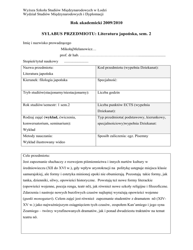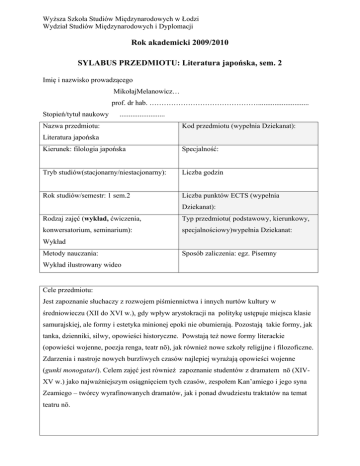 Wyższa Szkoła Studiów Międzynarodowych w Łodzi Wydział Studiów Międzynarodowych i Dyplomacji Rok akademicki 2009/2010 SYLABUS PRZEDMIOTU: Literatura japońska, sem. 2 Imię i nazwisko prowadzącego MikołajMelanowicz… prof. dr hab. ………………………………………............................ Stopień/tytuł naukowy ......................... Nazwa przedmiotu: Kod przedmiotu (wypełnia Dziekanat): Literatura japońska Kierunek: filologia japońska Specjalność: Tryb studiów(stacjonarny/niestacjonarny): Liczba godzin Rok studiów/semestr: 1 sem.2 Liczba punktów ECTS (wypełnia Dziekanat): Rodzaj zajęć (wykład, ćwiczenia, Typ przedmiotu( podstawowy, kierunkowy, konwersatorium, seminarium): specjalnościowy)wypełnia Dziekanat: Wykład Metody nauczania: Sposób zaliczenia: egz. Pisemny Wykład ilustrowany wideo Cele przedmiotu: Jest zapoznanie słuchaczy z rozwojem piśmiennictwa i innych nurtów kultury w średniowieczu (XII do XVI w.), gdy wpływ arystokracji na politykę ustępuje miejsca klasie samurajskiej, ale formy i estetyka minionej epoki nie obumierają. Pozostają takie formy, jak tanka, dzienniki, silwy, opowieści historyczne. Powstają też nowe formy literackie (opowieści wojenne, poezja renga, teatr nō), jak również nowe szkoły religijne i filozoficzne. Zdarzenia i nastroje nowych burzliwych czasów najlepiej wyrażają opowieści wojenne (gunki monogatari). Celem zajęć jest również zapoznanie studentów z dramatem nō (XIVXV w.) jako najważniejszym osiągnięciem tych czasów, zespołem Kan’amiego i jego syna Zeamiego – twórcy wyrafinowanych dramatów, jak i ponad dwudziestu traktatów na temat teatru nō. Zakładane efekty kształcenia (jakie kompetencje i umiejętności nabędzie uczestnik wykładów/ćwiczeń?): Studenci poznają warunki kształtowania się literatury średniowiecznej Japonii, spisanej w nowym stylu języka nasyconego słownictwem chińskim i buddyjskim. n TREŚCI PROGRAMOWE Nr 1. Temat zajęć Zakres prezentowanych treści Charakterystyka epoki i Formy literackie. Naśladowanie kształtowania się arystokracji dworskiej. Prądy religijne: średniowiecznej kultury amidyzm (Hōnen, Shinran), nichirenizm samurajskiej (rycerskiej) (Nichiren), zen (Eisai, Dōgen), sintoizm, tendencje synkretyczne 2. Opowieści o wojnach Heike monogatari (Opowieść o Heike, między Tairami i ok.1221), Taiheiki (Kronika wielkiego Minamotami oraz między pokoju, ok.1371), Soga monogatari wojskami dynastii (Opowieść o Soga, XIIIw.), Gikeiki „południa” i siogunatu (Kronika Yoshitsune, XV w. ) Ashikagi („pólnoc”) 3. Dzienniki i silwy, Izayoi nikki (Dziennik szesnastej nocy, literatura wędrowców i ok.1282) mniszki Abutsu, Towazugatari eremitów (Mówię niepytana, ok.1306-1313) damy Nijō no Tsubone), Hōjōki (Zapiski z szałasu, 1212) Kamo no Chōmeia, Tsurezuregusa (Szkice z wolnych chwil, 1330) Yoshidy Kenkō 4. Opowiadania Ujishūi monogatari (Pokłosie z Uji, 1218- anegdotyczne i baśnie, 1221), Kokon chomonjū ( Zbiór opisy podróży, bajki zasłyszanych opowiadań dawnych i Liczba godzin otogizōshi dzisiejszych, 1254), Jikkinshō (Wybór dziesięciu pouczeń, 1252), Shasekishū (Zbiór piasku i kamieni, 1249-1256, Kaidōki (Kronika drogi nadmorskiej, 1223-1233), Tōkan kikō (Zapiski z podróży na wschód od bariery, 1242) 5. Poezja średniowiecza: Shinkokinshū (Nowy zbiór pieśni klasycyzm (XI-poł. XIII dawnych i współczesnych, 1205). w.). Koncepcje yūgen Najwybitniejsi poeci XII-go w.: Saigyō (tajemna głębia), michi (1118-1190) , Fujiwara Shunzei (1114- (Droga) 1204), Fujiwara Teika (1162-1241), cesarz Gotoba (pan.1184-1198). Ogura Późny klasycyzm XIII- hyakunin isshu (Po jednym wierszu stu XIX: Kyōgoku poetów z Ogury, ?1235) Tamekane 6. Powstanie i budowa Nijō Yoshimoto (1320-1388), Gusai pieśni łączonych renga i (1284-1378) i Tsukubashū (Zbiór haikai renga Tsukuba, 1356), Shinkei (1406-1475) – Sasamegoto (Szepty, 1463), Sōgi redaktor Shinsen Tsukubashū (Nowy wybór Zbioru Tsukuba). Shōgi, Shōhaku i Sōchō - Minase sangin hyakuin (Sto strof trzech poetów w Minase, 1488) 7. Teatr średniowiecza. Obrzędy, tańce i muzyka kagura, Powstanie i rozwój od widowiska i maski gigaku. Tańce i obrzędów kagura do muzyka dworska bugaku i gagaku, widowisk sarugaku „rozmaite sztuki” sangaku, „małpia muzyka” sarugaku i “polna muzyka” dengaku, „szalone słowa” / farsy kyōgen 8. Charakterystyka teatru nō Przestrzeń sceniczna, aktorzy – chór – muzycy (shite, waki, jiutai, hayashi), Typizacja ruchów scenicznych (kata), dramaty (yōkyoku), maski (men, kamen, omote), rekwizyty, kostiumy 9. Aktorzy i dramaturdzy Kan’ami (1333-1383), Zeami (1363-1443) 10. nō – biografie, twórczość dramatyczna Podział dramatów na 1. Dramaty o bogach, 2. o wojownikach, grupy (kategorie) i opis 3. o kobietach, 4. o bohaterach z dawnych wybranych sztuk opowieści (a także o kobietach szalonych i innych osobach targanych namiętnościami), 5. o demonach i innych istotach nadnaturalnych. 11. Pisma teoretyczne Fūshikaden (O przekazywaniu Stylu, Zeamiego Kształtu i Kwiatu, 1400), Sandō (TrzyDrogi, 1423), Kyūi (Dziewięć stopni, ok. 1424). Koncepcja teatralna w Sarugakudangi (Rozmowy o sarugaku, 1430). Yūgen i monomane. Zainteresowanie bohaterem po śmierci. 12. 13. Wojny o zjednoczenie Bajki otogizōshi i literatura przełomu kraju. Broń palna z wieków XVI i XVII. Kres tradycji Europy. Dwa arystokratycznej i popularyzacja gustów symboliczne pawilony plebejskich. Narodziny haikai. Kultura (Kinkakuji, Ginkakuji) Południowych Barbarzyńców Kanony Yūgen (tajemna głebia), wabi (poczucie średniowiecznego piękna niedostatku), sabi (starzenie się, osamotnienie), yōen (zmysłowy czar), ushin („mieć serce”, uczuciowość), mushin („bez serca”, brak uczucia, brak subtelności) 14. 15. Zalecana literatura: I. Literatura podstawowa (maksymalnie 3-4 pozycje): 1. W. Kotański, Dzie