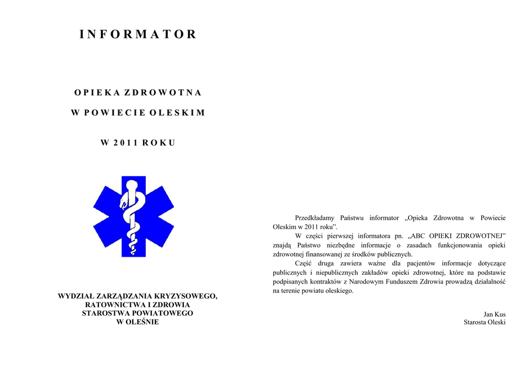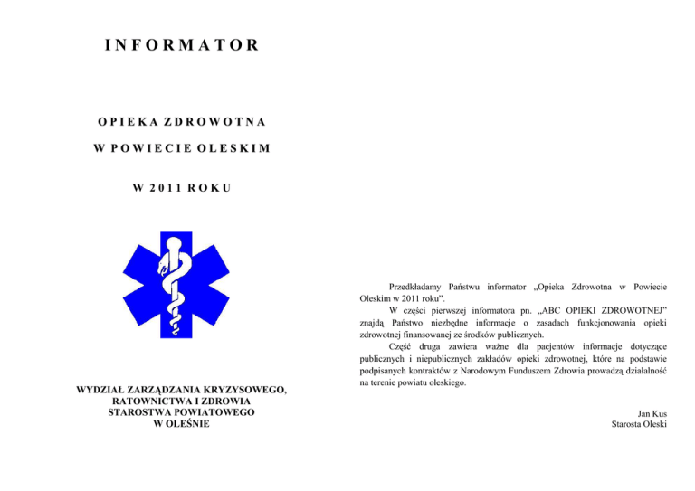 INFORMATOR OPIEKA ZDROWOTNA W POWIECIE OLESKIM W 2011 ROKU WYDZIAŁ ZARZĄDZANIA KRYZYSOWEGO, RATOWNICTWA I ZDROWIA STAROSTWA POWIATOWEGO W OLEŚNIE Przedkładamy Państwu informator „Opieka Zdrowotna w Powiecie Oleskim w 2011 roku”. W części pierwszej informatora pn. „ABC OPIEKI ZDROWOTNEJ” znajdą Państwo niezbędne informacje o zasadach funkcjonowania opieki zdrowotnej finansowanej ze środków publicznych. Część druga zawiera ważne dla pacjentów informacje dotyczące publicznych i niepublicznych zakładów opieki zdrowotnej, które na podstawie podpisanych kontraktów z Narodowym Funduszem Zdrowia prowadzą działalność na terenie powiatu oleskiego. Jan Kus Starosta Oleski I. ABC OPIEKI ZDROWOTNEJ Opracowano na podstawie materiałów opublikowanych przez Opolski Oddział Wojewódzki Narodowego Funduszu Zdrowia (źródło: www.nfz-opole.pl) INFORMACJE OGÓLNE 1. Dokumenty potwierdzające prawo do świadczeń opieki zdrowotnej Osoba ubiegająca się o udzielenie świadczenia opieki zdrowotnej finansowanego ze środków publicznych zobowiązana jest przedstawić dowód potwierdzający prawo do jego uzyskania. Dokumentami potwierdzającymi ubezpieczenie zdrowotne w Narodowym Funduszu Zdrowia są m.in.: dla osoby zatrudnionej na podstawie umowy o pracę: druk zgłoszenia do ubezpieczenia zdrowotnego oraz aktualnie potwierdzony raport miesięczny ZUS RMUA wydany przez pracodawcę (nie dotyczy osób na urlopie bezpłatnym powyżej 30 dni) aktualne zaświadczenie z zakładu pracy legitymacja ubezpieczeniowa z aktualną datą i pieczątką pracodawcy dla osoby prowadzącej działalność gospodarczą: druk zgłoszenia do ubezpieczenia zdrowotnego oraz aktualny dowód wpłaty składki na ubezpieczenie zdrowotne dla osoby ubezpieczonej w KRUS: zaświadczenie lub legitymacja aktualnie podstemplowana przez KRUS (dowód wpłaty w przypadku prowadzenia działów specjalnych produkcji rolnej) dla emerytów i rencistów: legitymacja emeryta/rencisty (w przypadku legitymacji wydanej przez ZUS powinna zawierać oznaczenie oddziału wojewódzkiego NFZ 3 i 4 cyfra numeru legitymacji) zaświadczenie z ZUS lub KRUS (WBE, ZER MSWiA) aktualny odcinek emerytury lub renty (obecnie ZUS wydaje 1 raz w roku) zgodnie z art. 240 ust 2 może być to wyciąg (ale ze wskazaniem w tytule przelewu kwoty potrąconej składki i kodu oddziału NFZ) dla osoby zarejestrowanej jako bezrobotna: aktualne zaświadczenie z Urzędu Pracy o zgłoszeniu do ubezpieczenia zdrowotnego dla osoby dobrowolnie ubezpieczonej: umowa zawarta z NFZ i dokument ZUS potwierdzający zgłoszenie do ubezpieczenia zdrowotnego wraz z aktualnym dowodem opłacenia składki zdrowotnej dla członka rodziny ubezpieczonego: dowód opłacenia składki przez głównego płatnika oraz dowód zgłoszenia do ubezpieczenia członka rodziny (np. druki: ZUS RMUA + ZUS ZCZA lub ZUS ZCNA) legitymacja rodzinna z aktualną datą i pieczątką zakładu pracy aktualne zaświadczenie wydane przez pracodawcę legitymacja emeryta/rencisty z wpisanymi członkami rodziny podlegającymi ubezpieczeniu, potwierdzająca dokonanie zgłoszenia w dniu 1 stycznia 1999 roku lub później, wraz z aktualnym odcinkiem wypłaty świadczenia (dotyczy tylko KRUS, w pozostałych przypadkach płatnik wydaje zaświadczenia o członkach rodziny zgłoszonych do ubezpieczenia zdrowotnego) dla uczniów i studentów: dokumenty jak dla innych członków rodziny oraz aktualna legitymacja uczniowska lub studencka (dla osób po 18 roku życia). Ponadto uprawnienia do korzystania ze świadczeń mają także inne osoby, za okazaniem m.in. następujących dokumentów: osoby spełniające kryteria dochodowe, o których mowa w art. 8 ustawy z dnia 12 marca 2004 r. o pomocy społecznej: decyzja wójta, burmistrza, prezydenta osoby uprawnione do świadczeń na podstawie przepisów o koordynacji: poświadczenie wydane przez NFZ (w przypadku zamieszkiwania na terenie RP) EKUZ (lub certyfikat tymczasowo zastępujący EKUZ) wydana przez inny niż Polska kraj członkowski UE lub EFTA. Brak dokumentu potwierdzającego uprawnienia do świadczeń opieki zdrowotnej zazwyczaj może być powodem odmowy udzielenia świadczenia albo przyczyną obciążenia pacjenta kosztami leczenia. Od tej reguły jest jednak bardzo ważny wyjątek: w stanie nagłym pomoc musi być udzielona, a dokument potwierdzający ubezpieczenie może zostać przedstawiony: jeśli pacjent przebywa w szpitalu, to nie później niż w 30 dni od dnia rozpoczęcia udzielania świadczenia lub w ciągu 7 dni od dnia zakończenia udzielania świadczenia opieki zdrowotnej. Niedostarczenie dokumentu w wyżej wymienionych terminach skutkuje obciążeniem pacjenta kosztami udzielonych świadczeń opieki zdrowotnej. 2. Prawo do świadczeń opieki zdrowotnej po wygaśnięciu obowiązku ubezpieczenia zdrowotnego Prawo do świadczeń opieki zdrowotnej finansowanych ze środków publicznych przysługuje osobom zgłoszonym do ubezpieczenia za pośrednictwem ZUS lub KRUS w związku z: podleganiem obowiązkowi ubezpieczenia zdrowotnego (np. zatrudnienie, prowadzenie gospodarstwa rolnego lub pozarolniczej działalności gospodarczej) zawarciem z Oddziałem Funduszu umowy dobrowolnego ubezpieczenia zdrowotnego posiadaniem statusu członka rodziny osoby ubezpieczonej. Członkiem rodziny w świetle przepisów ustawy o świadczeniach opieki zdrowotnej finansowanych ze środków publicznych jest: dziecko własne, dziecko małżonka, dziecko przysposobione, wnuka albo dziecko obce, dla którego ustanowiono opiekę, albo dziecko obce w ramach rodziny zastępczej, do ukończenia przez nie 18 lat (jeżeli kształci się dalej - do ukończenia 26 lat, natomiast jeżeli posiada orzeczenie o znacznym stopniu niepełnosprawności lub inne traktowane na równi - bez ograniczenia wieku) małżonek krewny wstępny pozostający z ubezpieczonym we wspólnym gospodarstwie domowym. W praktyce ważne jest zatem, aby mieć pewność, że płatnik składki dokonał stosowneg