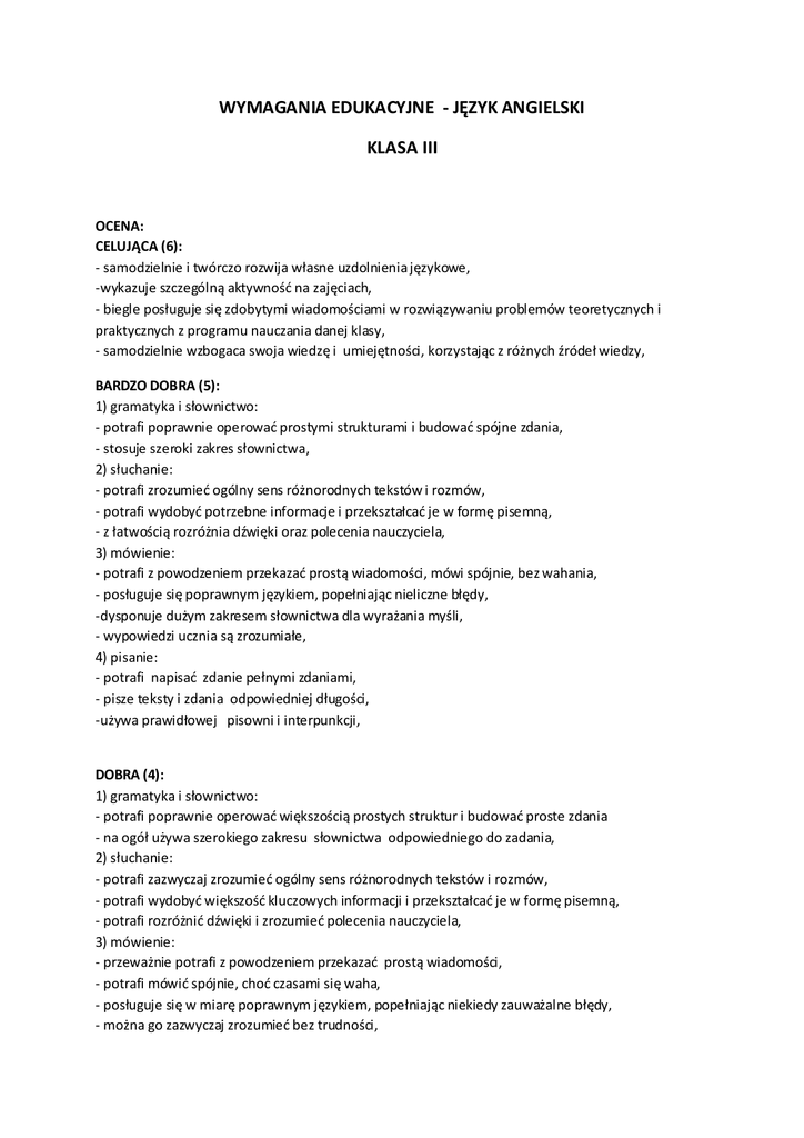 WYMAGANIA EDUKACYJNE - JĘZYK ANGIELSKI KLASA III OCENA: CELUJĄCA (6): - samodzielnie i twórczo rozwija własne uzdolnienia językowe, -wykazuje szczególną aktywność na zajęciach, - biegle posługuje się zdobytymi wiadomościami w rozwiązywaniu problemów teoretycznych i praktycznych z programu nauczania danej klasy, - samodzielnie wzbogaca swoja wiedzę i umiejętności, korzystając z różnych źródeł wiedzy, BARDZO DOBRA (5): 1) gramatyka i słownictwo: - potrafi poprawnie operować prostymi strukturami i budować spójne zdania, - stosuje szeroki zakres słownictwa, 2) słuchanie: - potrafi zrozumieć ogólny sens różnorodnych tekstów i rozmów, - potrafi wydobyć potrzebne informacje i przekształcać je w formę pisemną, - z łatwością rozróżnia dźwięki oraz polecenia nauczyciela, 3) mówienie: - potrafi z powodzeniem przekazać prostą wiadomości, mówi spójnie, bez wahania, - posługuje się poprawnym językiem, popełniając nieliczne błędy, -dysponuje dużym zakresem słownictwa dla wyrażania myśli, - wypowiedzi ucznia są zrozumiałe, 4) pisanie: - potrafi napisać zdanie pełnymi zdaniami, - pisze teksty i zdania odpowiedniej długości, -używa prawidłowej pisowni i interpunkcji, DOBRA (4): 1) gramatyka i słownictwo: - potrafi poprawnie operować większością prostych struktur i budować proste zdania - na ogół używa szerokiego zakresu słownictwa odpowiedniego do zadania, 2) słuchanie: - potrafi zazwyczaj zrozumieć ogólny sens różnorodnych tekstów i rozmów, - potrafi wydobyć większość kluczowych informacji i przekształcać je w formę pisemną, - potrafi rozróżnić dźwięki i zrozumieć polecenia nauczyciela, 3) mówienie: - przeważnie potrafi z powodzeniem przekazać prostą wiadomości, - potrafi mówić spójnie, choć czasami się waha, - posługuje się w miarę poprawnym językiem, popełniając niekiedy zauważalne błędy, - można go zazwyczaj zrozumieć bez trudności, 4) pisanie: - potrafi na ogół napisać zadanie zawierające pełne zdania, proste struktury i słownictwo, - pisze zdania na ogół dobrze zbudowane i spójne, - używa przeważnie prawidłowej pisowni i interpunkcji, DOSTATECZNA (3): 1) gramatyka i słownictwo: - potrafi poprawnie operować niektórymi prostymi strukturami oraz budować niekiedy spójne zdania; - czasami używa zakresu słownictwa odpowiedniego do zdania; 2) słuchanie: - potrafi zazwyczaj zrozumieć ogólny sens prostych tekstów i rozmów; - potrafi zrozumieć część kluczowych informacji w różnorodnych tekstach; - potrafi rozróżnić większość dźwięków; - rozumie polecenia nauczyciela; 3) mówienie: - czasem potrafi przekazać wiadomości; - potrafi mówić spójnie, ale z wyraźnym wahaniem; - posługuje się częściowo poprawnym językiem, ale popełnia sporo zauważalnych błędów; - dysponuje ograniczonym zakresem słownictwa; - ucznia można zazwyczaj zrozumieć; 4) pisanie: - próbuje napisać zadanie zawierające proste zdania; - w zadaniu pisemnym robi zauważalne błędy; DOPUSZCZAJĄCA (2): 1) gramatyka i słownictwo: - potrafi poprawnie operować niedużą ilością prostych struktur; - buduje zdania, ale przeważnie niespójne; - dysponuje niewielkim zakresem słownictwa; 2) słuchanie: - potrafi od czasu do czasu zrozumieć ogólny sens prostych tekstów i rozmów; - potrafi wydobyć niedużą ilość potrzebnych informacji oraz niektóre dźwięki; - potrzebuje pomocy lub podpowiedzi przy rozumieniu poleceń; 3) mówienie: - czasem potrafi przekazać wiadomość, ale z trudnościami; - mówi z częstym wahaniem; - przy posługiwaniu się językiem popełnia wiele zauważalnych błędów; - trudno ucznia zrozumieć; 4) pisanie: - ma trudności z napisaniem prostych zdań, w zdaniu pisemnym robi dużo istotnych błędów; NIEDOSTATECZNA (1): - uczeń nie opanował podstawowych wiadomości i umiejętności; - nie zrozumie sensu prostych tekstów, nie potrafi sam przekazać wiadomości oraz poprawnie pisać. W przypadku uczniów ze specyficznymi trudnościami w czytaniu i pisaniu l ub ze stwierdzonymi deficytami rozwojowymi stosuje się obniżone wymagania, uwzględniając zalecenia zawarte w opinii pedagogicznej, psychologicznej.
