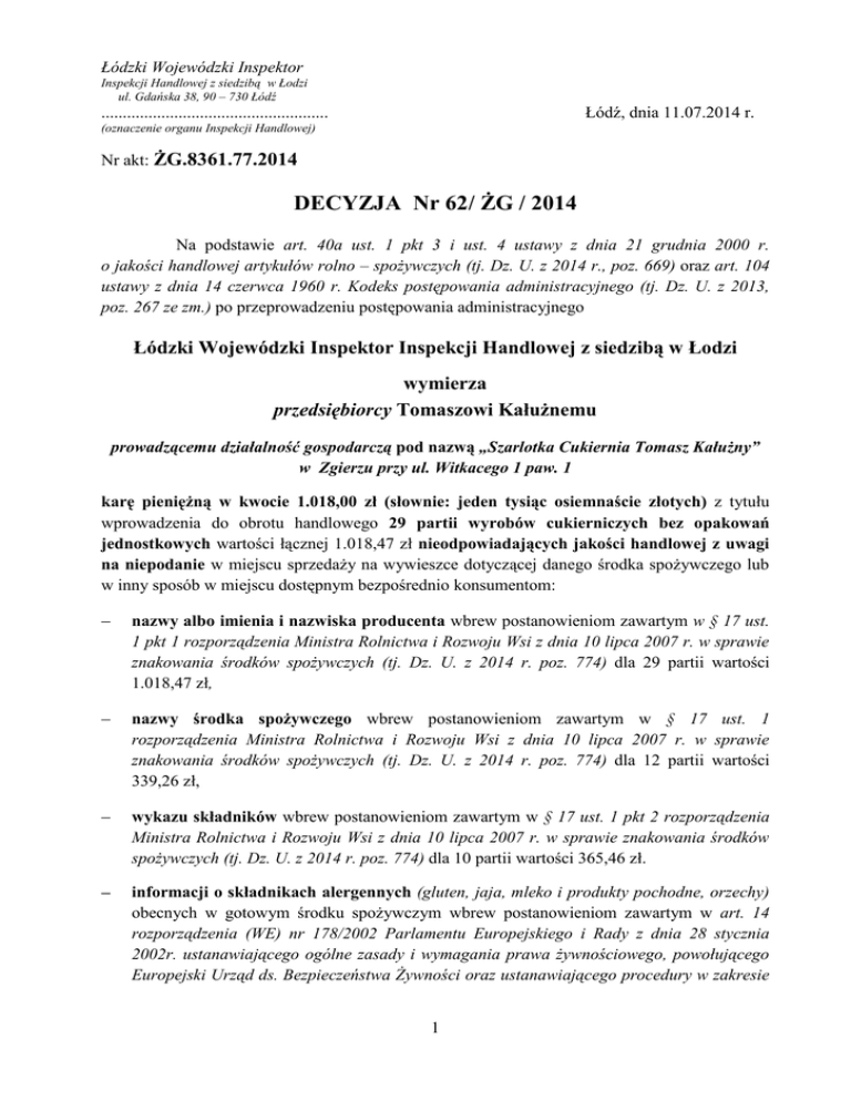 Łódzki Wojewódzki Inspektor Inspekcji Handlowej z siedzibą w Łodzi ul. Gdańska 38, 90 – 730 Łódź Łódź, dnia 11.07.2014 r. ..................................................... (oznaczenie organu Inspekcji Handlowej) Nr akt: ŻG.8361.77.2014 DECYZJA Nr 62/ ŻG / 2014 Na podstawie art. 40a ust. 1 pkt 3 i ust. 4 ustawy z dnia 21 grudnia 2000 r. o jakości handlowej artykułów rolno – spożywczych (tj. Dz. U. z 2014 r., poz. 669) oraz art. 104 ustawy z dnia 14 czerwca 1960 r. Kodeks postępowania administracyjnego (tj. Dz. U. z 2013, poz. 267 ze zm.) po przeprowadzeniu postępowania administracyjnego Łódzki Wojewódzki Inspektor Inspekcji Handlowej z siedzibą w Łodzi wymierza przedsiębiorcy Tomaszowi Kałużnemu prowadzącemu działalność gospodarczą pod nazwą „Szarlotka Cukiernia Tomasz Kałużny” w Zgierzu przy ul. Witkacego 1 paw. 1 karę pieniężną w kwocie 1.018,00 zł (słownie: jeden tysiąc osiemnaście złotych) z tytułu wprowadzenia do obrotu handlowego 29 partii wyrobów cukierniczych bez opakowań jednostkowych wartości łącznej 1.018,47 zł nieodpowiadających jakości handlowej z uwagi na niepodanie w miejscu sprzedaży na wywieszce dotyczącej danego środka spożywczego lub w inny sposób w miejscu dostępnym bezpośrednio konsumentom: nazwy albo imienia i nazwiska producenta wbrew postanowieniom zawartym w § 17 ust. 1 pkt 1 rozporządzenia Ministra Rolnictwa i Rozwoju Wsi z dnia 10 lipca 2007 r. w sprawie znakowania środków spożywczych (tj. Dz. U. z 2014 r. poz. 774) dla 29 partii wartości 1.018,47 zł, nazwy środka spożywczego wbrew postanowieniom zawartym w § 17 ust. 1 rozporządzenia Ministra Rolnictwa i Rozwoju Wsi z dnia 10 lipca 2007 r. w sprawie znakowania środków spożywczych (tj. Dz. U. z 2014 r. poz. 774) dla 12 partii wartości 339,26 zł, wykazu składników wbrew postanowieniom zawartym w § 17 ust. 1 pkt 2 rozporządzenia Ministra Rolnictwa i Rozwoju Wsi z dnia 10 lipca 2007 r. w sprawie znakowania środków spożywczych (tj. Dz. U. z 2014 r. poz. 774) dla 10 partii wartości 365,46 zł. informacji o składnikach alergennych (gluten, jaja, mleko i produkty pochodne, orzechy) obecnych w gotowym środku spożywczym wbrew postanowieniom zawartym w art. 14 rozporządzenia (WE) nr 178/2002 Parlamentu Europejskiego i Rady z dnia 28 stycznia 2002r. ustanawiającego ogólne zasady i wymagania prawa żywnościowego, powołującego Europejski Urząd ds. Bezpieczeństwa Żywności oraz ustanawiającego procedury w zakresie 1 bezpieczeństwa żywności (Dz. U. L 31 z 01.02.2002 r. s. 1 ze zm.) dla 10 partii wartości 365,46 zł. Uzasadnienie W dniach od 27 marca 2014 r. do 01 kwietnia 2014 r. na podstawie upoważnienia Łódzkiego Wojewódzkiego Inspektora Inspekcji Handlowej numer ŻG.8361.77.2014 z dnia 27.03.2014 r. inspektorzy Wojewódzkiego Inspektoratu Inspekcji Handlowej w Łodzi przeprowadzili kontrolę w cukierni zlokalizowanej w Zgierzu przy ul. Witkacego 1 paw. 1, należącej do Tomasza Kałużnego, wykonującego działalność gospodarczą pod nazwą „Szarlotka Cukiernia Tomasz Kałużny”. Kontrolę przeprowadzono na podstawie przepisów art. 3 ust. 1 - 3 rozporządzenia Parlamentu Europejskiego i Rady (WE) Nr 882/2004 z dnia 29 kwietnia 2004 r. w sprawie kontroli urzędowych przeprowadzanych w celu sprawdzenia zgodności z prawem paszowym i żywnościowym oraz regułami dotyczącymi zdrowia zwierząt i dobrostanu zwierząt (Dz. U. L 165 z 30.4.2004 ze zm.), art. 17 ust. 3 ustawy z dnia 21 grudnia 2000 r. o jakości handlowej artykułów rolno-spożywczych (Dz. U. z 2005 r. nr 187, poz. 1577, ze zm.), art. 24 ust. 1 rozporządzenia Parlamentu Europejskiego i Rady (WE) nr 1935/2004 z dnia 27 października 2004 r. w sprawie materiałów i wyrobów przeznaczonych do kontaktu z żywnością oraz uchylającego dyrektywy 80/590/EWG (Dz. U. z 27.10.2004 s. 4 ze zm.) w związku z art. 3 ust. 1 pkt 6 oraz art. 3 ust. 1 pkt 1 i 2 ustawy z dnia 15 grudnia 2000 r. o Inspekcji Handlowej (tj. Dz. U. z 2014 r., poz. 148) w obecności właściciela Tomasza Kałużnego. W toku kontroli stwierdzono, że 29 partii wyrobów cukierniczych bez opakowań jednostkowych deklarowanych w miejscu sprzedaży (na wywieszkach) bądź ustnie jako: Mozart w cenie 29,00 zł za 1 kilogram (2,70 kg), tort madagaskar w cenie 50,00 zł za 1 kilogram (1,00 kg), tort tiramisu w cenie 39,00 zł za 1 kilogram (0,79 kg), kremówka papieska w cenie 3,20 zł za sztukę (10 sztuk), tortoletka mała w cenie 3,20 zł za sztukę (3 sztuki), owocowy sen w cenie 24,00 zł za 1 kilogram (2,90 kg), W-Z w cenie 2,90 zł za sztukę (16 sztuk), W-Z cappuccino w cenie 2,90 zł za sztukę (7 sztuk), omlet w cenie 2,90 zł za sztukę (3 sztuki), rolada z bitą śmietaną w cenie 25,00 zł za 1 kilogram (0,79 kg), czarny las w cenie 24,00 zł za 1 kilogram (3,98 kg), tofiki w cenie 32,00 zł za 1 kilogram (1,42 kg), papieska w cenie 22,00 zł za 1 kilogram (0,90 kg), tort japoński w cenie 35,00 zł za 1 kilogram (1,11 kg), kukułka w cenie 22,00 zł za 1 kilogram (2,20 kg), jogurtowa w cenie 25,00 zł za 1 kilogram (0,61 kg), kryształek w cenie 21,00 zł za 1 kilogram (1,68 kg), hiszpańska kawa w cenie 22,00 zł za 1 kilogram (0,26 kg), tiramisu w cenie 23,00 zł za 1 kilogram (1,76 kg), beskidzkie w cenie 25,00 zł za 1 kilogram (0,98 kg), belgijskie w cenie 25,00 zł za 1 kilogram (2,20 kg), japońskie w cenie 24,00 zł za 1 kilogram (2,09 kg), pijak w cenie 24,00 zł za 1 kilogram (1,75 kg), 2 hiszpański orzech w cenie 22,00 zł za 1 kilogram (1,80 kg), toffi w cenie 24,00 zł za 1 kilogram (1,30 kg), adwokat w cenie 22,00 zł za 1 kilogram (0,60 kg), pomarańczowe w cenie 23,00 zł za 1 kilogram (0,71 kg), sernik bambo w cenie 25,00 zł za 1 kilogram (0,52 kg), bistro w cenie 24,00 zł za 1 kilogram (0,97 kg), wartości łącznej 1.018,47 zł oznakowanych było niezgodnie z obowiązującymi przepisami. Dokonane w toku kontroli oględziny miejsca sprzedaży wyrobó