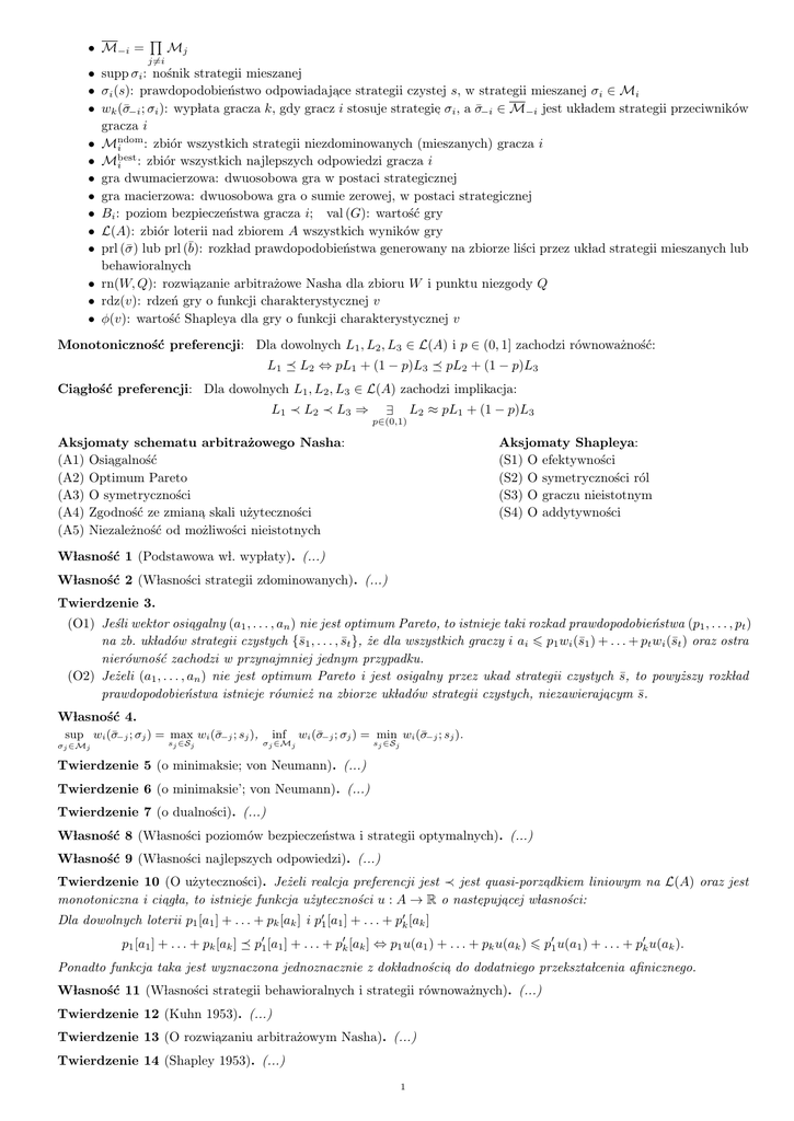 • wk (σ̄−i ; σi ): wyplata gracza k, gdy gracz i stosuje strategie, σi , a σ̄−i ∈ M−i jest ukladem strategii przeciwników