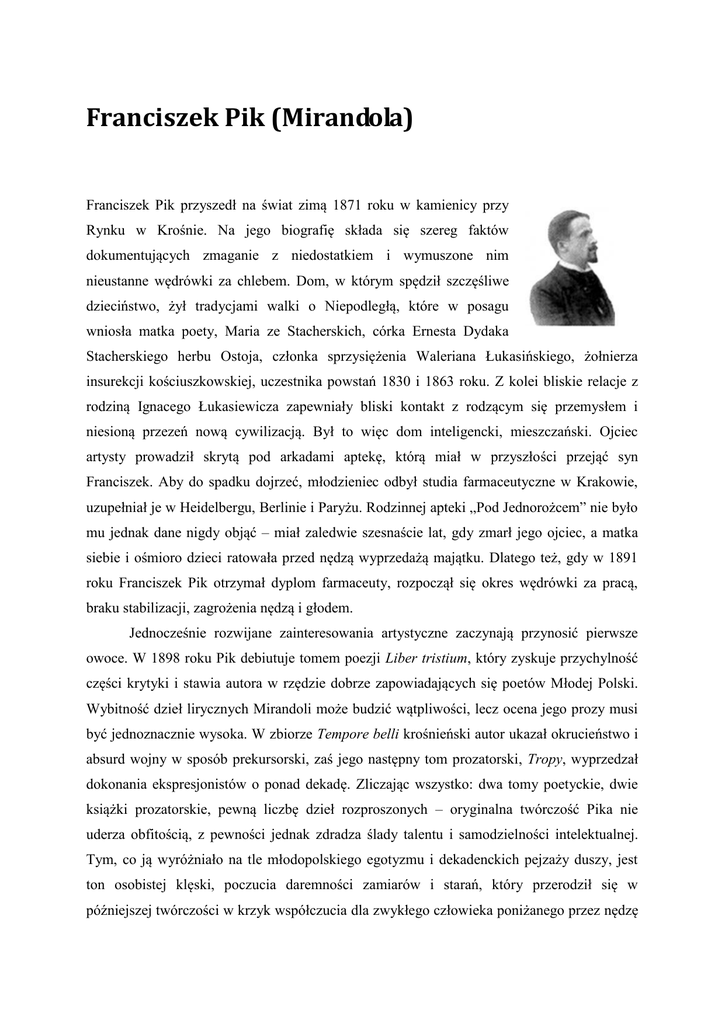 Franciszek Pik (Mirandola) Franciszek Pik przyszedł na świat zimą 1871 roku w kamienicy przy Rynku w Krośnie. Na jego biografię składa się szereg faktów dokumentujących zmaganie z niedostatkiem i wymuszone nim nieustanne wędrówki za chlebem. Dom, w którym spędził szczęśliwe dzieciństwo, żył tradycjami walki o Niepodległą, które w posagu wniosła matka poety, Maria ze Stacherskich, córka Ernesta Dydaka Stacherskiego herbu Ostoja, członka sprzysiężenia Waleriana Łukasińskiego, żołnierza insurekcji kościuszkowskiej, uczestnika powstań 1830 i 1863 roku. Z kolei bliskie relacje z rodziną Ignacego Łukasiewicza zapewniały bliski kontakt z rodzącym się przemysłem i niesioną przezeń nową cywilizacją. Był to więc dom inteligencki, mieszczański. Ojciec artysty prowadził skrytą pod arkadami aptekę, którą miał w przyszłości przejąć syn Franciszek. Aby do spadku dojrzeć, młodzieniec odbył studia farmaceutyczne w Krakowie, uzupełniał je w Heidelbergu, Berlinie i Paryżu. Rodzinnej apteki „Pod Jednorożcem” nie było mu jednak dane nigdy objąć – miał zaledwie szesnaście lat, gdy zmarł jego ojciec, a matka siebie i ośmioro dzieci ratowała przed nędzą wyprzedażą majątku. Dlatego też, gdy w 1891 roku Franciszek Pik otrzymał dyplom farmaceuty, rozpoczął się okres wędrówki za pracą, braku stabilizacji, zagrożenia nędzą i głodem. Jednocześnie rozwijane zainteresowania artystyczne zaczynają przynosić pierwsze owoce. W 1898 roku Pik debiutuje tomem poezji Liber tristium, który zyskuje przychylność części krytyki i stawia autora w rzędzie dobrze zapowiadających się poetów Młodej Polski. Wybitność dzieł lirycznych Mirandoli może budzić wątpliwości, lecz ocena jego prozy musi być jednoznacznie wysoka. W zbiorze Tempore belli krośnieński autor ukazał okrucieństwo i absurd wojny w sposób prekursorski, zaś jego następny tom prozatorski, Tropy, wyprzedzał dokonania ekspresjonistów o ponad dekadę. Zliczając wszystko: dwa tomy poetyckie, dwie książki prozatorskie, pewną liczbę dzieł rozproszonych – oryginalna twórczość Pika nie uderza obfitością, z pewności jednak zdradza ślady talentu i samodzielności intelektualnej. Tym, co ją wyróżniało na tle młodopolskiego egotyzmu i dekadenckich pejzaży duszy, jest ton osobistej klęski, poczucia daremności zamiarów i starań, który przerodził się w późniejszej twórczości w krzyk współczucia dla zwykłego człowieka poniżanego przez nędzę i doświadczającego okrucieństwa historii. W motywie tym łączą się osobiste doznania poety z jego przekonaniami politycznymi – Pik aktywnie wspierał lewicę, był członkiem PPS, pisał artykuły do „Naprzodu”, „Ogniwa”, „Robotnika” i „Promienia”. Twórczość własna Mirandoli jawi się jeszcze skromniej, jeśli zestawić ją z imponującą liczbą około dwustu tomów dzieł przetłumaczonych przez niego z angielskiego, niemieckiego, francuskiego, włoskiego i języków skandynawskich. Pik-Mirandola tłumaczył arcydzieła epoki: Głód Hamsuna, dramaty Maeterlincka, Germinal Zoli – ale także utwory dla dzieci: na przykład baśnie Andersena. W owym czasie jedynie Tadeusz Boy-Żeleński mógł szczycić się tak zróżnicowanym i bogatym dorobkiem translatorskim. Franciszek Pik przybrał pseudonim Mirandola ze względu na podobieństwo nazwiska z imieniem artysty włoskiego renesansu Pico della Mirandoli. W pewnym sensie Franciszek Pik był człowiekiem renesansu: pisał wiersze i prozę artystyczną, był autorem słownika wyrazów obcych dla ludu, tworzył scenariusze filmowe, opracowywał serie przezroczy, chciał opatentować instrument muzyczny własnego pomysłu, łączący cechy skrzypiec i pianina. Mirandola był też dzieckiem swojej epoki, w jego życiorysie skupiają się, jak w soczewce, palące problemy przełomu wieków. Zarazem wykraczał poza ramy swojego czasu i zapłacił za to wysoką cenę zapomnienia i nędzy. Poświęcona mu sala w murach Państwowej Wyższej Szkoły Zawodowej im. Stanisława Pigonia stanowi wyraz wdzięczności i pamięci mieszkańców Krosna. Dr Wojciech Gruchała, Zakład Polonistyki, PWSZ im Stanisława Pigonia w Krośnie