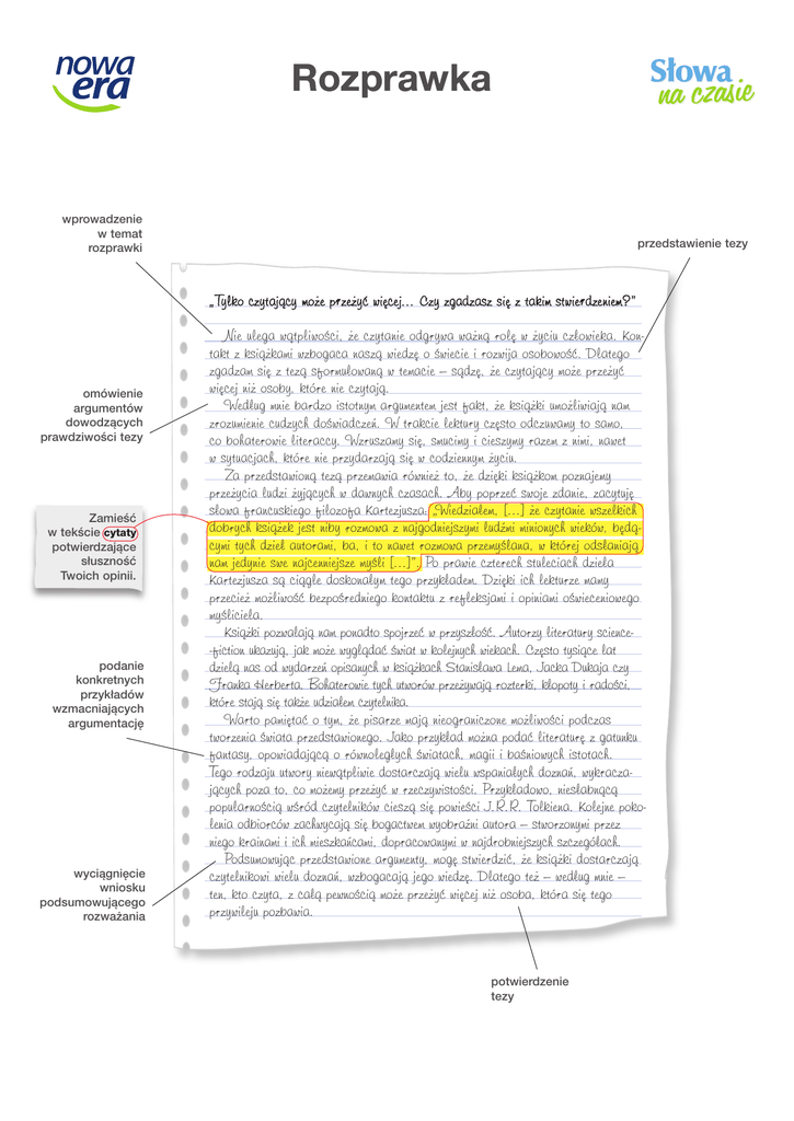 Rozprawka wprowadzenie w temat rozprawki przedstawienie tezy „Tylko czytajàcy mo˝e p ze˝yç wi´cej... Czy zgadzasz si´ z takim stwie dzeniem?” omówienie argumentów dowodzących prawdziwości tezy Zamieść w tekście cytaty potwierdzające słuszność Twoich opinii. podanie konkretnych przykładów wzmacniających argumentację wyciągnięcie wniosku podsumowującego rozważania Nie ulega wàtpliwoÊci, ˝e czytanie odg ywa wa˝nà ol´ w ˝yciu człowieka. Kontakt z ksià˝kami wzbogaca naszà wiedz´ o Êwiecie i ozwija osobowoÊç. Dlatego zgadzam si´ z tezà sfo mułowanà w temacie – sàdz´, ˝e czytajàcy mo˝e p ze˝yç wi´cej ni˝ osoby, któ e nie czytajà. Według mnie ba dzo istotnym a gumentem jest fakt, ˝e ksià˝ki umo˝liwiajà nam z ozumienie cudzych doÊwiadczeƒ. W t akcie lektu y cz´sto odczuwamy to samo, co bohate owie lite accy. Wz uszamy si´, smucimy i cieszymy azem z nimi, nawet w sytuacjach, któ e nie p zyda zajà si´ w codziennym ˝yciu. Za p zedstawionà tezà p zemawia ównie˝ to, ˝e dzi´ki ksià˝kom poznajemy p ze˝ycia ludzi ˝yjàcych w dawnych czasach. Aby pop zeç swoje zdanie, zacytuj´ słowa f ancuskiego filozofa Ka tezjusza: „Wiedziałem, [...] ˝e czytanie wszelkich dob ych ksià˝ek jest niby ozmowa z najgodniejszymi ludêmi minionych wieków, b´dàcymi tych dzieł auto ami, ba, i to nawet ozmowa p zemyÊlana, w któ ej odsłaniajà nam jedynie swe najcenniejsze myÊli [...]”. Po p awie czte ech stuleciach dzieła Ka tezjusza sà ciàgle doskonałym tego p zykładem. Dzi´ki ich lektu ze mamy p zecie˝ mo˝liwoÊç bezpoÊ edniego kontaktu z efleksjami i opiniami oÊwieceniowego myÊliciela. Ksià˝ki pozwalajà nam ponadto spoj zeç w p zyszłoÊç. Auto zy lite atu y science-fiction ukazujà, jak mo˝e wyglàdaç Êwiat w kolejnych wiekach. Cz´sto tysiàce lat dzielà nas od wyda zeƒ opisanych w ksià˝kach Stanisława Lema, Jacka Dukaja czy F anka He be ta. Bohate owie tych utwo ów p ze˝ywajà ozte ki, kłopoty i adoÊci, któ e stajà si´ tak˝e udziałem czytelnika. Wa to pami´taç o tym, ˝e pisa ze majà nieog aniczone mo˝liwoÊci podczas two zenia Êwiata p zedstawionego. Jako p zykład mo˝na podaç lite atu ´ z gatunku fantasy, opowiadajàcà o ównoległych Êwiatach, magii i baÊniowych istotach. Tego odzaju utwo y niewàtpliwie dosta czajà wielu wspaniałych doznaƒ, wyk aczajàcych poza to, co mo˝emy p ze˝yç w zeczywistoÊci. P zykładowo, niesłabnàcà popula noÊcià wÊ ód czytelników cieszà si´ powieÊci J.R.R. Tolkiena. Kolejne pokolenia odbio ców zachwycajà si´ bogactwem wyob aêni auto a – stwo zonymi p zez niego k ainami i ich mieszkaƒcami, dop acowanymi w najd obniejszych szczegółach. Podsumowujàc p zedstawione a gumenty, mog´ stwie dziç, ˝e ksià˝ki dosta czajà czytelnikowi wielu doznaƒ, wzbogacajà jego wiedz´. Dlatego te˝ – według mnie – ten, kto czyta, z całà pewnoÊcià mo˝e p ze˝yç wi´cej ni˝ osoba, któ a si´ tego p zywileju pozbawia. potwierdzenie tezy