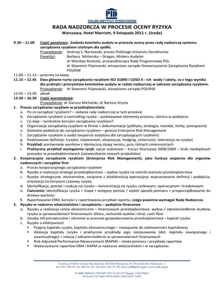 RADA NADZORCZA W PROCESIE OCENY RYZYKA Warszawa, Hotel Marriott, 9 listopada 2011 r. (środa) 9.30 – 11.00 Część panelowa: Zadania komitetu audytu w procesie oceny przez radę nadzorczą systemu zarządzania ryzykiem istotnym dla spółki. Prowadzenie: Andrzej S. Nartowski, prezes Polskiego Instytutu Dyrektorów Barbara Misterska – Dragan, Misters Audytor Paneliści: dr Wiesław Rozłucki, przewodniczący Rady Programowej PID, dr Sławomir Pijanowski, wiceprezes zarządu Stowarzyszenia Zarządzania Ryzykiem POLRISK 11.00 – 11.15 – przerwa na kawę 11.15 – 12.45 Dwa główne nurty zarządzania ryzykiem ISO 31000 i COSO II - ich wady i zalety, co z tego wynika dla praktyki i priorytetów komitetów audytu w radzie nadzorczej w zakresie zarządzania ryzykiem. Prowadzenie: dr Sławomir Pijanowski, wiceprezes zarządu POLRISK 12.45 – 13.30 obiad 13.30 – 16.30 Część warsztatowa: Prowadzenie: dr Dariusz Michalski, dr Bartosz Krysta 1. Proces zarządzania ryzykiem w przedsiębiorstwie a. Po co zarządzać ryzykiem? – zadania rady nadzorczej w tym procesie b. Zarządzanie ryzykiem a controlling ryzyka – podstawowe elementy procesu, różnica w podejściu c. Co daje – konkretne korzyści zarządzania ryzykiem? d. Organizacja zarządzania ryzykiem w firmie + dokumentacja (polityka, strategia, mandat, limity, powiązania) e. Globalne podejście do zarządzania ryzykiem – geneza Enterprise Risk Management f. Zarządzanie ryzykiem a audyt (wsparcie audytora dla zarządzających ryzykiem) g. Podstawowe definicje: (ryzyko, niepewność, ekspozycja, hedging, zmienność, tolerancja na ryzyko) h. Przykład: porównanie wyników z identyczną stopą zwrotu, przy różnych zmiennościach i. Praktyczny przykład wystąpienia ryzyk: opcje walutowe – kryzys finansowy 2008/2009 – brak niezbędnych procedur w przedsiębiorstwach (zatwierdzanie nowych produktów) 2. Korporacyjne zarządzanie ryzykiem (Enterprise Risk Management), jako funkcja wsparcia dla organów nadzorczych i zarządów firm a. Proces korporacyjnego zarządzania ryzykiem b. Ryzyko a realizacja strategii przedsiębiorstwa – wpływ ryzyka na nośniki wartości przedsiębiorstwa c. Ryzyko strategiczne, ekstremalne, związane z działalnością operacyjną: wypracowanie definicji i podejścia, orientacja na horyzont czasowy ryzyka d. Identyfikacja, pomiar i reakcja na ryzyko – koncentracja na ryzyku rynkowym, operacyjnym i kredytowym e. Ćwiczenie: identyfikacja ryzyka + mapa + wstępny pomiar / wybór sposób pomiaru + przyporządkowanie do drzewa wartości f. Raportowanie ERM, korzyści z raportowania przykład raportu, czego powinna wymagać Rada Nadzorcza 3. Ryzyko w nadzorze właścicielskim i zarządzaniu – podejście finansowe a. Ryzyko a realizacja celów ekonomiczno – finansowych przedsiębiorstwa: wpływ / odzwierciedlenie skutków ryzyka w sprawozdaniach finansowych: bilans, rachunek zysków i strat, cash-flow b. Zasoby infrastrukturalne i obronne w procesie gospodarowania przedsiębiorstwa – kapitał ryzyka c. Ryzyko a efektywność Pojęcie kapitału ryzyka, kapitału ekonomicznego – nawiązanie do adekwatności kapitałowej Alokacja kapitału ryzyka i praktyczne przykłady jego zastosowania (dot. kapitału zawiązanego i ewentualnego) + relacja / odzwierciedlenie w sprawozdaniach finansowych Risk Adjusted Performance Measurement (RAPM) – istota pomiaru i przykłady raportów Wykorzystanie raportów ERM i RAPM w nadzorze właścicielskim i w zarządzaniu. Zgłoszenie udziału w konferencji Akademii PID RADA NADZORCZA W PROCESIE OCENY RYZYKA Warszawa, Hotel Marriott, 9 listopada 2011 r. (środa) ………………………………………………………………………………………………………………………………………….…………… (1) imię i nazwisko zgłaszanego uczestnika ………………………………………………………………………………………………………………………………………….…………… stanowisko ………………………………………………………………………………………………………………………………………….…………… adres e-mail wyrażam zgodę nie wyrażam zgody *) ………………………………………………………………………………………………………………………………………….…………… podpis uczestnika ………………………………………………………………………………………………………………………………………….…………… (2) imię i nazwisko zgłaszanego uczestnika ………………………………………………………………………………………………………………………………………….…………… stanowisko ………………………………………………………………………………………………………………………………………….…………… adres e-mail wyrażam zgodę nie wyrażam zgody *) ………………………………………………………………………………………………………………………………………….…………… podpis uczestnika *) zgoda dotyczy wykorzystywania i przetwarzania danych osobowych do celów marketingowych Fundacji Polski Instytut Dyrektorów zgodnie z obowiązującą Ustawą z dn. 29.08.1997 r. (Dz. U . z dn. 29.10.1997 r.) o ochronie danych osobowych Nazwa firmy: .......................................................................................................................................................................... Adres: ..................................................................................................................................................................................... tel: ..................................................... fax: ..............................