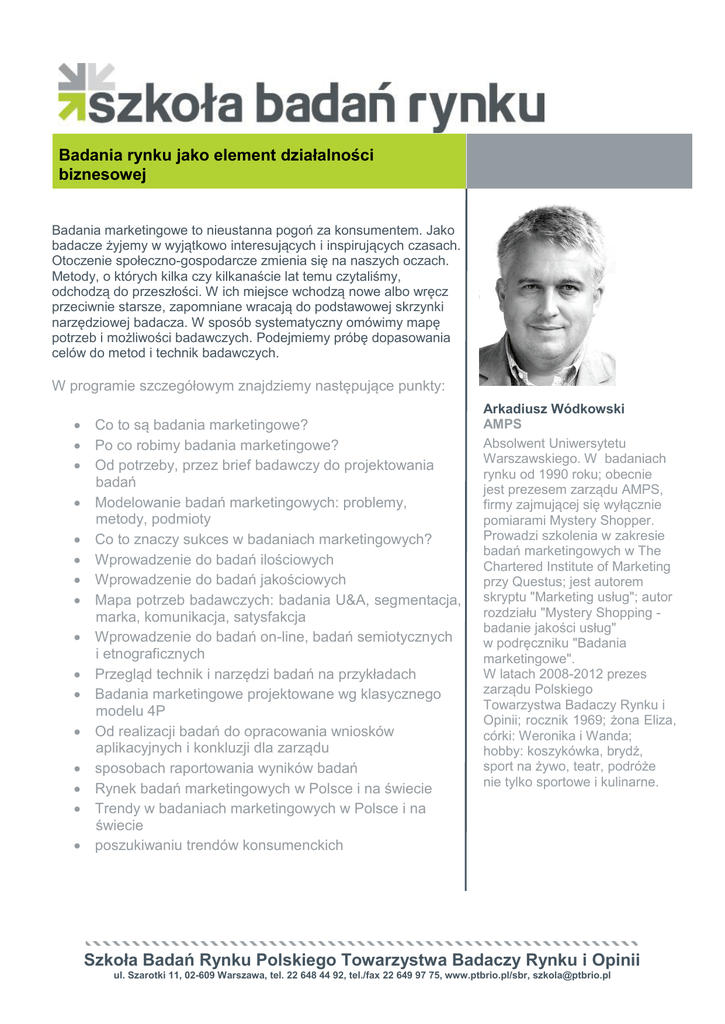 Badania rynku jako element działalności biznesowej Badania marketingowe to nieustanna pogoń za konsumentem. Jako badacze żyjemy w wyjątkowo interesujących i inspirujących czasach. Otoczenie społeczno-gospodarcze zmienia się na naszych oczach. Metody, o których kilka czy kilkanaście lat temu czytaliśmy, odchodzą do przeszłości. W ich miejsce wchodzą nowe albo wręcz przeciwnie starsze, zapomniane wracają do podstawowej skrzynki narzędziowej badacza. W sposób systematyczny omówimy mapę potrzeb i możliwości badawczych. Podejmiemy próbę dopasowania celów do metod i technik badawczych. W programie szczegółowym znajdziemy następujące punkty: Co to są badania marketingowe? Po co robimy badania marketingowe? Od potrzeby, przez brief badawczy do projektowania badań Modelowanie badań marketingowych: problemy, metody, podmioty Co to znaczy sukces w badaniach marketingowych? Wprowadzenie do badań ilościowych Wprowadzenie do badań jakościowych Mapa potrzeb badawczych: badania U&A, segmentacja, marka, komunikacja, satysfakcja Wprowadzenie do badań on-line, badań semiotycznych i etnograficznych Przegląd technik i narzędzi badań na przykładach Badania marketingowe projektowane wg klasycznego modelu 4P Od realizacji badań do opracowania wniosków aplikacyjnych i konkluzji dla zarządu sposobach raportowania wyników badań Rynek badań marketingowych w Polsce i na świecie Trendy w badaniach marketingowych w Polsce i na świecie poszukiwaniu trendów konsumenckich Arkadiusz Wódkowski AMPS Absolwent Uniwersytetu Warszawskiego. W badaniach rynku od 1990 roku; obecnie jest prezesem zarządu AMPS, firmy zajmującej się wyłącznie pomiarami Mystery Shopper. Prowadzi szkolenia w zakresie badań marketingowych w The Chartered Institute of Marketing przy Questus; jest autorem skryptu "Marketing usług"; autor rozdziału "Mystery Shopping badanie jakości usług" w podręczniku "Badania marketingowe". W latach 2008-2012 prezes zarządu Polskiego Towarzystwa Badaczy Rynku i Opinii; rocznik 1969; żona Eliza, córki: Weronika i Wanda; hobby: koszykówka, brydż, sport na żywo, teatr, podróże nie tylko sportowe i kulinarne. Szkoła Badań Rynku Polskiego Towarzystwa Badaczy Rynku i Opinii ul. Szarotki 11, 02-609 Warszawa, tel. 22 648 44 92, tel./fax 22 649 97 75, www.ptbrio.pl/sbr, [email protected]
