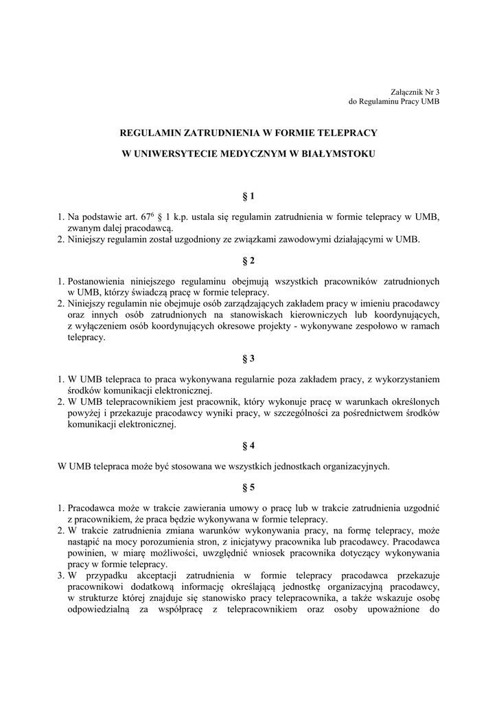 Załącznik Nr 3 do Regulaminu Pracy UMB REGULAMIN ZATRUDNIENIA W FORMIE TELEPRACY W UNIWERSYTECIE MEDYCZNYM W BIAŁYMSTOKU §1 1. Na podstawie art. 676 § 1 k.p. ustala się regulamin zatrudnienia w formie telepracy w UMB, zwanym dalej pracodawcą. 2. Niniejszy regulamin został uzgodniony ze związkami zawodowymi działającymi w UMB. §2 1. Postanowienia niniejszego regulaminu obejmują wszystkich pracowników zatrudnionych w UMB, którzy świadczą pracę w formie telepracy. 2. Niniejszy regulamin nie obejmuje osób zarządzających zakładem pracy w imieniu pracodawcy oraz innych osób zatrudnionych na stanowiskach kierowniczych lub koordynujących, z wyłączeniem osób koordynujących okresowe projekty - wykonywane zespołowo w ramach telepracy. §3 1. W UMB telepraca to praca wykonywana regularnie poza zakładem pracy, z wykorzystaniem środków komunikacji elektronicznej. 2. W UMB telepracownikiem jest pracownik, który wykonuje pracę w warunkach określonych powyżej i przekazuje pracodawcy wyniki pracy, w szczególności za pośrednictwem środków komunikacji elektronicznej. §4 W UMB telepraca może być stosowana we wszystkich jednostkach organizacyjnych. §5 1. Pracodawca może w trakcie zawierania umowy o pracę lub w trakcie zatrudnienia uzgodnić z pracownikiem, że praca będzie wykonywana w formie telepracy. 2. W trakcie zatrudnienia zmiana warunków wykonywania pracy, na formę telepracy, może nastąpić na mocy porozumienia stron, z inicjatywy pracownika lub pracodawcy. Pracodawca powinien, w miarę możliwości, uwzględnić wniosek pracownika dotyczący wykonywania pracy w formie telepracy. 3. W przypadku akceptacji zatrudnienia w formie telepracy pracodawca przekazuje pracownikowi dodatkową informację określającą jednostkę organizacyjną pracodawcy, w strukturze której znajduje się stanowisko pracy telepracownika, a także wskazuje osobę odpowiedzialną za współpracę z telepracownikiem oraz osoby upoważnione do przeprowadzania kontroli w miejscu wykonywania pracy. 4. Nie jest dopuszczalne indywidualne wdrożenie formy telepracy poprzez powierzenie pracownikowi, innej pracy niż określona w umowie o pracę na okres nie przekraczający 3 miesięcy w roku kalendarzowym - również w przypadkach uzasadnionych potrzebami pracodawcy, nawet jeżeli nie powoduje to obniżenia wynagrodzenia i odpowiada kwalifikacjom pracownika. §6 Brak zgody pracownika na zmianę warunków zatrudnienia w formie telepracy lub rezygnacja pracownika z wykonywania pracy w tej formie nie może być podstawą wypowiedzenia umowy o pracę. §7 1. Osoby zatrudnione w UMB, wykonują pracę w formie telepracy w miejscu swojego zamieszkania. 2. Miejscem zamieszkania pracownika jest lokal mieszkalny (lub nieruchomość), do którego tytuł prawny posiada pracownik lub małżonek pracownika. 3. Miejscem zamieszkania pracownika jest również inny lokal mieszkalny (nieruchomość), który pracownik wynajmuje na podstawie długoterminowej umowy (zawartej na okres dłuższy niż 1 rok), a właściciel lokalu wyraża pisemną zgodę na wykorzystanie określonego pomieszczenia w tym lokalu dla potrzeb telepracy przez cały okres wynajmu. §8 1. Pracodawca powierza pracownikom wykonującym pracę w formie telepracy sprzęt techniczny (komputery, oprogramowanie, środki łączności) do użytkowania poza siedzibą firmy. 2. Szczegółowy rodzaj sprzętu, przewidywany czas oraz techniczne zasady jego użytkowania określane są przez przełożonego danego pracownika w porozumieniu z kierownikiem Działu Informatyki i Teletransmisji. 3. Pracodawca zapewnia pomoc techniczną i niezbędne szkolenie telepracownika w zakresie obsługi powierzonego sprzętu, oprogramowania, środków łączności. 4. Pracodawca może ponosić koszty związane z ubezpieczeniem sprzętu powierzonego telepracownikowi. 5. Pracownik może udostępnić i używać do celów służbowych związanych z wykonywaniem telepracy prywatnych komputerów. 6. W przypadku, o którym mowa w §8 pkt 5 telepracownik zobowiązuje się do używania w pełni sprawnego sprzętu do celów służbowych w sposób zgodny z jego przeznaczeniem. §9 1. Telepracownik wykonuje pracę w systemie zadaniowym. 2. Czas pracy telepracownika określa wymiar jego zadań. Zadania są ustalane w sposób możliwy do wykonania przez pracownika w czasie obejmującym przeciętnie 8 godzin na dobę i 40 godzin na tydzień przy zachowaniu 5-dniowego tygodnia pracy. 3. Zadania telepracownika muszą uwzględniać specyficzny charakter i formę zatrudnienia – to jest pracy wykonywanej regularnie poza zakładem pracy, z wykorzystaniem środków komunikacji elektronicznej. 4. W trakcie wykonywania telepracy zatrudniony wykonujący pracę w tej formie zobowiązany jest do: · Merytorycznego kontaktu z przełożonym macierzystej jednostki organizacyjnej lub inną wyznaczoną przez niego osobą (opiekunem -koordynatorem), · Przyjmowania zadań na piśmie lub w przesyłanych drogą elektroniczną, · Sporządzania miesięcznych i tygodniowych raportów ze stanu wykonania zadań i poleceń, na żądanie przełożonego, · Potwierdzania (telefonicznie, faksem lub pocztą elektroniczną) pozostawania w dyspozycji pracodawcy w wyznaczonym miejscu i określonym przedziale czasowym w ciągu dnia pracy (niezależnie od merytorycznych kontaktów z siedzibą przedsiębiorstwa), · Wykorzystywania powierzonego sprzętu i oprogramowania oraz środków łączności (komputery, drukarki, programy, urządzenia biurowo-komunikacyjne, modemy, skanery itp.) wyłącznie do celów służbowych, · Wykorzystywania powierzonych materiałów biurowych i technicznych wyłącznie do celów biurowych i comiesięcznego rozliczania się z ich faktycznego i celowego wykorzystania, · Ochrony powierzonego sprzętu, oprogramowania, środków łączności przed uszkodzeniem, kradzieżą, zniszczeniem, a także przed nieuprawnionym użyciem, · Zabezpieczania danych i informacji dostępnych na i za p
