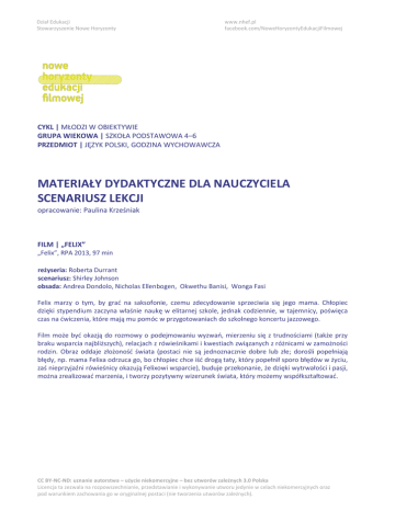 Dział Edukacji Stowarzyszenie Nowe Horyzonty www.nhef.pl facebook.com/NoweHoryzontyEdukacjiFilmowej CYKL | MŁODZI W OBIEKTYWIE GRUPA WIEKOWA | SZKOŁA PODSTAWOWA 4–6 PRZEDMIOT | JĘZYK POLSKI, GODZINA WYCHOWAWCZA MATERIAŁY DYDAKTYCZNE DLA NAUCZYCIELA SCENARIUSZ LEKCJI opracowanie: Paulina Krześniak FILM | „FELIX” „Felix”, RPA 2013, 97 min reżyseria: Roberta Durrant scenariusz: Shirley Johnson obsada: Andrea Dondolo, Nicholas Ellenbogen, Okwethu Banisi, Wonga Fasi Felix marzy o tym, by grać na saksofonie, czemu zdecydowanie sprzeciwia się jego mama. Chłopiec dzięki stypendium zaczyna właśnie naukę w elitarnej szkole, jednak codziennie, w tajemnicy, poświęca czas na ćwiczenia, które mają mu pomóc w przygotowaniach do szkolnego koncertu jazzowego. Film może być okazją do rozmowy o podejmowaniu wyzwań, mierzeniu się z trudnościami (także przy braku wsparcia najbliższych), relacjach z rówieśnikami i kwestiach związanych z różnicami w zamożności rodzin. Obraz oddaje złożoność świata (postaci nie są jednoznacznie dobre lub złe; dorośli popełniają błędy, np. mama Felixa odrzuca go, bo chłopiec chce iść drogą taty, który popełnił sporo błędów w życiu, zaś nieprzyjaźni rówieśnicy okazują Felixowi wsparcie), buduje przekonanie, że dzięki wytrwałości i pasji, można zrealizować marzenia, i tworzy pozytywny wizerunek świata, który możemy współkształtować. CC BY-NC-ND: uznanie autorstwa – użycie niekomercyjne – bez utworów zależnych 3.0 Polska Licencja ta zezwala na rozpowszechnianie, przedstawianie i wykonywanie utworu jedynie w celach niekomercyjnych oraz pod warunkiem zachowania go w oryginalnej postaci (nie tworzenia utworów zależnych). FELIX ZNACZY SZCZĘŚLIWY. O SZCZĘŚCIU, JAKIE DAJE PASJA Temat lekcji Felix znaczy szczęśliwy. O szczęściu, jakie daje pasja. Czas trwania lekcji 45 min Cele lekcji Podczas lekcji uczeń: → → → → rozwija umiejętność samodzielnego myślenia; rozwija umiejętności przedstawiania i uzasadniania swojego zdania oraz formułowania myśli z uwzględnieniem zasad kultury słowa; wzbogaca wyobraźnię; dyskutuje na temat pasji, determinacji w dążeniu do celu i konfliktów z rodzicami. Metody i formy pracy Podczas lekcji nauczyciel wykorzystuje następujące metody i formy pracy z uczniem: → → → → → → → → pogadanka; ideogram; burza mózgów; element dramy; drzewo decyzyjne; karta pracy; praca ze słownikiem; praca z klasą, w grupach oraz indywidualna. Środki dydaktyczne Podczas lekcji nauczyciel wykorzystuje następujące środki dydaktyczne: → → → → film „Felix”; czyste kartki formatu A4; karta pracy; słownik imion. Przygotowanie do lekcji Lekcja powinna się odbyć po obejrzeniu filmu „Felix”. Przed zajęciami nauczyciel drukuje karty pracy (patrz s. 6) i szykuje kilka egzemplarzy słownika imion. PRZEBIEG LEKCJI Wprowadzenie Nauczyciel podaje temat lekcji, a następnie prosi dzieci, by podzieliły się wrażeniami po obejrzeniu filmu „Felix”, pyta, czy im się on podobał. CC BY-NC-ND: uznanie autorstwa – użycie niekomercyjne – bez utworów zależnych 3.0 Polska Licencja ta zezwala na rozpowszechnianie, przedstawianie i wykonywanie utworu jedynie w celach niekomercyjnych oraz pod warunkiem zachowania go w oryginalnej postaci (nie tworzenia utworów zależnych). 2 Realizacja tematu Nauczyciel rozdaje czyste kartki formatu A4 i prosi, by przedstawili Felixa za pomocą ideogramu – symbolicznego rysunku kojarzącego się z głównym bohaterem filmu. Dzieci prezentują i omawiają swoje rysunki na forum klasy. Nauczyciel rozdaje karty pracy (patrz s. 6) i prosi uczniów o wykonanie zadania 1. Chętne osoby przedstawiają na podstawie kwestionariusza sylwetkę bohatera. Przykładowa odpowiedź → Felix jest mieszkańcem RPA. Kiedy go poznajemy, rozpoczyna naukę w elitarnej szkole. Chłopiec jest wychowywany przez matkę, ma dwójkę rodzeństwa. Jego tata nie żyje. Felix kocha muzykę. Jego pasją jest gra na saksofonie. Nauczyciel pyta dzieci, czym według nich jest pasja. Skojarzenia uczniów zapisuje na tablicy. Przewidywane odpowiedzi → → → → → → → zamiłowanie zainteresowanie hobby konik upodobanie skłonność fascynacja Kolejna część lekcji wykorzystuje element dramy. Nauczyciel prosi, by uczniowie rozproszyli się po sali, mają poruszać się po niej swobodnie w dowolnych kierunkach. Na wypowiedziane przez nauczyciela hasło – określenie jakiegoś zajęcia (np. rysunek, muzyka, taniec, modelarstwo, piłka nożna) – uczniowie, dla których stanowi ono hobby, ustawiają się w określonej wcześniej części sali. Po powrocie do ławek nauczyciel pyta dzieci, czy zdarza im się miewać problemy z realizowaniem swoich pasji. Jeśli tak, jakiego rodzaju są to problemy? Przewidywane odpowiedzi → → → są one zbyt kosztowne, wymagają drogiego lub trudnego do zdobycia sprzętu wymagają wyjazdów lub dalekich dojazdów na ćwiczenia, zajęcia, próby czy zgrupowania rodzice nie pochwalają tych zainteresowań Nauczyciel nawiązuje do pasji Felixa. Pyta, czy bohater filmu od początku mógł się jej oddawać bez problemów. Rozmową należy tak pokierować, by uczniowie zauważyli, że: → → → Felix ma ograniczone możliwości rozwijania swojego talentu, okazją dla niego jest nabór do szkolnej orkiestry; poza prostą piszczałką Felix nie ma profesjonalnego instrumentu do czasu odnalezienia w domu saksofonu ojca; pasji chłopca przeciwna jest jego mama, która uważa, że miłość do muzyki wciągnęła w złe towarzystwo jej męża (mężczyzna zmarł z powodu uzależnienia od alkoholu). CC BY-NC-ND: uznanie autorstwa – użycie niekomercyjne – bez utworów zależnych 3.0 Polska Licencja ta zezwala na rozpowszechnianie, przedstawianie i wykonywanie utworu jedynie w celach niekomercyjnych oraz pod warunkiem zachowania go w oryginalnej postaci (nie tworzenia utworów zależnych)