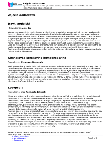 Zajęcia dodatkowe Opublikowane na Fundacja Nasze Dzieci, Przedszkole ArcelorMittal Poland (http://fundacja-naszedzieci.pl) Zajęcia dodatkowe Język angielski Prowadzenie: Anna Jop W naszym przedszkolu naukę języka angielskiego prowadzimy we wszystkich grupach wiekowych. Naszym głównym celem jest przygotowanie dzieci do dalszej nauki języka obcego w późniejszym etapie edukacji szkolnej. Dzieci w wieku przedszkolnym lubią poznawać nowe słowa, lubią się bawić, a wykorzystując ich naturalne zdolności do szybkiego przyswajania nowych słów, nauka języka poprzez zabawę wydaje się efektywniejsza. Codzienne zajęcia sprawiają, że te naturalne zdolności rosną i będą procentować w dalszej edukacji. Dzięki grom, zabawom, wspólnemu śpiewaniu dzieci uczą się nowych słów, zwrotów, a przygotowane kart pracy, które są pełne zadań, są adekwatne do poziomu rozwojowego dzieci zarówno na płaszczyźnie emocjonalnej jak i intelektualnej. Codzienne lekcje języka obcego pozwalają dziecku opisywać otaczający go świat i przygotowują do dalszej edukacji językowej. Gimnastyka korekcyjno-kompensacyjna Prowadzenie: Katarzyna Domagała Wiek przedszkolny to dla dziecka kluczowy moment w kształtowaniu odpowiedniej postawy ciała. W celu uniknięcia problemów związanych z wadami postawy, które są wynikiem słabego umięśnienia lub nieprawidłowego nawyku utrzymania postawy ciała, warto wykonywać odpowiednie ćwiczenia. Za pomocą różnych metod (naśladowcza, zabawowa, improwizacja, opisowa, pokazowa, systematyczna) będę się starała zainteresować dzieci ćwiczeniami i poprawić ich sprawność fizyczną. Chciałabym również podjąć współpracę z rodzicami, którzy w domu zechcą wykonywać ćwiczenia z dziećmi, aby skutecznie uniknąć u swoich pociech często spotykanych wad: kręgosłupa, klatki piersiowej, kończyn dolnych oraz stóp. Logopedia Prowadzenie: mgr Agnieszka Jakubek Mowa jest głównym środkiem porozumiewania się między ludźmi, a prawidłowy jej rozwój stanowi podstawę kształtowania się osobowości dziecka. Jeśli więc proces rozwoju mowy przebiega prawidłowo, to dziecko prawidłowo formułuje swoje myśli, jego wymowa jest zrozumiała nie tylko dla najbliższych, ale i dla obcych osób, sukcesywnie rozwija słownictwo i rozumienie pojęć abstrakcyjnych, prawidłowo stosuje formy gramatyczne. W rozwoju mowy ogromną rolę spełnia środowisko, w jakim się dziecko wychowuje, a codzienny kontakt z rodziną i rówieśnikami dostarcza nowych doświadczeń i pozwala nabywać wielu nowych umiejętności językowych. Rodzice dzieci w wieku przedszkolnym często zastanawiają się, czy ich dziecko mówi poprawnie, czy też rozwój mowy jest opóźniony lub zaburzony. Zadanie intensywnego przygotowania dziecka do szkoły polega między innymi na roztaczaniu troskliwej opieki nad ostatnią fazą kształtowania się mowy, tak aby była ona już dojrzała, gdy dziecko wstąpi w progi szkoły. Zapobieganie i korekcja wad wymowy, to również w prostej zależności zapobieganie ewentualnym trudnościom czy niepowodzeniom szkolnym, bowiem dosyć często zdarza się, że dziecko źle mówiące popełnia błędy w pisaniu, a gdy słabo czyta, może mieć trudności w rozumieniu tekstów lub przejawiać zahamowania w spontanicznym wypowiadaniu się. Swoje grupowe zajęcia logopedyczne będę opierała na pedagogice zabawy. Celem zajęć logopedycznych będzie: Polityka prywatności Warunki prawne Mapa strony Page 1 of 6 Zajęcia dodatkowe Opublikowane na Fundacja Nasze Dzieci, Przedszkole ArcelorMittal Poland (http://fundacja-naszedzieci.pl) • • • • • • stymulowanie opóźnionego rozwoju mowy dzieci, u których zaobserwuję taką potrzebę, wstępna diagnoza uzyskana przez obserwację dzieci podczas wspólnych zajęć logopedyczne, ćwiczenia przygotowujące narządy artykulacyjne do prawidłowej wymowy głosek, kształtowanie prawidłowej mowy- korygowanie zaburzeń, doskonalenie mowy, wprowadzanie metody symultaniczno- sekwencyjnej prof. Jagody Cieszyńskiej. Należy jednak zaznaczyć, iż terapia grupowa nie może stanowić podstawowej formy pracy a jest tylko niezbędnym uzupełnieniem pracy indywidualnej. Metoda Dobrego Startu Prowadzenie: mgr Barbara Zoń Prof. zw. dr hab. Marta Bogdanowicz, autorka Metody Dobrego Startu, jest psychologiem klinicznym dziecięcym, założycielką i wieloletnią przewodniczącą, a obecnie wiceprzewodniczącą Polskiego Towarzystwa Dysleksji. W przeszłości była także wiceprzewodniczącą Europejskiego Towarzystwa Dysleksji. Badania prowadzone przez prof. Martę Bogdanowicz obejmują zakres psychologii klinicznej dziecka (dysleksję rozwojową i leworęczność) oraz wspomaganie rozwoju, profilaktykę zaburzeń rozwoju i terapię pedagogiczną. Metoda Dobrego Startu opiera się na założeniu, iż dziecko w procesie poznawania świata poprzez zabawę i działanie wykorzystuje wiele zmysłów. Zatem poznanie to nazywamy polisensorycznym. Metoda ta rozwija funkcje spostrzeżeniowe (wzrokowe, słuchowe, dotykowe, kinestetyczne), językowe oraz ruchowe. Jej zastosowanie pomaga także kształtować wzajemne działanie wymienionych funkcji, a więc proces integracji percepcyjno-motorycznej. Wszystkie te czynniki są bardzo istotne, ponieważ stanowią podstawę w procesie czytania i pisania. Struktura zajęć MDS zawiera w sobie nie tylko ćwiczenia integrujące, ale też kształtujące świadomość osoby, swojego ciała i orientacji w przestrzeni. Na kolejnych etapach zajęć wykorzystujemy różnorodne pomoce. Podczas ćwiczeń ruchowo-słuchowych korzystamy z baloników, wstążek, gazet, szarf, woreczków wypełnionych grochem, itp. Ćwiczenia ruchowo-słuchowo-wzrokowe są najbardziej złożoną formą ćwiczeń, w czasie których dzieci odtwarzają wzór w rytm jednocześnie śpiewanej piosenki lub recytowanego wiersza. Reprodukowanie wzoru odbywa się w sposób interesujący dla dzieci. P