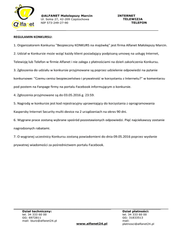@ALFANET Małolepszy Marcin Ul. Solna 27, 42-209 Częstochowa NIP 573-249-27-90 INTERNET TELEWIZJA TELEFON REGULAMIN KONKURSU: 1. Organizatorem Konkursu "Bezpieczny KONKURS na majówkę" jest firma Alfanet Małolepszy Marcin. 2. Udział w Konkursie może wziąć każdy klient posiadający podpisaną umowę na usługę Internet, Telewizję lub Telefon w firmie Alfanet i nie zalega z płatnościami na dzień zakończenia Konkursu. 3. Zgłoszenia do udziału w konkursie przyjmowane są poprzez udzielenie odpowiedzi na pytanie konkursowe: "Czemu cenisz bezpieczeństwo i prywatność w korzystaniu z Internetu?" w komentarzu pod postem na Fanpage firmy na portalu Facebook informującym o konkursie. 4. Zgłoszenia przyjmowane są do 03.05.2016 g. 23:59. 5. Nagrodą w konkursie jest kod rejestracyjny uprawniający do korzystania z oprogramowania Kaspersky Internet Security multi-device na 2 urządzeniach na okres 90 dni. 6. Wygrane prace zostaną wybrane spośród pozostawionych odpowiedzi. Pięć najciekawszy zostanie nagrodzonych rabatami. 7. O wygranej uczestnicy Konkursu zostaną powiadomieni do dnia 09.05.2016 poprzez wysłanie prywatnej wiadomości za pośrednictwem portalu Facebook. _____________________________________________ Dział techniczny: tel. 34 333 60 00 GG: 6972811 mail: [email protected] _____________ Dział płatności: www.alfanet24.pl tel. 34 333 60 00 GG: 31833513 mail: [email protected]