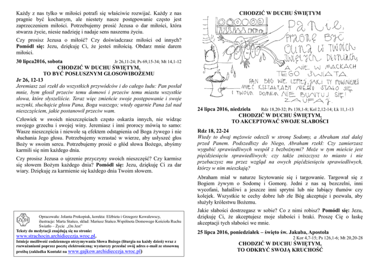 Każdy z nas tylko w miłości potrafi się właściwie rozwijać. Każdy z nas pragnie być kochanym, ale niestety nasze postępowanie często jest zaprzeczeniem miłości. Potrzebujemy prosić Jezusa o dar miłości, która stwarza życie, niesie nadzieję i nadaje sens naszemu życiu. CHODZIĆ W DUCHU ŚWIĘTYM Czy prosisz Jezusa o miłość? Czy doświadczasz miłości od innych? Pomódl się: Jezu, dziękuję Ci, że jesteś miłością. Obdarz mnie darem miłości. 30 lipca2016, sobota Jr 26,11-24; Ps 69,15-34; Mt 14,1-12 CHODZIĆ W DUCHU ŚWIĘTYM, TO BYĆ POSŁUSZNYM GŁOSOWIBOŻEMU Jr 26, 12-13 Jeremiasz zaś rzekł do wszystkich przywódców i do całego ludu: Pan posłał mnie, bym głosił przeciw temu domowi i przeciw temu miastu wszystkie słowa, które słyszeliście. Teraz więc zmieńcie swoje postępowanie i swoje uczynki, słuchajcie głosu Pana, Boga waszego; wtedy ogarnie Pana żal nad nieszczęściem, jakie postanowił przeciw wam. Człowiek w swoich nieszczęściach często oskarża innych, nie widząc swojego grzechu i swojej winy. Jeremiasz i inni prorocy mówią to samo: Wasze nieszczęścia i niewole są efektem odstąpienia od Boga żywego i nie słuchania Jego głosu. Potrzebujemy wzrastać w wierze, aby usłyszeć głos Boży w swoim sercu. Potrzebujemy prosić o głód słowa Bożego, abyśmy karmili się nim każdego dnia. Czy prosisz Jezusa o ujrzenie przyczyny swoich nieszczęść? Czy karmisz się słowem Bożym każdego dnia? Pomódl się: Jezu, dziękuję Ci za dar wiary. Dziękuję za karmienie się każdego dnia Twoim słowem. 24 lipca 2016, niedziela Rdz 18,20-32; Ps 138,1-8; Kol 2,12-14; Łk 11,1-13 CHODZIĆ W DUCHU ŚWIĘTYM, TO AKCEPTOWAĆ SWOJE SŁABOŚCI Rdz 18, 22-24 Wtedy to dwaj mężowie odeszli w stronę Sodomy, a Abraham stał dalej przed Panem. Podszedłszy do Niego, Abraham rzekł: Czy zamierzasz wygubić sprawiedliwych wespół z bezbożnymi? Może w tym mieście jest pięćdziesięciu sprawiedliwych; czy także zniszczysz to miasto i nie przebaczysz mu przez wzgląd na owych pięćdziesięciu sprawiedliwych, którzy w nim mieszkają? Abraham miał w naturze licytowanie się i targowanie. Targował się z Bogiem żywym o Sodomę i Gomorę. Jedni z nas są bezczelni, inni wycofani, hałaśliwi a jeszcze inni sprytni lub nie lubiący tłumów czy kolejek. Wszystkie te cechy dobre lub złe Bóg akceptuje i pozwala, aby służyły królestwu Bożemu. Opracowała: Jolanta Prokopiuk, korekta: Elżbieta i Grzegorz Kowalewscy, ilustracje: Marta Stańco, skład: Mariusz Stańco.Wspólnota Domowego Kościoła Ruchu Światło – Życie „On Jest” Teksty do medytacji znajdują się na stronie: www.strachocin.archidiecezja.wroc.pl. Istnieje możliwość codziennego otrzymywania Słowa Bożego (liturgia na każdy dzień) wraz z rozważaniami poprzez pocztę elektroniczną; wystarczy przesłać swój adres e-mail ze stosowną prośbą (zakładka Kontakt na www.gajkow.archidiecezja.wroc.pl) Jakie słabości dostrzegasz w sobie? Co z nimi robisz? Pomódl się: Jezu, dziękuję Ci, że akceptujesz moje słabości i braki. Proszę Cię o łaskę akceptacji tych słabości we mnie. 25 lipca 2016, poniedziałek – święto św. Jakuba, Apostoła 2 Kor 4,7-15; Ps 126,1-6; Mt 20,20-28 CHODZIĆ W DUCHU ŚWIĘTYM, TO ODKRYĆ SWOJĄ KRUCHOŚĆ 2 Kor 4, 7-10 Przechowujemy skarb w naczyniach glinianych, aby z Boga była owa przeogromna moc, a nie z nas. Zewsząd znosimy cierpienia, lecz nie poddajemy się zwątpieniu; żyjemy w niedostatku, lecz nie rozpaczamy; znosimy prześladowania, lecz nie czujemy się osamotnieni, obalają nas na ziemię, lecz nie giniemy. Nosimy nieustannie w ciele naszym konanie Jezusa, aby życie Jezusa objawiało się w naszymciele. Człowiek może świetnie sobie radzić w życiu, ale prędzej czy później doświadczy swojej kruchości. Każdy z nas ma swoje granice wytrzymałości fizycznej, psychicznej i duchowej. Owa kruchość może być miejscem błogosławionym, gdy oddamy ją Bogu żywemu. Czy doświadczyłeś swojej kruchości? Co z nią robisz? Pomódl się: Jezu, dziękuję Ci za moją kruchość. Dziękuję, że mogę doświadczać Twojego działania w moim życiu. 26 lipca 2016, wtorek Jr 14,17-22; Ps 79,8-13; Mt 13,36-43 CHODZIĆ W DUCHU ŚWIĘTYM, TO WZRASTAĆ W ŚWIĘTOŚCI Syr 44, 1. 10-13 Wychwalajmy mężów sławnych i ojców naszych według następstwa ich pochodzenia. Ci są mężowie pobożni, których cnoty nie zostały zapomniane, pozostały one z ich potomstwem, dobrym dziedzictwem są ich następcy. Potomstwo to trzyma się Przymierza, a przez nich – ichdzieci. Potomstwo ich trwa na zawsze, a chwała ich nie będzie wymazana. Świętość to dziedzictwo, które przekazywane jest w rodzinie kolejnym pokoleniom. Głębokie relacje z Jezusem zawsze przynoszą w rodzinie błogosławiony plon. Pewne cechy i postawy nie przekazuje się słowami ale wyborami i życiem według pewnych zasad. Czy wzrastasz w świętości przez pogłębianie relacji z Jezusem? Czy szukasz woli Bożej w swoim życiu? Pomódl się: Jezu, dziękuję Ci, że pragniesz się ze mną zaprzyjaźnić. Dziękuję, że wlewasz w moje serce pragnienie świętości. 27 lipca 2016, środa Jr 15,10-21; Ps 59,2-17; Mt 13,44-46 CHODZIĆ W DUCHU ŚWIĘTYM, TO ODKRYĆ SWÓJ SKARB Mt 13, 44-46 Jezus opowiedział tłumom taką przypowieść:„Królestwo niebieskie podobne jest do skarbu ukrytego w roli. Znalazł go pewien człowiek i ukrył ponownie. Uradowany poszedł, sprzedał wszystko, co miał, i kupił tę rolę. Dalej, podobne jest królestwo niebieskie do kupca poszukującego pięknych pereł. Gdy znalazł jedną drogocenną perłę, poszedł, sprzedał wszystko, co miał, i kupił ją. Skarb naszego życia może być różny. Dla jednych będą to pieniądze, dla innych kariera zawodowa, dla jeszcze innych odnaleziony partner życiowy. Dla tego skarbu jesteśmy w stanie poświęcić wszystko. Jezus ukazuje skarb w postaci królestwa niebi