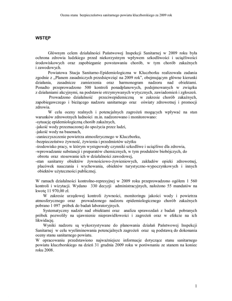 Ocena stanu bezpieczeństwa sanitarnego powiatu kluczborskiego za 2009 rok WSTĘP Głównym celem działalności Państwowej Inspekcji Sanitarnej w 2009 roku była ochrona zdrowia ludzkiego przed niekorzystnym wpływem szkodliwości i uciążliwości środowiskowych oraz zapobieganie powstawaniu chorób, w tym chorób zakaźnych i zawodowych. Powiatowa Stacja Sanitarno-Epidemiologiczna w Kluczborku realizowała zadania zgodnie z „Planem zasadniczych przedsięwzięć na 2009 rok”, obejmującym główne kierunki działania, zasadnicze zamierzenia oraz harmonogram nadzoru nad obiektami. Ponadto przeprowadzono 500 kontroli ponadplanowych, podejmowanych w związku z działaniami akcyjnymi, na podstawie otrzymywanych wytycznych, zawiadomień i zgłoszeń. Prowadzono działalność przeciwepidemiczną w zakresie chorób zakaźnych, zapobiegawczego i bieżącego nadzoru sanitarnego oraz oświaty zdrowotnej i promocji zdrowia. W celu oceny realnych i potencjalnych zagrożeń mogących wpływać na stan warunków zdrowotnych ludności m.in. nadzorowano i monitorowano: -sytuację epidemiologiczną chorób zakaźnych, -jakość wody przeznaczonej do spożycia przez ludzi, -jakość wody na basenach, -zanieczyszczenie powietrza atmosferycznego w Kluczborku, -bezpieczeństwo żywność, żywienia i przedmiotów użytku -środowisko pracy, w którym występowały czynniki szkodliwe i uciążliwe dla zdrowia, -wprowadzanie substancji i preparatów chemicznych, w tym produktów biobójczych, do obrotu oraz stosowanie ich w działalności zawodowej, -stan sanitarny obiektów żywnościowo-żywieniowych, zakładów opieki zdrowotnej, placówek nauczania i wychowania, obiektów turystyczno-wypoczynkowych i innych obiektów użyteczności publicznej. W ramach działalności kontrolno-represyjnej w 2009 roku przeprowadzono ogółem 1 560 kontroli i wizytacji. Wydano 330 decyzji administracyjnych, nałożono 55 mandatów na kwotę 11 970,00 zł. W zakresie urzędowej kontroli żywności, monitoringu jakości wody i powietrza atmosferycznego oraz prowadzonego nadzoru epidemiologicznego chorób zakaźnych pobrano 1 097 próbek do badań laboratoryjnych. Systematyczny nadzór nad obiektami oraz analiza sprawozdań z badań pobranych próbek pozwoliły na ujawnienie nieprawidłowości i zagrożeń oraz w efekcie na ich likwidację. Wyniki nadzoru są wykorzystywane do planowania działań Państwowej Inspekcji Sanitarnej w celu wyeliminowania potencjalnych zagrożeń oraz są podstawą do dokonania oceny stanu sanitarnego powiatu. W opracowaniu przedstawiono najważniejsze informacje dotyczące stanu sanitarnego powiatu kluczborskiego na dzień 31 grudnia 2009 roku w porównaniu ze stanem na koniec roku 2008. 1 Ocena stanu bezpieczeństwa sanitarnego powiatu kluczborskiego za 2009 rok I. Sytuacja epidemiologiczna w zakresie chorób zakaźnych. W 2009 r. działania związane z zapobieganiem występowania chorób zakaźnych były następstwem bieżącej sytuacji epidemiologicznej chorób zakaźnych i zakażeń w powiecie kluczborskim w kraju oraz na świecie. W ciągu roku przeprowadzono 198 dochodzeń epidemiologicznych w przypadkach podejrzeń lub wystąpień chorób zakaźnych. Dochodzenia przeprowadzane były w tych jednostkach chorobowych, w których wymagane jest: − ustalenie źródła zakażenia, − wykrycie czynnika etiologicznego powodującego zachorowanie, − objęcie nadzorem osób kontaktujących się z chorym lub podejrzanym o zakażenie, − przeprowadzenie dezynfekcji w celu przerwania dróg szerzenia się zakażenia, − ustalenie stanu zdrowia zwierzęcia podejrzanego o zakażenie wścieklizną w celu podjęcia ostatecznej decyzji dotyczącej szczepienia osoby pogryzionej przez to zwierzę, − przeprowadzenie kwalifikacji zachorowań zgodnie z definicjami przypadków chorób zakaźnych dla potrzeb nadzoru epidemiologicznego. Prowadzenie nadzoru epidemiologicznego ma na celu uzyskanie konkretnych korzyści dla zdrowia publicznego. Informacje uzyskane w wyniku nadzoru służą nie tylko czystej wiedzy epidemiologicznej, ale dają rozeznanie, co do rozmiarów konkretnych zagrożeń. W 2009 r. nadzór epidemiologiczny prowadzony był w oparciu o nowe przepisy prawne tj. ustawę z dnia 05 grudnia 2008 r. o zapobieganiu oraz zwalczaniu zakażeń i chorób zakaźnych u ludzi (Dz. U. z 2008 Nr 234, poz. 1570. z późn. zm.). Przepisy „nowej” ustawy nakładają na osoby, które miały styczność z chorymi na inwazyjne zakażenia wywołane m.in. przez Neisseria meningitidis, obowiązek leczenia, poddanie się nadzorowi epidemiologicznemu, badaniu klinicznemu, badaniom diagnostycznym, a także w razie potrzeby, profilaktycznemu stosowaniu leków. Przepisy ustawy stosuje się również do inwazyjnych zakażeń Haemophilus influenza, Streptococcus pneumoniae, Streptococous pyogenes. W 2009 r. nie zarejestrowano przypadków zachorowań na inwazyjne zakażenia, w tym na inwazyjną chorobę meningokokową. W 2008 roku odnotowano 2 zachorowania na inwazyjną chorobę meningokokową, a w 2007 roku 7 zachorowań. Neisseria Meningitidis typ C charakteryzuje się największą zdolnością do epidemicznego szerzenia się i powodowania ognisk zachorowań. Szczepienia przeciw meningokokom typ C należą do grupy zalecanych, czyli nie finansowanych z budżetu Ministra Zdrowia (gdyż wskaźnik zapadalności w Polsce jest niższy niż w wielu krajach Europy i nie spełnione są kryteria WHO do wprowadzenia ich, jako powszechnych szczepień ochronnych). W powiecie kluczborskim w 2009 r. w dalszym ciągu kontynuowano z inicjatywy samorządów lokalnych akcję szczepień ochronnych przeciwko Neisseria meningitidis grupy C rozpoczętą w 2007 r. Od początku tej akcji zaszczepiono 8480 osób z roczników od 1991 do 2003. Dodatkowo w ramach obowiązkowych szczepień ochronnych wprowadzonych w związku z wystąpieniem ogniska zachorowań w naszym powiecie w 2007 roku zaszczepiono 3138 osób z roczników: 1988,1989,199