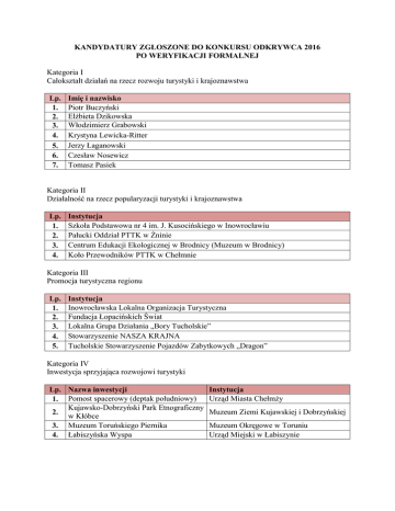 KANDYDATURY ZGŁOSZONE DO KONKURSU ODKRYWCA 2016 PO WERYFIKACJI FORMALNEJ Kategoria I Całokształt działań na rzecz rozwoju turystyki i krajoznawstwa Lp. 1. 2. 3. 4. 5. 6. 7. Imię i nazwisko Piotr Buczyński Elżbieta Dzikowska Włodzimierz Grabowski Krystyna Lewicka-Ritter Jerzy Łaganowski Czesław Nosewicz Tomasz Pasiek Kategoria II Działalność na rzecz popularyzacji turystyki i krajoznawstwa Lp. 1. 2. 3. 4. Instytucja Szkoła Podstawowa nr 4 im. J. Kusocińskiego w Inowrocławiu Pałucki Oddział PTTK w Żninie Centrum Edukacji Ekologicznej w Brodnicy (Muzeum w Brodnicy) Koło Przewodników PTTK w Chełmnie Kategoria III Promocja turystyczna regionu Lp. 1. 2. 3. 4. 5. Instytucja Inowrocławska Lokalna Organizacja Turystyczna Fundacja Łopacińskich Świat Lokalna Grupa Działania „Bory Tucholskie” Stowarzyszenie NASZA KRAJNA Tucholskie Stowarzyszenie Pojazdów Zabytkowych „Dragon” Kategoria IV Inwestycja sprzyjająca rozwojowi turystyki Lp. Nazwa inwestycji 1. Pomost spacerowy (deptak południowy) Kujawsko-Dobrzyński Park Etnograficzny 2. w Kłóbce 3. Muzeum Toruńskiego Piernika 4. Łabiszyńska Wyspa Instytucja Urząd Miasta Chełmży Muzeum Ziemi Kujawskiej i Dobrzyńskiej Muzeum Okręgowe w Toruniu Urząd Miejski w Łabiszynie Kategoria V Przedsięwzięcie biznesowe Lp. Nazwa przedsięwzięcia 1. Żywe Muzeum Piernika 2. Muzeum Ściśle Tajne Podmiot TO-TUR Toruńska Turystyka Daria Kieraszewicz, Wojciech Zdunek Międzynarodowe Centrum Spotkań Młodzieży Hotel Restauracja Vabank Gospodarstwo Agroturystyczne Sienkiewiczówka Wieś tematyczna "Górnicza Wioska" w Borach Tucholskich Toruńska Infrastruktura Sportowa sp. z o.o. PAK Karbowscy sp. j APT Violetta Sienkiewicz 8. Targi "Travel and Taste - Podróże, Kulinaria, Wino" Pole golfowe w Olszewce 9. Nadwiślańska Chata w Luszkowie Bydgoska Lokalna Organizacja Turystyczna Gospodarstwo Agroturystyczne Maria i Telesfor Horodeccy Z.B. Brzykcy 3. 4. 5. 6. 7. Stowarzyszenie Mieszkańców i Miłośników Piły nad Brdą BUKO Kategoria VI Wydarzenie turystyczne i promocyjne Lp. Nazwa wydarzenia Rzeka Muzyki 2016 – 3. edycja cyklu 1. koncertów Międzynarodowy Festyn Miłośników 2. Kolei Wąskotorowej 3. Bella Skyway Festival - 8. edycja „Tajemnice zakamarków tucholskiej 4. starówki -nocne zwiedzanie Tucholi” 40 Jubileuszowy Wielki Międzynarodowy 5. Turniej Rycerski 6. Projekt pn. „Przystanek Łojewo” 7. Festiwal „Muzyka w świetle Księżyca” 8. Ogólnopolski Zlot Miłośników Astronomii OZMA w Niedźwiadach 9. Festyn „Przystań w kolorze blue” 10. XX „Spacerki po Chełmnie” Instytucja Miasto Bydgoszcz Muzeum Ziemi Pałuckiej w Żninie Toruńska Agenda Kulturalna Borowiackie Towarzystwo Kultury Oddział PTTK im. Zygmunta Kwiatkowskiego Gmina Inowrocław Pałac Lubostroń Pałucko-Pomorskie Stowarzyszenie Astronomiczno-Ekologiczne „Grupa Lokalna” w Niedźwiadach Powiat Nakielski Koło Przewodników PTTK w Chełmnie