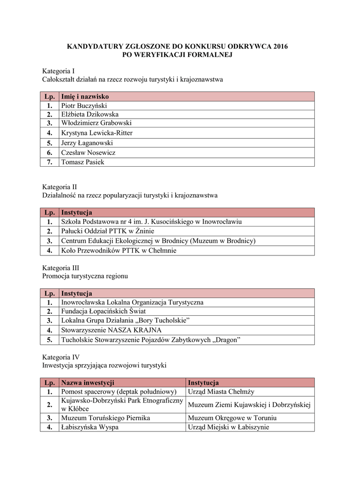 KANDYDATURY ZGŁOSZONE DO KONKURSU ODKRYWCA 2016