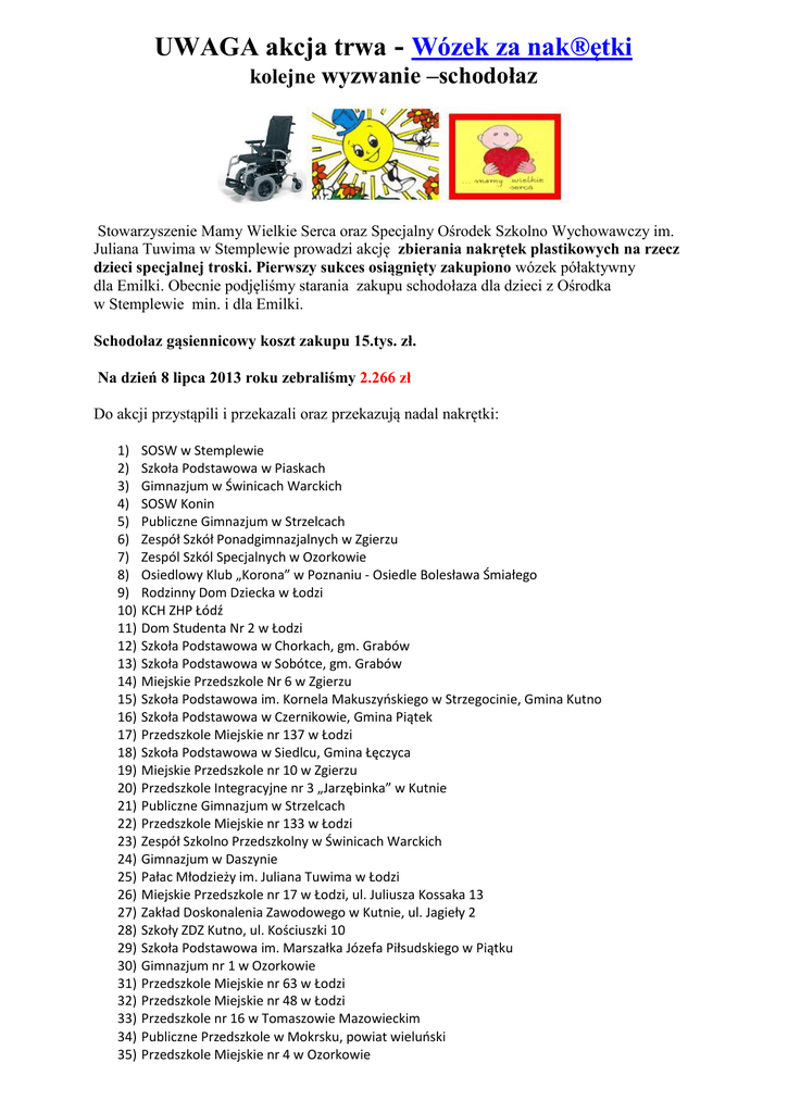 UWAGA akcja trwa - Wózek za nak®ętki kolejne wyzwanie –schodołaz Stowarzyszenie Mamy Wielkie Serca oraz Specjalny Ośrodek Szkolno Wychowawczy im. Juliana Tuwima w Stemplewie prowadzi akcję zbierania nakrętek plastikowych na rzecz dzieci specjalnej troski. Pierwszy sukces osiągnięty zakupiono wózek półaktywny dla Emilki. Obecnie podjęliśmy starania zakupu schodołaza dla dzieci z Ośrodka w Stemplewie min. i dla Emilki. Schodołaz gąsiennicowy koszt zakupu 15.tys. zł. Na dzień 8 lipca 2013 roku zebraliśmy 2.266 zł Do akcji przystąpili i przekazali oraz przekazują nadal nakrętki: 1) 2) 3) 4) 5) 6) 7) 8) 9) 10) 11) 12) 13) 14) 15) 16) 17) 18) 19) 20) 21) 22) 23) 24) 25) 26) 27) 28) 29) 30) 31) 32) 33) 34) 35) SOSW w Stemplewie Szkoła Podstawowa w Piaskach Gimnazjum w Świnicach Warckich SOSW Konin Publiczne Gimnazjum w Strzelcach Zespół Szkół Ponadgimnazjalnych w Zgierzu Zespól Szkól Specjalnych w Ozorkowie Osiedlowy Klub „Korona” w Poznaniu - Osiedle Bolesława Śmiałego Rodzinny Dom Dziecka w Łodzi KCH ZHP Łódź Dom Studenta Nr 2 w Łodzi Szkoła Podstawowa w Chorkach, gm. Grabów Szkoła Podstawowa w Sobótce, gm. Grabów Miejskie Przedszkole Nr 6 w Zgierzu Szkoła Podstawowa im. Kornela Makuszyoskiego w Strzegocinie, Gmina Kutno Szkoła Podstawowa w Czernikowie, Gmina Piątek Przedszkole Miejskie nr 137 w Łodzi Szkoła Podstawowa w Siedlcu, Gmina Łęczyca Miejskie Przedszkole nr 10 w Zgierzu Przedszkole Integracyjne nr 3 „Jarzębinka” w Kutnie Publiczne Gimnazjum w Strzelcach Przedszkole Miejskie nr 133 w Łodzi Zespół Szkolno Przedszkolny w Świnicach Warckich Gimnazjum w Daszynie Pałac Młodzieży im. Juliana Tuwima w Łodzi Miejskie Przedszkole nr 17 w Łodzi, ul. Juliusza Kossaka 13 Zakład Doskonalenia Zawodowego w Kutnie, ul. Jagieły 2 Szkoły ZDZ Kutno, ul. Kościuszki 10 Szkoła Podstawowa im. Marszałka Józefa Piłsudskiego w Piątku Gimnazjum nr 1 w Ozorkowie Przedszkole Miejskie nr 63 w Łodzi Przedszkole Miejskie nr 48 w Łodzi Przedszkole nr 16 w Tomaszowie Mazowieckim Publiczne Przedszkole w Mokrsku, powiat wieluoski Przedszkole Miejskie nr 4 w Ozorkowie 36) 37) 38) 39) 40) 41) 42) 43) 44) 45) 46) 47) 48) 49) 50) 51) 52) 53) 54) 55) 56) Dom Pomocy Społecznej w Łęczycy Szkoła Podstawowa w Wieleninie Przedszkole Miejskie nr 5 "Stokrotka" w Kutnie XVIII Liceum Ogólnokształcące w Łodzi, ul. Perla 11 Przedszkole nr 1 w Łęczycy Starostwo Powiatowe w Łęczycy Przedszkole św. Anny w Łodzi Szkoła Podstawowa nr 13 w Pabianicach Przedszkole w Wartkowicach Publiczna Szkoła Podstawowa w Radoszewicach (powiat pajęczaoski) Publiczna Szkoła Podstawowa w Lipniku (powiat pajęczaoski) Publiczna Szkoła Podstawowa w Siemkowicach (powiat pajęczaoski) Publiczna Szkoła Podstawowa w Ożegowie (powiat pajęczaoski) Przedszkole Miejskie nr 165 w Łodzi, ul. Hufcowa 14 Publiczne Gimnazjum Gminy Sieradz im. Jana Pawła II, ul. Armii Krajowej 5, 98 – 200 Sieradz,, tel. 601 31 45 21 Zespół Śpiewaczy „Świniczanki” z kapelą ludową Zgierski Zespół Szkół Ponadgimnazjalnych im. Jana Pawła II w Zgierzu Zespół Szkół w Leśmierzu Wyższa Szkoła Hotelarstwa i Gastronomii w Poznaniu Budynek FOCUS, ul. Armii Ludowej 26, 00 – 609 Warszawa Świetlica Środowiskowa w Osjakowie Do akcji Nakrętki akces zgłosili i zbierają : 1) 2) 3) 4) 5) 6) 7) 8) 9) 10) 11) 12) 13) 14) Szkoła Podstawowa w Daszynie Poradnia Psychologiczno Pedagogiczna w Aleksandrowie Łódzkim Przedszkole w Pęczniewie Przedszkole w Goszczanowie Kolegium Nauczycielskie w Zgierzu Gimnazjum w Witoni Prywatne Gimnazjum i Liceum Ogólnokształcące „ABIS” w Łodzi, ul. Rzgowska 17 A Szkoła Podstawowa w Spicymierzu Publiczna Szkoła Podstawowa im. Andrzeja Frycza Modrzewskiego w Trzepnicy, powiat piotrkowski Publiczne Przedszkole w Dobroniu, powiat pabianicki Komenda Powiatowa Policji w Łęczycy GOK Świnice Warckie Gminne Przedszkole im. Jana Pawła II w Piątku Zespół Szkół Prywatnych w Opocznie przyłącz się i TY – zapraszamy - akcja ciągle trwa – potrzeby są ogromne Zarobione w ten sposób pieniądze przeznaczymy na zakup schodołaza ,wózków inwalidzkich oraz łóżek rehabilitacyjnych dla dzieci niepełnosprawnych z Ośrodka w Stemplewie. Pierwszy zakup za nami .Emilka ma już wózek. ZBIERAMY – PROSIMY O WSPARCIE Aby kupić jeden wózek wart ok. 4-6 tys. zł, musimy zebrać ok. 6 – 9 ton nakrętek! Prosimy o wsparcie wszystkich, którym los niepełnosprawnych dzieci nie jest obojętny. Nakrętki odbieramy własnym środkiem transportu. Osoby zainteresowane tym rodzajem wsparcia lub innym zbliżającym nas do osiągnięcia celu – prosimy o kontakt tel. 63 2881107 lub 63 288 11 06 lub e mail : [email protected] Akcją kieruje Andrzej Zielonka Serdecznie Dziękujemy i Pozdrawiamy. Zarząd Stowarzyszenia MWS, Dyrekcja SOSW oraz wychowankowie. Stowarzyszenie „Mamy Wielkie Serca” ul. Kościuszki 14 99-140 Świnice Warckie konto: BS Poddębice, O/Uniejów, REGON 472872935, NIP 775-23-36-775 Numer KRS 0000003847 www.serca.org.pl , e mail : [email protected] Nr 51926300002009436020020001