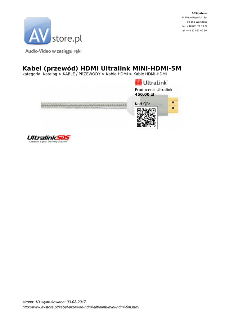 DSSsystems Al. Niepodległości 19/4 02-653 Warszawa tel. +48 881 22 33 22 tel. +48 22 852 00 50 Kabel (przewód) HDMI Ultralink MINI-HDMI-5M kategoria: Katalog > KABLE / PRZEWODY > Kable HDMI > Kable HDMI-HDMI Producent: Ultralink 450,00 zł Kod QR: strona: 1/1 wydrukowano: 03-03-2017 http://www.avstore.pl/kabel-przewod-hdmi-ultralink-mini-hdmi-5m.html