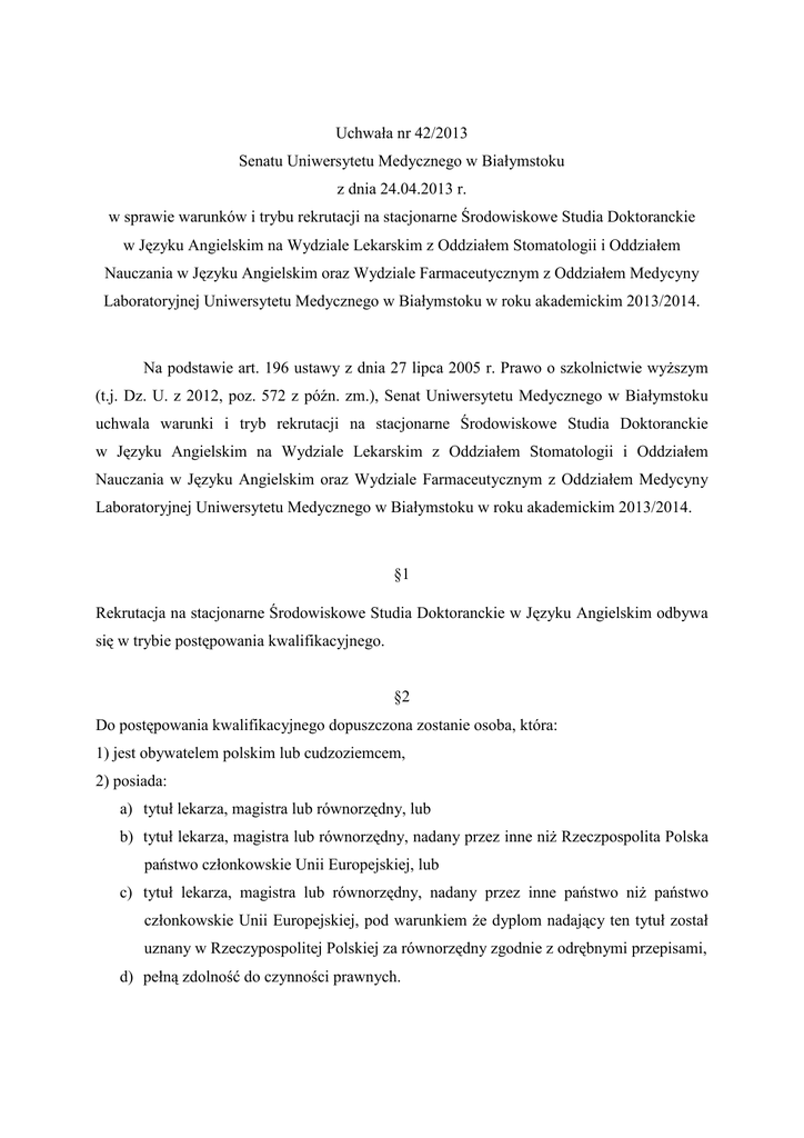 Uchwała nr 42 - Uniwersytet Medyczny w Białymstoku