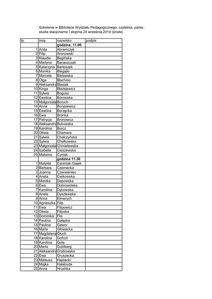 Szkolenie w Bibliotece Wydziału Pedagogicznego, czytelnia, parter, studia stacjonarne I stopnia 24 września 2014 (środa) lp. imię 1 2 3 4 5 6 7 8 9 10 11 12 13 14 15 16 17 18 19 20 21 22 23 24 25 1 2 3 4 5 6 7 8 9 10 11 12 13 14 15 16 17 18 19 20 21 22 23 24 25 nazwisko godzina: 11.00 Anita Abramczyk Filip Aronowski Klaudia Bagińska Martyna Banaszczak Katarzyna Bartoszek Monika Biegajło Marcela Bielawska Olga Błachnio AleksandraBłasiak Kinga Błażejewicz Sylwia Bogusz Ewelina Borowska Małgorzata Boruch Anna Borysiewicz Ewelina Borzęcka Ewa Bronka Patrycja Bronowicz AleksandraBukowska Karolina Burcz Oliwia Chamera Sylwia Chełczyńska Sylwia Chełkowska Małgorzata Chmielewska Izabella Cieszewska Malwina Cyniak godzina 11.30 Matylda Cyraniak-Gajek Barbara Czernecka Joanna Czerwieniec Aneta Ćwikowska Monika Depowska Ewa Dobrowolska Karolina Dybowska Aneta Dyszlewska Anna Elmerych Agnieszka Filip Ewa Filipowicz Oliwia Filipska Dominika Flis Paulina Gałązka Paulina Gawor Maria Głowacka Magdalena Głuch Karolina Gofroń Karolina Gola Marta Goldberg AleksandraGrabowska Ewa Gruszecka Mateusz Hajdacki Majka Hałabuda Anna Hrushka podpis 1 2 3 4 5 6 7 8 9 10 11 12 13 14 15 16 17 18 19 20 21 22 23 24 25 1 2 3 4 5 6 7 8 9 10 11 12 13 14 15 16 17 18 19 20 21 22 23 24 25 1 2 3 godzina: 12.00 Urszula Idec Ina Iliew Karolina Jamrożek Klaudia Joachimkowska Monika Kaczmarek Klaudia Kamińska Katarzyna Kapera Aneta Karolonek Maria Kępka Maria Kiluk Agnieszka Klama Ewelina Kluczyńska Karolina Kobyłka Ewelina Kogut Sandra Kołodziej Kinga Konarska-Jóźwicka Paulina Kotlarska Grzegorz Kowalczuk Patrycja Kowalczyk Magdalena Kowalska Alicja Krajowska-Kukiel Julita Kraśniewska Justyna Krawczyk Urszula Kretkowska Monika Krynicka godzina: 12.30 Katarzyna Krysta Marietta Kryszkiewicz Martyna Krzesicka Klaudia Kubiak Natalia Kucharska Karolina Kucharska Dominika Kulesza Martyna Kurek Justyna Kurowska Sylwia Kuzia Magdalena Kuźnicka Julia Kwiatek Anita Lelewicz Magdalena Lerynowicz Weronika Liedtke Sylwia Łukasik AleksandraŁuniewska Anna Malicka Kinga Mańkowska Kamila Marek Agnieszka Martowska Izabela Marzoch Karolina Mianowska Anna Miazek Agata Michałowska godzina: 13.00 Maria Misiorowska Michał Miś Magdalena Mleczko 4 5 6 7 8 9 10 11 12 13 14 15 16 17 18 19 20 21 22 23 24 25 1 2 3 4 5 6 7 8 9 10 11 12 13 14 15 16 17 18 19 20 21 22 23 24 25 1 2 3 4 5 6 7 Patrycja Mogiełka Julia Mrozińska Emilia Myrcha Louisa Nadolski Katarzyna Nadulska Aneta Nicowska Agnieszka Nieciecka Olena Novoselska Ana Nowak Sylwia Nowakowska Anna Oczkowska AleksandraOknińska Paulina Olkowicz Paulina Oracka Daria Orłowska Anita Ostas Joanna Ozon Ewa Ożarowska Katarzyna Paluch Kinga Parzych Emilia Pawlak Justyna Pielesiak godzina: 13.30 Daria Pieróg Michał Piotrowski Joanna Piwowarska Martyna Plichta Patrycja Pociecha Agata Ponichtera Natalia Prymek Beata Przetacka Martyna Przewłocka Paulina Przyborek Patrycja Radecka Natasza Ratajczak Wanesa Rorat Dagmara Rudowska Magdalena Ruppert Olga Rusak Kinga Rusinowska Patrycja Rutkowska Natalia Rybczyńska Katarzyna Sadowska Robert Sanetra Martyna Seliga Marta Siedlecka Izabela Skowera Marika Skrobek godzina: 14.00 Nina Slobozhanyuk AleksandraSmolińska Katarzyna Sobieraj Eliza Sobieraj AleksandraSokołowska Julia Stępniewska Dominika Stolarczyk 8 9 10 11 12 13 14 15 16 17 18 19 20 21 22 23 24 25 1 2 3 4 5 6 7 8 9 10 11 12 13 14 15 16 17 18 19 20 21 22 23 24 1 2 3 4 5 6 Patryk Suchocki Pola Sutryk Zuzanna Szczerkowska Wioleta Szczygielska Małgorzata Szklarska Dominika Szóstko Paulina Szucka MaksymilianŚmiech Ewa Śmigielska Katarzyna Świś Magdalena Talarska Marika Tarczyńska Dominika Tępczyk Marta Tierentiew Karolina Tobijasz Weronika Tołwińska Dorota Traczyk Magdalena Urbańska godzina: 14.30 Paulina Wasilewska Maja Wasilewska Dorota Wawryło Magdalena Wenckowska Justyna Węglewska Iwona Wielgomas Katarzyna Wiertel Zuzanna Wierzchowska Malwina Wierzchowska Weronika Winnicka Olga Wiszniewska Klaudia Wiśniewska AleksandraWiśniewska Aneta KingaWłodarczyk Klaudia Włodarska Luiza Wnukowska Kamila Wojtanek Małgorzata Wójcicka Elżbieta Wójcik Karolina Zając Malwina Zakrzewska Katarzyna Zakrzewska Kinga Zborowska Agnieszka Zdrodowka godzina: 15.00 Marta Zielińska Edyta Ziółkowska Anna Zwierz Aneta Zych Kornelia Żelazna Kamila Żochowska plus osoby z II tury rekrutacji