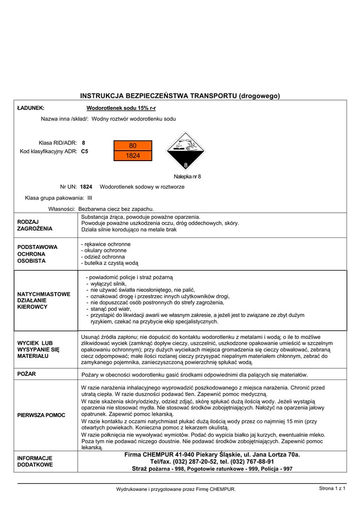 INSTRUKCJA BEZPIECZEŃSTWA TRANSPORTU (drogowego) ŁADUNEK: Wodorotlenek sodu 15% r-r Nazwa inna /skład/: Wodny roztwór wodorotlenku sodu Klasa RID/ADR: 8 Kod klasyfikacyjny ADR: C5 80 1824 Nalepka nr 8 Nr UN: 1824 Wodorotlenek sodowy w roztworze Klasa grupa pakowania: III Własności: Bezbarwna ciecz bez zapachu. Substancja żrąca, powoduje poważne oparzenia. RODZAJ Powoduje poważne uszkodzenia oczu, dróg oddechowych, skóry. ZAGROŻENIA Działa silnie korodująco na metale brak PODSTAWOWA OCHRONA OSOBISTA NATYCHMIASTOWE DZIAŁANIE KIEROWCY - rękawice ochronne okulary ochronne odzież ochronna butelka z czystą wodą - powiadomić policje i straż pożarną - wyłączyć silnik, - nie używać światła nieosłoniętego, nie palić, - oznakować drogę i przestrzec innych użytkowników drogi, - nie dopuszczać osób postronnych do strefy zagrożenia, - stanąć pod wiatr, - przystąpić do likwidacji awarii we własnym zakresie, a jeżeli jest to związane ze zbyt dużym ryzykiem, czekać na przybycie ekip specjalistycznych. WYCIEK LUB WYSYPANIE SIĘ MATERIAŁU Usunąć źródła zapłonu; nie dopuścić do kontaktu wodorotlenku z metalami i wodą; o ile to możliwe zlikwidować wyciek (zamknąć dopływ cieczy, uszczelnić, uszkodzone opakowanie umieścić w szczelnym opakowaniu ochronnym); przy dużych wyciekach miejsca gromadzenia się cieczy obwałować, zebraną ciecz odpompować; małe ilości rozlanej cieczy przysypać niepalnym materiałem chłonnym, zebrać do zamykanego pojemnika, zanieczyszczoną powierzchnię spłukać wodą. POŻAR Pożary w obecności wodorotlenku gasić środkami odpowiednimi dla palących się materiałów. PIERWSZA POMOC W razie narażenia inhalacyjnego wyprowadzić poszkodowanego z miejsca narażenia. Chronić przed utratą ciepła. W razie duszności podawać tlen. Zapewnić pomoc medyczną. W razie skażenia skóry/odzieży, odzież zdjąć, skórę spłukać dużą ilością wody. Jeżeli wystąpią oparzenia nie stosować mydła. Nie stosować środków zobojętniających. Nałożyć na oparzenia jałowy opatrunek. Zapewnić pomoc lekarską. W razie kontaktu z oczami natychmiast płukać dużą ilością wody przez co najmniej 15 min (przy otwartych powiekach. Konieczna pomoc z lekarzem okulistą. W razie połknięcia nie wywoływać wymiotów. Podać do wypicia białko jaj kurzych, ewentualnie mleko. Poza tym nie podawać niczego doustnie. Nie podawać środków zobojętniających. Zapewnić pomoc lekarską. INFORMACJE DODATKOWE Firma CHEMPUR 41-940 Piekary Śląskie, ul. Jana Lortza 70a. Tel/fax. (032) 287-20-52, tel. (032) 767-88-91 Straż pożarna - 998, Pogotowie ratunkowe - 999, Policja - 997 Wydrukowane i przygotowane przez Firmę CHEMPUR. Strona 1 z 1