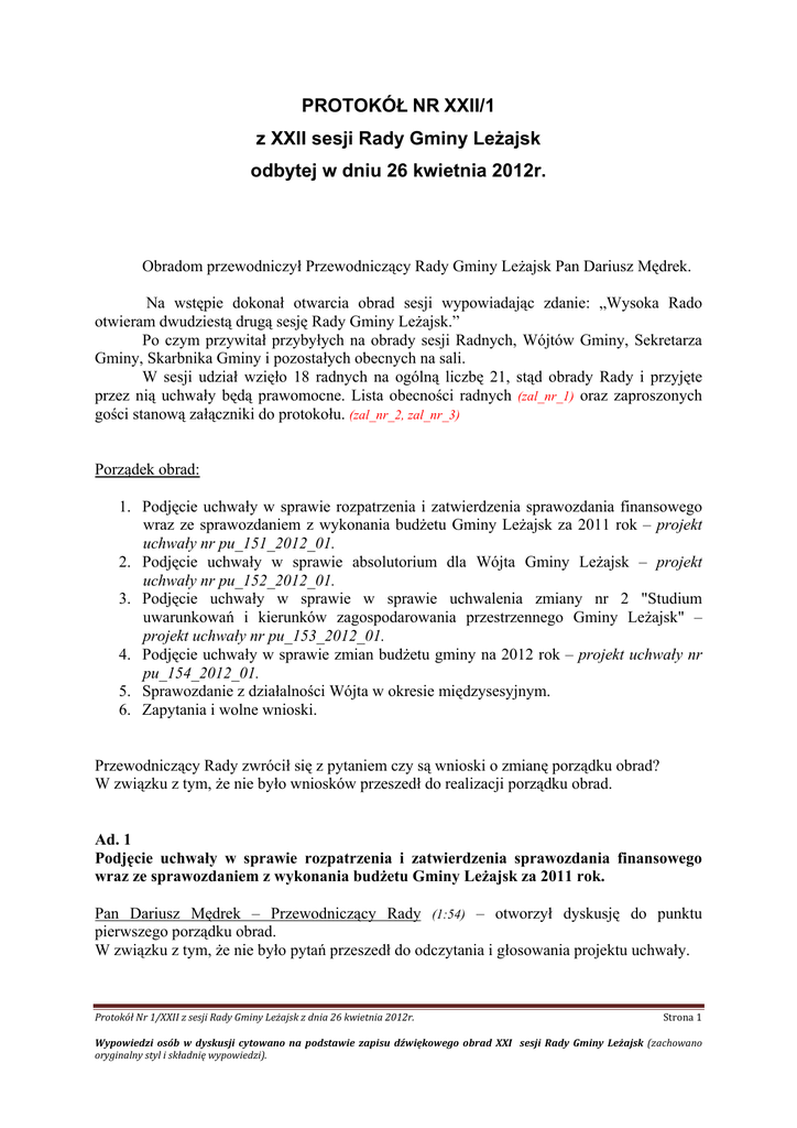 PROTOKÓŁ NR XXII/1 z XXII sesji Rady Gminy Leżajsk odbytej w dniu 26 kwietnia 2012r. Obradom przewodniczył Przewodniczący Rady Gminy Leżajsk Pan Dariusz Mędrek. Na wstępie dokonał otwarcia obrad sesji wypowiadając zdanie: „Wysoka Rado otwieram dwudziestą drugą sesję Rady Gminy Leżajsk.” Po czym przywitał przybyłych na obrady sesji Radnych, Wójtów Gminy, Sekretarza Gminy, Skarbnika Gminy i pozostałych obecnych na sali. W sesji udział wzięło 18 radnych na ogólną liczbę 21, stąd obrady Rady i przyjęte przez nią uchwały będą prawomocne. Lista obecności radnych (zal_nr_1) oraz zaproszonych gości stanową załączniki do protokołu. (zal_nr_2, zal_nr_3) Porządek obrad: 1. Podjęcie uchwały w sprawie rozpatrzenia i zatwierdzenia sprawozdania finansowego wraz ze sprawozdaniem z wykonania budżetu Gminy Leżajsk za 2011 rok – projekt uchwały nr pu_151_2012_01. 2. Podjęcie uchwały w sprawie absolutorium dla Wójta Gminy Leżajsk – projekt uchwały nr pu_152_2012_01. 3. Podjęcie uchwały w sprawie w sprawie uchwalenia zmiany nr 2 "Studium uwarunkowań i kierunków zagospodarowania przestrzennego Gminy Leżajsk" – projekt uchwały nr pu_153_2012_01. 4. Podjęcie uchwały w sprawie zmian budżetu gminy na 2012 rok – projekt uchwały nr pu_154_2012_01. 5. Sprawozdanie z działalności Wójta w okresie międzysesyjnym. 6. Zapytania i wolne wnioski. Przewodniczący Rady zwrócił się z pytaniem czy są wnioski o zmianę porządku obrad? W związku z tym, że nie było wniosków przeszedł do realizacji porządku obrad. Ad. 1 Podjęcie uchwały w sprawie rozpatrzenia i zatwierdzenia sprawozdania finansowego wraz ze sprawozdaniem z wykonania budżetu Gminy Leżajsk za 2011 rok. Pan Dariusz Mędrek – Przewodniczący Rady (1:54) – otworzył dyskusję do punktu pierwszego porządku obrad. W związku z tym, że nie było pytań przeszedł do odczytania i głosowania projektu uchwały. Protokół Nr 1/XXII z sesji Rady Gminy Leżajsk z dnia 26 kwietnia 2012r. Strona 1 Wypowiedzi osób w dyskusji cytowano na podstawie zapisu dźwiękowego obrad XXI sesji Rady Gminy Leżajsk (zachowano oryginalny styl i składnię wypowiedzi). GŁOSOWANIE NR 1 w projektu uchwały nr pu_151_2012_01 W głosowaniu udział wzięło 18 radnych Za uchwałą głosowało 14 Przeciw głosowało 0 Wstrzymał się 4 Uchwała Nr XXII/146/2012 w załączeniu do protokołu. Radna pani Maria Kołodziej spóźniła się na sesję Rady Gminy. O tego momentu w sesji udział brało 19 radnych. Ad. 2 Podjęcie uchwały w sprawie absolutorium Wójtowi Gminy Leżajsk. Przewodniczący przeszedł do realizacji punktu drugiego porządku obrad. 1) Przedstawienie sprawozdania z wykonania budżetu gminy Leżajsk za 2011 rok. Pani Jadwiga Ulman – Skarbnik Gminy (04:40) – wyjaśniła, że dokumenty jakie rozpatruje Rada przy zatwierdzeniu sprawozdania finansowego wraz ze sprawozdaniem z wykonania budżetu Gminy Leżajsk za 2011 rok są takie same jak przy udzieleniu absolutorium Wójtowi. Dodała, że wszystkie wymagane dokumenty dotyczące absolutorium dla Wójta Gminy Leżajsk zostały przekazane w terminie. Następnie omówiła sprawozdanie roczne z wykonania budżetu gminy za 2011r. 2) Przedstawienie sprawozdania finansowego za 2011r. Następnie przedstawiła sprawozdania finansowe za 2011r. tj: Bilans z wykonania budżetu państwa, jednostki i samorządu terytorialnego – Gmina Leżajsk sporządzony na dzień 31 grudnia 2011r.; Bilans jednostki budżetowej i samorządowego zakładu budżetowego sporządzony na 31 grudnia 2011r., Rachunek zysków i strat jednostki (wariant porównawczy) sporządzony na dzień 31 grudnia 2011r.; Zestawienie zmian w funduszu jednostki sporządzone na dzień 31 grudnia 2011r. Pan Józef Stasiowski – radny gminy (31:00) – cyt. „Pani Skarbnik ja mam takie pytanie, ponieważ zaplanowane były dochody majątkowe na kwotę na 2011 rok około 3 milionów 100 parę tysięcy i tutaj ja widzę, że jest wykonanie 8 mln 500 zł, czy dobrze mówię pani Skarbnik? Dochody majątkowe.” Pani Jadwiga Ulman – Skarbnik Gminy (31:26) – cyt. „Dochody majątkowe plan 8 189 457 zł wykonanie 8 551 559,82. Być może patrzy pan na pierwszy plan?” Pan Józef Stasiowski – radny gminy (31:41) – cyt. „Tak, tak, właśnie dlatego pytam. Pierwszy plan, który był przedstawiony to był 3 129 tys.” Protokół Nr 1/XXII z sesji Rady Gminy Leżajsk z dnia 26 kwietnia 2012r. Strona 2 Wypowiedzi osób w dyskusji cytowano na podstawie zapisu dźwiękowego obrad XXI sesji Rady Gminy Leżajsk (zachowano oryginalny styl i składnię wypowiedzi). Pani Jadwiga Ulman – Skarbnik Gminy (31:50) – cyt. „Wszystko to co tutaj Państwu przedstawiłam, to są zarówno dochody jak i wydatki po zmianach dokonanych w ciągu roku, zarówno uchwałami Rady Gminy jak i zarządzeniami Wójta, a w trakcie roku chyba kilkanaście razy zmienialiśmy budżet. Zmienialiśmy budżet z powodów różnych, przede wszystkim otrzymywaliśmy dotacje, były dokonywane podziały rezerw i były przenoszenia wydatków zarówno przez Wójta jak i przez szanowną Radę w ciągu roku. W związku z tym w ciągu roku budżetowego te kilkanaście zmian spowodowało to, że na pierwszy plan, pewnie taki jak pan radny mówi, dokładnie taki 3 129 323 zł plan na 31 grudnia jest 8 mln. Ja w tej chwili nie potrafię panu z pamięci powiedzieć jakie pozycje zostały zwiększone planu, na pewno były to dotacje ale na co dokładnie to trzeba by było chwilę czasu.” Pan Józef Stasiowski – radny gminy (33:10) – cyt. „No ale aż 5 mln różnicy pani Skarbnik, czy dobrze rozumiem?” Pani Jadwiga Ulman – Skarbnik Gminy – oczywiście, że tak. Pan Krzysztof Sobejko – Wójt Gminy (33:32) – cyt. „Myślę, że to nie jest nic dziwnego, bo w trakcie roku, tak jak co roku jeżeli pozyskujemy jakieś środki zwiększają się nam dochody, to że zaplanowaliśmy 3, a wykonaliśmy więcej, no to tylko chwa