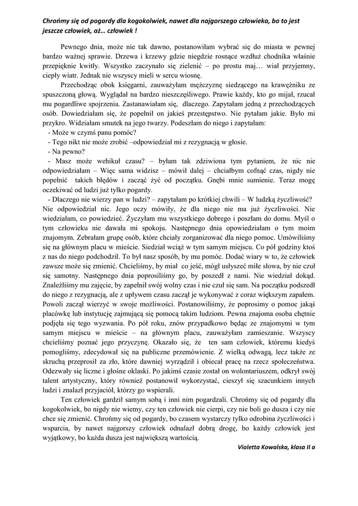 Chroomy się od pogardy dla kogokolwiek, nawet dla najgorszego człowieka, bo to jest jeszcze człowiek, aż… człowiek ! Pewnego dnia, może nie tak dawno, postanowiłam wybrać się do miasta w pewnej bardzo ważnej sprawie. Drzewa i krzewy gdzie niegdzie rosnące wzdłuż chodnika właśnie przepięknie kwitły. Wszystko zaczynało się zielenić – po prostu maj… wiał przyjemny, ciepły wiatr. Jednak nie wszyscy mieli w sercu wiosnę. Przechodząc obok księgarni, zauważyłam mężczyznę siedzącego na krawężniku ze spuszczoną głową. Wyglądał na bardzo nieszczęśliwego. Prawie każdy, kto go mijał, rzucał mu pogardliwe spojrzenia. Zastanawiałam się, dlaczego. Zapytałam jedną z przechodzących osób. Dowiedziałam się, że popełnił on jakieś przestępstwo. Nie pytałam jakie. Było mi przykro. Widziałam smutek na jego twarzy. Podeszłam do niego i zapytałam: - Może w czymś panu pomóc? - Tego nikt nie może zrobić –odpowiedział mi z rezygnacją w głosie. - Na pewno? - Masz może wehikuł czasu? – byłam tak zdziwiona tym pytaniem, że nic nie odpowiedziałam – Więc sama widzisz – mówił dalej – chciałbym cofnąć czas, nigdy nie popełnić takich błędów i zacząć żyć od początku. Gnębi mnie sumienie. Teraz mogę oczekiwać od ludzi już tylko pogardy. - Dlaczego nie wierzy pan w ludzi? – zapytałam po krótkiej chwili – W ludzką życzliwość? Nie odpowiedział nic. Jego oczy mówiły, że dla niego nie ma już życzliwości. Nie wiedziałam, co powiedzieć. Życzyłam mu wszystkiego dobrego i poszłam do domu. Myśl o tym człowieku nie dawała mi spokoju. Następnego dnia opowiedziałam o tym moim znajomym. Zebrałam grupę osób, które chciały zorganizować dla niego pomoc. Umówiliśmy się na głównym placu w mieście. Siedział wciąż w tym samym miejscu. Co pół godziny ktoś z nas do niego podchodził. To był nasz sposób, by mu pomóc. Dodać wiary w to, że człowiek zawsze może się zmienić. Chcieliśmy, by miał co jeść, mógł usłyszeć miłe słowa, by nie czuł się samotny. Następnego dnia poprosiliśmy go, by poszedł z nami. Nie wiedział dokąd. Znaleźliśmy mu zajęcie, by zapełnił swój wolny czas i nie czuł się sam. Na początku podszedł do niego z rezygnacją, ale z upływem czasu zaczął je wykonywać z coraz większym zapałem. Powoli zaczął wierzyć w swoje możliwości. Postanowiliśmy, że poprosimy o pomoc jakąś placówkę lub instytucję zajmującą się pomocą takim ludziom. Pewna znajoma osoba chętnie podjęła się tego wyzwania. Po pół roku, znów przypadkowo będąc ze znajomymi w tym samym miejscu w mieście – na głównym placu, zauważyłam zamieszanie. Wszyscy chcieliśmy poznać jego przyczynę. Okazało się, że ten sam człowiek, któremu kiedyś pomogliśmy, zdecydował się na publiczne przemówienie. Z wielką odwagą, lecz także ze skruchą przeprosił za zło, które dawniej wyrządził i obiecał pracę na rzecz społeczeństwa. Odezwały się liczne i głośne oklaski. Po jakimś czasie został on wolontariuszem, odkrył swój talent artystyczny, który również postanowił wykorzystać, cieszył się szacunkiem innych ludzi i znalazł przyjaciół, którzy go wspierali. Ten człowiek gardził samym sobą i inni nim pogardzali. Chrońmy się od pogardy dla kogokolwiek, bo nigdy nie wiemy, czy ten człowiek nie cierpi, czy nie boli go dusza i czy nie chce się zmienić. Chrońmy się od pogardy, bo czasem wystarczy tylko odrobina życzliwości i wsparcia, by nawet najgorszy człowiek odnalazł dobrą drogę, bo każdy człowiek jest wyjątkowy, bo każda dusza jest największą wartością. Violetta Kowalska, klasa II a