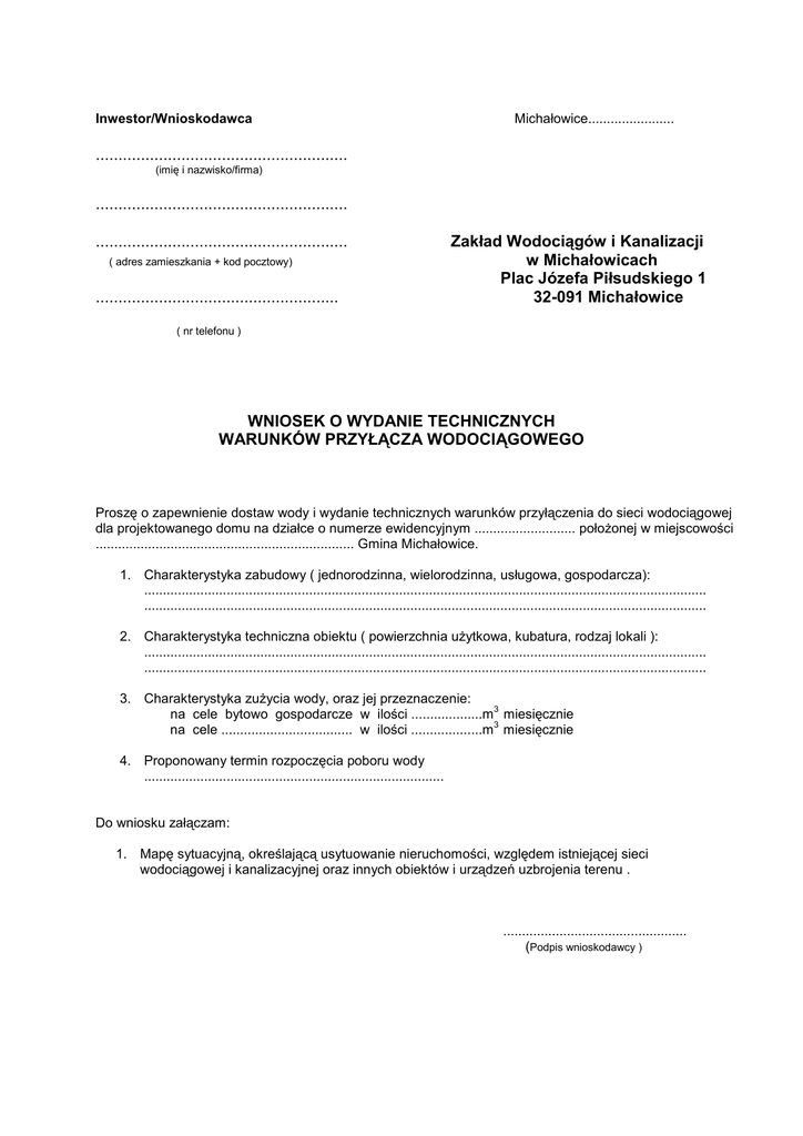Inwestor/Wnioskodawca Michałowice....................... ........................................................ (imię i nazwisko/firma) ........................................................ ........................................................ ( adres zamieszkania + kod pocztowy) ...................................................... Zakład Wodociągów i Kanalizacji w Michałowicach Plac Józefa Piłsudskiego 1 32-091 Michałowice ( nr telefonu ) WNIOSEK O WYDANIE TECHNICZNYCH WARUNKÓW PRZYŁĄCZA WODOCIĄGOWEGO Proszę o zapewnienie dostaw wody i wydanie technicznych warunków przyłączenia do sieci wodociągowej dla projektowanego domu na działce o numerze ewidencyjnym ........................... położonej w miejscowości ..................................................................... Gmina Michałowice. 1. Charakterystyka zabudowy ( jednorodzinna, wielorodzinna, usługowa, gospodarcza): ...................................................................................................................................................... ...................................................................................................................................................... 2. Charakterystyka techniczna obiektu ( powierzchnia użytkowa, kubatura, rodzaj lokali ): ...................................................................................................................................................... ...................................................................................................................................................... 3. Charakterystyka zużycia wody, oraz jej przeznaczenie: 3 na cele bytowo gospodarcze w ilości ...................m miesięcznie 3 na cele ................................... w ilości ...................m miesięcznie 4. Proponowany termin rozpoczęcia poboru wody ................................................................................ Do wniosku załączam: 1. Mapę sytuacyjną, określającą usytuowanie nieruchomości, względem istniejącej sieci wodociągowej i kanalizacyjnej oraz innych obiektów i urządzeń uzbrojenia terenu . ................................................. (Podpis wnioskodawcy ) Zakład Wodociągów i Kanalizacji w Michałowicach Plac Józefa Piłsudskiego 1 Załącznik nr 1 do Warunków technicznych przyłączy wodociągowo – kanalizacyjnych 32-091 Michałowice tel. 388-87-71 SPIS ZAWARTOŚCI DOKUMENTACJI PROJEKTOWEJ PRZYŁĄCZY WOD. – KAN. Dokumentacja projektowa przyłącza wodociągowego i kanalizacyjnego dla nieruchomości, opracowana na zlecenie właściciela nieruchomości powinna zawierać w szczególności: 1. Opis techniczny łącznie z: • bilansem wody i ścieków, • określeniem wymaganego ciśnienia wody, • w przypadku obiektów przemysłowych lub usługowych określeniem gospodarki ściekowej (jakość ścieków, urządzenie podczyszczające). 2. Plan zagospodarowania działki lub terenu, sporządzony na kopii aktualnej mapy zasadniczej w skali 1:500. 3. Rzut poziomy najniższej kondygnacji w skali 1:100 (1:50) z przedstawieniem projektowanych połączeń wodociągowo – kanalizacyjnych w nawiązaniu do istniejących wiejskich sieci wodociągowo – kanalizacyjnych i granicy działki z lokalizacją wodomierza i poziomem kanalizacyjnym. 4. Profil podłużny połączenia wodociągowego i kanalizacyjnego w skali 1:100/500 z rozwinięciem poziomu kanalizacyjnego w nawiązaniu do rzędnej najniższej kondygnacji i zainstalowanych urządzeń sanitarnych na tej kondygnacji. 5. Węzeł wyłączeniowy do sieci wodociągowej i kanalizacyjnej. 6. Rysunek szczegółowy węzła wodomierzowego (w budynku lub w studzience wodomierzowej). 7. Rysunek szczegółowy studzienki kanalizacyjnej. UWAGA: • W przypadku doprowadzenia wody z ujęcia lokalnego (własnego) lub lokalnego odprowadzenia ścieków (do dołu szczelnego) , opracowanie projektowe powinno zawierać informacje lub ogólny schemat zastosowanego rozwiązania. • W przypadkach koniecznych wymagających rozpoznania stanu prawno - własnościowego należy do dokumentacji projektowej dołączyć mapę ewidencji gruntów z wypisem z rejestru. Inwestor/Wnioskodawca Michałowice ....................... ........................................................ (imię i nazwisko/firma) ........................................................ ........................................................ ( adres zamieszkania + kod pocztowy) ....................................................... ( nr telefonu ) Zakład Wodociągów i Kanalizacji w Michałowicach Plac Józefa Piłsudskiego 1 32-091 Michałowice WNIOSEK O PRZYŁĄCZENIE DO GMINNEJ SIECI WODOCIĄGOWEJ Proszę o wyrażenie zgody na wykonanie przyłącza wodociągowego w miejscowości ............................ gmina Michałowice do nieruchomości na działce nr ................. budynek nr ............................................ 3 przeznaczenie wody: na cele bytowo gospodarcze w ilości ............. m miesięcznie 3 na cele ................................ w ilości ............. m miesięcznie. Wykonawcą robót będzie .......................................................................................................................... ................................................................................................................................................................... Roboty wykonane zostaną w terminie ...................................................................................................... wg dokumentacji projektowej zatwierdzonej przez ZWiK w Michałowicach. Do wniosku załączam: • • • • • Kserokopię decyzji – pozwolenia na budowę z klauzulą ostateczności decyzji, Dokument stwierdzający tytuł prawny lub oświadczenie o prawie do korzystania z nieruchomości, której dotyczy wniosek Kserokopię uprawnień zawodowych wykonawcy, Kserokopię planu realizacyjnego zatwier