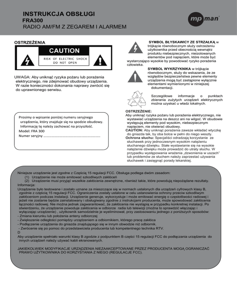 INSTRUKCJA OBSŁUGI FRA300 RADIO AM/FM Z ZEGAREM I ALARMEM OSTRZEśENIA UWAGA: Aby uniknąć ryzyka poŜaru lub poraŜenia elektrycznego, nie zdejmować obudowy urządzenia. W razie konieczności dokonania naprawy zwrócić się do uprawnionego serwisu. SYMBOL BŁYSKAWICY ZE STRZAŁKĄ w trójkącie równobocznym słuŜy ostrzeŜeniu uŜytkownika przed obecnością wewnątrz produktu niebezpiecznych, nieizolowanych elementów pod napięciem, które moŜe być wystarczająco wysokie by powodować ryzyko poraŜenia człowieka. SYMBOL WYKRZYKNIKA w trójkącie równobocznym, słuŜy do wskazania, Ŝe ze względów bezpieczeństwa pewne elementy urządzenia mogą być zastąpione wyłącznie elementami wymienionymi w niniejszej dokumentacji. Szczegółowe informacje o punktach zbierania zuŜytych urządzeń elektrycznych moŜna uzyskać u władz lokalnych. Prosimy o wpisanie poniżej numeru seryjnego urządzenia, który znajduje się na spodzie obudowy. Informację tę należy zachować na przyszłość. Model: FRA 300 Numer seryjny …………………………………………………….. OSTRZEśENIE: Aby uniknąć ryzyka poŜaru lub poraŜenia elektrycznego, nie wystawiać urządzenia na deszcz ani na wilgoć. W obudowie występują elementy pod wysokim, niebezpiecznym napięciem, nie otwierać obudowy. CAUTION: Aby uniknąć poraŜenia zawsze wkładać wtyczkę do gniazda tak, by oba bolce w pełni do niego weszły. Ochrona słuchu: Specjaliści odradzają korzystanie ze słuchawek przy jednoczesnym wysokim natęŜeniu słuchanego dźwięku. Stałe wystawianie się na wysokie natęŜenie dźwięku moŜe prowadzić do utraty słuchu. W przypadku występowania wraŜenia „dzwonienia w uszach” lub problemów ze słuchem naleŜy zaprzestać uŜywania słuchawek i zasięgnąć porady lekarskiej. Niniejsze urządzenie jest zgodne z Częścią 15 regulacji FCC. Obsługa podlega dwóm zasadom: (1) Urządzenie nie moŜe emitować szkodliwych zakłóceń (2) Urządzenie musi przyjąć wszelkie zakłócenia zewnętrzne, równieŜ takie, które powodują niepoŜądane rezultaty. Informacja: Urządzenie było testowane i zostało uznane za mieszczące się w normach ustalonych dla urządzeń cyfrowych klasy B, zgodnie z częścią 15 regulacji FCC. Ograniczenia zostały ustalone w celu ustanowienia ochrony przeciw szkodliwym zakłóceniom podczas instalacji. Urządzenie generuje, wykorzystuje i moŜe emitować energię o częstotliwości radiowej i jeŜeli nie zostanie będzie zainstalowany i obsługiwany zgodnie z instrukcjami producenta, moŜe spowodować zakłócenia łączności radiowej. Nie moŜna jednak zagwarantować, Ŝe zakłócenia nie wystąpią w przypadku konkretnej instalacji. Po stwierdzeniu, Ŝe urządzenie powoduje zakłócenia w odbiorze radia lub telewizji (moŜna to sprawdzić włączając i wyłączając urządzenie) , uŜytkownik samodzielnie je wyeliminował, przy zastosowaniu jednego z poniŜszych sposobów: - Zmiana kierunku lub połoŜenia anteny odbiorczej - Zwiększenie odległości pomiędzy urządzeniem a odbiornikiem, którego pracę zakłóca - Podłączenie urządzenia do gniazda znajdującego się w innym obwodzie niŜ odbiornik. - Zwrócenie się po pomoc do przedstawiciela producenta lub kompetentnego technika RTV. D Aby urządzenie spełniało warunki klasy B zgodzie z podpunktem B części 15 regulacji FCC do podłączania urządzenia do innych urządzeń naleŜy uŜywać kabli ekranowanych. JAKIEKOLWIEK MODYFIKACJE URZĄDZENIA NIEZAAKCEPTOWANE PRZEZ PRODUCENTA MOGĄ OGRANICZAĆ PRAWO UśYTKOWNIKA DO KORZYSTANIA Z NIEGO (REGULACJE FCC). WAśNE WSKAZÓWKI BEZPIECZEŃSTWA 13. 1. 2. 3. 4. 5. 6. 7. 8. 9. Przeczytać instrukcje. Przed rozpoczęciem korzystania z urządzenia naleŜy przeczytać wszystkie instrukcje dotyczące bezpieczeństwa i uŜytkowania. Zachować instrukcje, mogą się przydać w przyszłości. Zwrócić uwagę na ostrzeŜenia. Stosować się do wszystkich ostrzeŜeń umieszczonych zarówno na urządzeniu jak i w niniejszych instrukcjach. Ściśle przestrzegać wszystkich instrukcji. Czyszczenie. Przed czyszczeniem odłączyć urządzenie od zasilania. Nie uŜywać środków czyszczących w płynie ani w aerozolu. Czyścić lekko wilgotną ściereczką. Części dodatkowe. Nie uŜywać części i akcesoriów nie zalecanych przez producenta, mogą bowiem stwarzać ryzyko. Woda i wilgoć. Urządzenie nie moŜe być uŜywane w pobliŜu wody, na przykład niedaleko prysznica, umywalki, zlewu kuchennego, mokrego prania a takŜe na basenie czy w wilgotnej piwnicy. Akcesoria montaŜowe i sprzęt dodatkowy. Nie umieszczać urządzenia na chwiejnych wózkach, stojakach, trójnogach, wspornikach czy stolikach. Urządzenie moŜe upaść, powaŜnie się uszkadzając i stwarzając ryzyko urazów u dzieci oraz dorosłych. Korzystać tylko z typów wózków, uchwytów i podstaw zalecanych przez producenta i przestrzegać instrukcji producenta kwestii takich akcesoriów. PrzewoŜenie na wózkach. Produkt powinien być przewoŜony na wózku z naleŜytą ostroŜnością. Ostre hamowanie, nadmierne uŜycie siły lub nierówna powierzchnia mogą być przyczyną wywrócenia się wózka i uszkodzenia urządzenia. 10. Wentylacja. Szczeliny i otwory w urządzeniu słuŜą prawidłowej wentylacji, która pozwala na prawidłowe funkcjonowanie sprzętu i zabezpiecza przed przegrzaniem. Urządzenie powinno być ustawione tak, Ŝeby nie było Ŝadnych przeszkód dla prawidłowej jego wentylacji. Nie stawiać na łóŜku, sofie, dywanie lub innych miękkich powierzchniach, które mogą zablokować otwory wentylacyjne ani nie umieszczać w zabudowanych meblach typu meblościanka lub szafka, chyba Ŝe zapewni mu się prawidłową wentylację albo teŜ takie umieszczenie nie narusza instrukcji producenta. 11. Źródła zasilania. Urządzenie moŜe być podłączone wyłącznie do sieci o parametrach zaznaczonych na tabliczce znamionowej. W przypadku wątpliwości co do ro