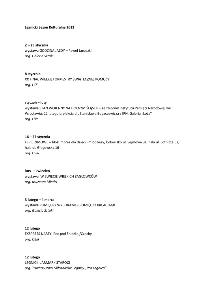 Legnicki Sezon Kulturalny 2012 2 – 29 stycznia wystawa GODZINA JAZDY – Paweł Jarodzki org. Galeria Sztuki 8 stycznia XX FINAŁ WIELKIEJ ORKIESTRY ŚWIĄTECZNEJ POMOCY org. LCK styczeń – luty wystawa STAN WOJENNY NA DOLNYM ŚLĄSKU – ze zbiorów Instytutu Pamięci Narodowej we Wrocławiu; 22 lutego prelekcja dr. Stanisława Bogaczewicza z IPN, Galeria „Loża” org. LBP 16 – 27 stycznia FERIE ZIMOWE – blok imprez dla dzieci i młodzieży, lodowisko ul. Sejmowa 3a, hala ul. Lotnicza 52, hala ul. Głogowska 16 org. OSiR luty – kwiecień wystawa W ŚWIECIE WIELKICH ŻAGLOWCÓW org. Muzeum Miedzi 3 lutego – 4 marca wystawa POMIĘDZY WYBORAMI – POMIĘDZY KREACJAMI org. Galeria Sztuki 12 lutego EKSPRESS NARTY, Pec pod Śnieżką /Czechy org. OSiR 12 lutego LEGNICKI JARMARK STAROCI org. Towarzystwo Miłośników Legnicy „Pro Legnica” 14 lutego BIEG WALENTYNKOWY, ul. Najświętszej Marii Panny org. OSiR 25 lutego MISTRZOSTWA LEGNICY W TENISIE STOŁOWYM, hala ul. Głogowska 16 org. OSiR 11 marca OTWARTE MISTRZOSTWA LEGNICY W SLALOMIE GIGANCIE, Pec pod Śnieżką/ Czechy org. OSiR marzec – kwiecień GRAFIKA – prace sekcji grafiki SDK Atrium, Galeria „Loża” org. LBP 9 marca – 15 kwietnia wystawa MALARSTWO I FOTOGRAFIE – Jan Tarasin org. Galeria sztuki marzec – maj wystawa MIEDZIORYTY KRZYSZTOFA SKÓRCZEWSKIEGO org. Muzeum Miedzi 11 marca LEGNICKI JARMARK STAROCI org. Towarzystwo Miłośników Legnicy „Pro Legnica” 31 marca VOLLEYBALL PALMA – Świąteczny Turniej Siatkówki, hala ul. Lotnicza 52 org. OSiR 6 kwietnia CHLEB, ŚLEDŹ I GROSZ org. Stowarzyszenie „Kobiety Europy” 8 kwietnia LEGNICKI JARMARK STAROCI org. Towarzystwo Miłośników Legnicy „Pro Legnica” kwiecień Międzynarodowy Konkurs Skrzypcowy MŁODY PAGANINI org. Zespół Szkół Muzycznych w Legnicy kwiecień – czerwiec wystawa MEDALE PONTYFIKALNE JANA PAWŁA II Z KOLEKCJI BERNARDA ADAMOWICZA org. Muzeum Miedzi kwiecień – październik LEGNICKIE WIECZORY ORGANOWE org. LCK 14 kwietnia PUCHAR LEGNICY W NORDIC WALKING, Park Miejski org. OSiR 18 kwietnia konkurs czytelniczy SMOK, MOKRADŁA, SMORA… I ŚMIESZNE HISTORIE POMPONA org. LBP 18 – 19 kwietnia spotkania autorskie z Joanną Olech, autorką książek dla dzieci i młodzieży org. LBP 21 kwietnia MITING LEKKOATLETYCZNY, Park Miejski, boiska treningowe org. OSiR 1 – 3 maja LEGNICKA MAJÓWKA z okazji Święta Konstytucji 3 Maja org. LCK 1 maja PIKNIK SIATKARSKI, Park Miejski, boiska treningowe org. OSiR 3 maja RODZINNA MAJÓWKA ROWEROWA, Legnica – Jezierzany org. OSiR 13 maja LEGNICKI JARMARK STAROCI org. Towarzystwo Miłośników Legnicy „Pro Legnica” maj – czerwiec XVII LEGNICKIE SPOTKANIA Z LUDŹMI KSIĄŻKI. Oprócz spotkań autorskich w programie m.in: finał konkursu „Wzorowy Czytelnik” – 13 czerwca org. LBP maj – czerwiec wystawa MIASTA PARTNERSKIE LEGNICY, Galeria „Loża” org. LBP 11 – 12 maja LEGNICKI FESTIWAL SREBRO – wernisaże, ogłoszenie laureatów, wręczenie nagród org. Galeria sztuki wystawy w ramach LFS (4 maja – 30 czerwca): • 21. MIĘDZYNARODOWY KONKURS SZTUKI ZŁOTNICZEJ RYTUAŁ; • SREBRNE SZKOŁY (Hochschule für Kunst und Design Halle, Niemcy i Duncan of Jordanstone College of Art & Design, University of Dundee, Wielka Brytania); • SYLWETKI TWÓRCÓW Herman Hermsen; • SYLWETKI TWÓRCÓW Mari Ishikawa; • SYLWETKI TWÓRCÓW Silke Trekel; • DEBIUTY Dorota Sokołowska i Anna Kanicka; • DIALOGUE COLLECTIVE; • PREZIOSA YOUNG; • SZTUKA DESIGNU. BIŻUTERIA I SZKŁO (Czechy); • AMBERIF DESIGN AWARD; • PREZENTACJE 2011; • HOLOWNIA; • GRANICE SZTUKI GLOBALNEJ – sesja naukowa 18 – 20 maja Ogólnopolski Konkurs Chórów LEGNICA CANTAT org. LCK 18 – 19 maja Ogólnopolski Festiwal Piosenki Ekologicznej EKO-PIOSENKA org. MCK 19 maja NOC MUZEALNA org. Muzeum Miedzi 20 maja ZAWODY LEKKOATLETYCZNE, Park Miejski, boiska treningowe org. OSiR 24 – 26 maja Festiwal Rytmu DRUM BATTLE org. Zespół Szkół Muzycznych w Legnicy 31 maja – 3 czerwca MIĘDZYNARODOWA WYSTAWA SATYRYKON – LEGNICA 2012 – wernisaże, ogłoszenie laureatów, wręczenie nagród imprezy w ramach SATYRYKONU 2012: • POCIAGI STACJE KOLEJOWE 12. Międzynarodowy Konkurs Satyryczny im. „George Van Raemdonck Cartoonal”, Spiżarnia, otwarcie wystawy 31 maja 2012, godz. 20.00 • EDUKACYJNA AKCJA PLASTYCZNA DLA DZIECI - Jacek Frankowski i Edward Lutczyn, 1 czerwca 2012, g. 10.00-14.00 (k/Galerii Satyrykon) • MIĘDZYNARODOWA WYSTAWA SATYRYKON - LEGNICA 2012 oraz wystawa 35 LAT SATYRYKONU, otwarcie wystaw połączone z odsłonięciem tablic poświęconych artystom Janowi Kaczmarkowi i Eugeniuszowi Get-Stankiewiczowi, ul. NMP w Legnicy (przy Filipie), 1 czerwca 2012, godz. 17.00 • wystawa LAUREAT SATYRYKONU 2012, Galeria „Satyrykon” w Legnicy, otwarcie wystawy 1 czerwca 2012, godz. 19.00 • wystawa malarstwa OPPRESSION – MICHEL GRANGER, Muzeum Miedzi w Legnicy, otwarcie wystawy 2 czerwca 2012, godz. 17.00 • wystawa SKŁONNOŚCI DO OSTROŚCI – prace studentów ASP w Gdańsku, Teatr Modrzejewskiej w Legnicy, otwarcie wystawy 2 czerwca 2012, godz.18.00 • PIOSENKI JANA KACZMARKA, dziedziniec Akademii Rycerskiej, 2 czerwiec 2012, godz. 19.00 (koncert biletowany) 1-2.06.2012 – Szkło kontaktowe oraz TVN Meteo org. LCK 8 czerwca – 1 lipca LEGNICKA STREFA KIBICA – transmisja meczów EURO 2012 na telebimie, ul. N.M. Panny przed Galerią Piastów lub podkowa stadionu LEGNICKIE EURO 2012 – Rozgrywki piłki nożnej chłopców, boiska treningowe w Parku Miejskim org. OSiR 10 czerwca LEGNICKI JARMARK STAROCI org. Towarzystwo Miłośników Legnicy „Pro Legnica” 17 czerwca SPŁYW SAMORÓBEK O BŁĘKITNĄ WSTĘGĘ, rzeka i międzywale Kaczawy org. OSiR 2 lipca – 31 sierpnia WAKACJE - blok imprez dla dzieci i młodzieży, baseny, kąpieliska org. OSiR 6 lipca PLAŻÓWKA NOCĄ, Kąpielisko Kormoran org. OSiR 8 lipca LEGNICKI JARMARK STAROCI org. Towarzystwo Miłośników Legnicy 