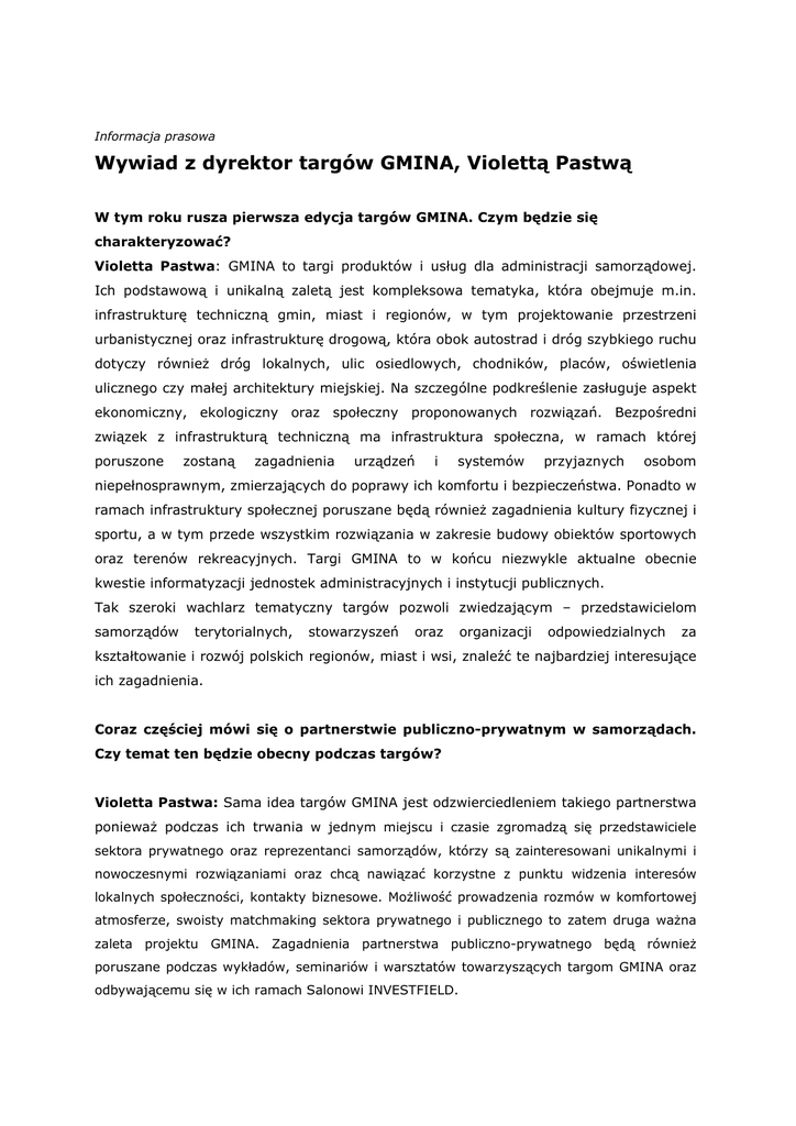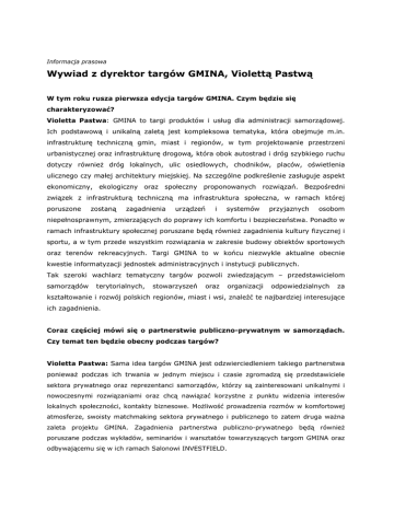 Informacja prasowa Wywiad z dyrektor targów GMINA, Violettą Pastwą W tym roku rusza pierwsza edycja targów GMINA. Czym będzie się charakteryzować? Violetta Pastwa: GMINA to targi produktów i usług dla administracji samorządowej. Ich podstawową i unikalną zaletą jest kompleksowa tematyka, która obejmuje m.in. infrastrukturę techniczną gmin, miast i regionów, w tym projektowanie przestrzeni urbanistycznej oraz infrastrukturę drogową, która obok autostrad i dróg szybkiego ruchu dotyczy równieŜ dróg lokalnych, ulic osiedlowych, chodników, placów, oświetlenia ulicznego czy małej architektury miejskiej. Na szczególne podkreślenie zasługuje aspekt ekonomiczny, ekologiczny oraz społeczny proponowanych rozwiązań. Bezpośredni związek z infrastrukturą techniczną ma infrastruktura społeczna, w ramach której poruszone zostaną zagadnienia urządzeń i systemów przyjaznych osobom niepełnosprawnym, zmierzających do poprawy ich komfortu i bezpieczeństwa. Ponadto w ramach infrastruktury społecznej poruszane będą równieŜ zagadnienia kultury fizycznej i sportu, a w tym przede wszystkim rozwiązania w zakresie budowy obiektów sportowych oraz terenów rekreacyjnych. Targi GMINA to w końcu niezwykle aktualne obecnie kwestie informatyzacji jednostek administracyjnych i instytucji publicznych. Tak szeroki wachlarz tematyczny targów pozwoli zwiedzającym – przedstawicielom samorządów terytorialnych, stowarzyszeń oraz organizacji odpowiedzialnych za kształtowanie i rozwój polskich regionów, miast i wsi, znaleźć te najbardziej interesujące ich zagadnienia. Coraz częściej mówi się o partnerstwie publiczno-prywatnym w samorządach. Czy temat ten będzie obecny podczas targów? Violetta Pastwa: Sama idea targów GMINA jest odzwierciedleniem takiego partnerstwa poniewaŜ podczas ich trwania w jednym miejscu i czasie zgromadzą się przedstawiciele sektora prywatnego oraz reprezentanci samorządów, którzy są zainteresowani unikalnymi i nowoczesnymi rozwiązaniami oraz chcą nawiązać korzystne z punktu widzenia interesów lokalnych społeczności, kontakty biznesowe. MoŜliwość prowadzenia rozmów w komfortowej atmosferze, swoisty matchmaking sektora prywatnego i publicznego to zatem druga waŜna zaleta projektu GMINA. Zagadnienia partnerstwa publiczno-prywatnego będą równieŜ poruszane podczas wykładów, seminariów i warsztatów towarzyszących targom GMINA oraz odbywającemu się w ich ramach Salonowi INVESTFIELD. Jakie wydarzenia towarzyszyć będą targom GMINA? Violetta Pastwa: W ramach targów GMINA zorganizowany zostanie Salon Inwestycji i Nieruchomości INVESTFIELD – wystawa ofert inwestycyjnych miast i regionów, której towarzyszyć będzie program merytoryczny, obejmujący m.in. takie tematy, jak rozwój regionalny, planowanie i projektowanie przestrzeni miejskiej i wiejskiej, rewitalizacja, infrastruktura drogowa i komunikacyjna oraz strefy ekonomiczne i parki przemysłowe. Równolegle z targami GMINA odbywać się będą równieŜ Międzynarodowe Targi Ochrony Środowiska POLEKO oraz Międzynarodowe Targi Techniki Komunalnej KOMTECHNIKA. Na jaką ofertę liczyć mogą wystawcy targów GMINA? Violetta Pastwa: Do dyspozycji wystawców oddajemy komfortowe i nowoczesne powierzchnie ekspozycyjne oraz zaplecze techniczne i pomoc fachowców w zakresie projektowania i zabudowy stoisk, instalacji elektrycznej i wodno-kanalizacyjnej, wyposaŜenia i oprawy graficznej stoiska, sprzętu audio-video oraz nagłośnienia. Naszą wizytówką jest tu z pewnością realizacja grudniowej konferencji klimatycznej COP 14, która została wysoko oceniona zarówno przez organizatorów jak i uczestników. Ponadto dla zgłoszeń nadesłanych do 30 czerwca przygotowaliśmy atrakcyjne promocje cenowe. Wystawcy mogą równieŜ liczyć na naszą pomoc w zakresie rezerwacji miejsc hotelowych. Poza tym w programie targów znajdzie się szereg konferencji, do uczestnictwa w których juŜ dziś zapraszamy. Targi dla Gmin, Miast i Regionów GMINA 2009, 24 – 27 listopada 2009 Organizator: Międzynarodowe Targi Poznańskie Patronat Honorowy: Związek Miast Polskich, Związek Gmin Wiejskich RP, Krajowe Stowarzyszenie Sołtysów Patronat Medialny: Magazyn Infrastruktura, Pismo Samorządu Terytorialnego Wspólnota, Gazeta Samorządu i Administracji, portal budowlany.pl, portal publiczni.pl. Kontakt: Violetta Pastwa, tel. 061 869 2687, e-mail: [email protected]