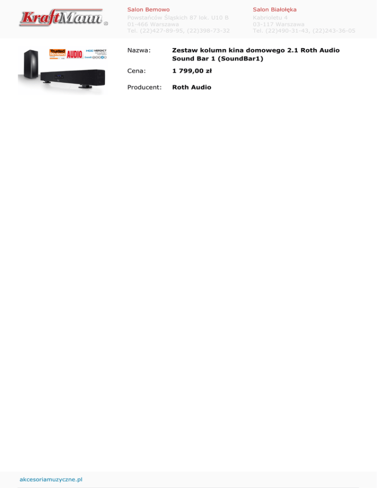 akcesoriamuzyczne.pl Salon Bemowo Salon Białołęka Powstańców Śląskich 87 lok. U10 B 01-466 Warszawa Tel. (22)427-89-95, (22)398-73-32 Kabrioletu 4 03-117 Warszawa Tel. (22)490-31-43, (22)243-36-05 Nazwa: Zestaw kolumn kina domowego 2.1 Roth Audio Sound Bar 1 (SoundBar1) Cena: 1 799,00 zł Producent: Roth Audio