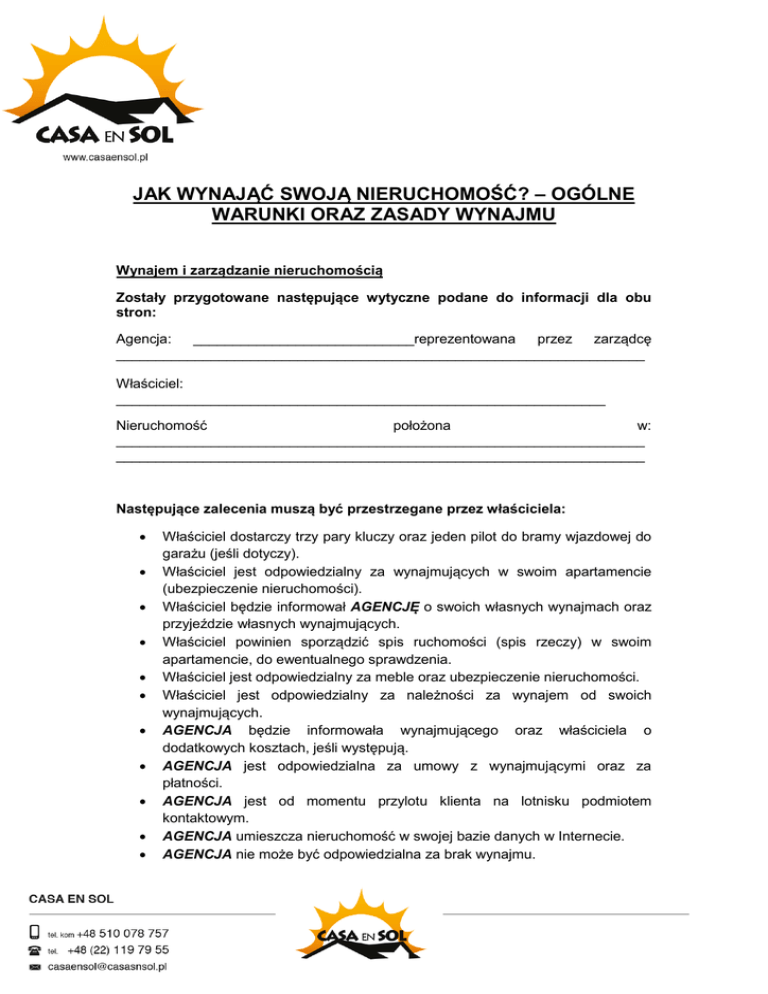 JAK WYNAJĄĆ SWOJĄ NIERUCHOMOŚĆ? – OGÓLNE WARUNKI ORAZ ZASADY WYNAJMU Wynajem i zarządzanie nieruchomością Zostały przygotowane następujące wytyczne podane do informacji dla obu stron: Agencja: ____________________________reprezentowana przez zarządcę ___________________________________________________________________ Właściciel: ______________________________________________________________ Nieruchomość położona w: ___________________________________________________________________ ___________________________________________________________________ Następujące zalecenia muszą być przestrzegane przez właściciela: Właściciel dostarczy trzy pary kluczy oraz jeden pilot do bramy wjazdowej do garażu (jeśli dotyczy). Właściciel jest odpowiedzialny za wynajmujących w swoim apartamencie (ubezpieczenie nieruchomości). Właściciel będzie informował AGENCJĘ o swoich własnych wynajmach oraz przyjeździe własnych wynajmujących. Właściciel powinien sporządzić spis ruchomości (spis rzeczy) w swoim apartamencie, do ewentualnego sprawdzenia. Właściciel jest odpowiedzialny za meble oraz ubezpieczenie nieruchomości. Właściciel jest odpowiedzialny za należności za wynajem od swoich wynajmujących. AGENCJA będzie informowała wynajmującego oraz właściciela o dodatkowych kosztach, jeśli występują. AGENCJA jest odpowiedzialna za umowy z wynajmującymi oraz za płatności. AGENCJA jest od momentu przylotu klienta na lotnisku podmiotem kontaktowym. AGENCJA umieszcza nieruchomość w swojej bazie danych w Internecie. AGENCJA nie może być odpowiedzialna za brak wynajmu. AGENCJA jest odpowiedzialna za oddanie wynajmującym nieruchomości czystej i w dobrym stanie. W przypadku gdy wynajmujący skontaktuje się bezpośrednio z właścicielem powinna być o tym poinformowana AGENCJA. Prowizja za wynajem: Prowizja za wynajem wynosi: 15% wartości wynajmu, z wyłączeniem sprzątania oraz kosztów administracji. Wynajem obejmuje: Sprowadzenie klientów-wynajmujących za pomocą sieci AGENCJA. Pobieranie opłat od wynajmującego i przekazywanie wynagrodzenia właścicielowi. Przedstawienie umowy najmu wynajmującemu. Opłaty administracyjne: Umowa z administratorem zakłada opłatę roczną w wysokości 250 EUR, która zawiera dostarczanie oraz odebranie kluczy, obsługę w nagłych wypadach oraz rozwiązywanie bieżących wątpliwości wynajmującego. Sprzątanie obowiązkowe wynosi między 50-85 EUR do zapłaty przez wynajmującego. Jeśli klient zamawia transport z lotniska, koszt wynosi 40 EUR w każdą stronę. Jeśli klient oczekuje zamówienia samochodu do miejsca wynajmu apartamentu, to będzie on dostarczony mu po koszcie określonym według lokalnych stawek. Administracja zawiera: Odebranie i dostarczenie kluczy wynajmującemu. Przeprowadzenie końcowej kontroli lokalu w celu wykrycia ewentualnych zniszczeń lub braku w wyposażeniu apartamentu. Przyjmowanie skarg od wynajmujących w okresie wynajmu. Dostarczenie podstawowego pakietu powitalnego dla wynajmującego. Dostarczenie wartościowych wskazówek oraz porad odnośnie miejsca pobytu wynajmującego. Pośrednictwo w wynajmie samochodu, jeśli oczekuje tego wynajmujący. Zawiezienie lub odwiezienie na lotnisko, jeśli oczekuje tego wynajmujący. Osobę do kontaktu w nagłych przypadkach dla wynajmującego. Zapewnienie czystości w apartamencie. Jeśli przyjeżdżają wynajmujący od właściciela, właściciel nie jest obciążany kosztami dostarczenia kluczy. Wynajmujący jest odpowiedzialny za płatność za sprzątanie. Komentarze: __________________________________________________________________ Podpisy: ___________________________________________________________________