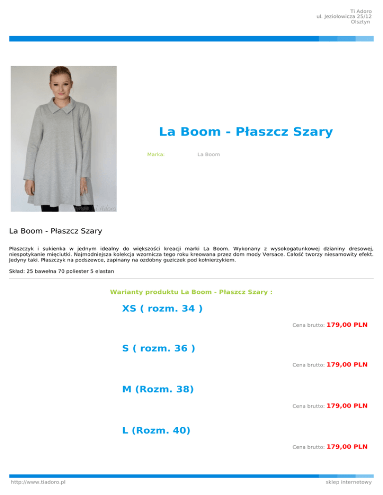 Ti Adoro ul. Jeziołowicza 25/12 Olsztyn La Boom - Płaszcz Szary Marka: La Boom La Boom - Płaszcz Szary Płaszczyk i sukienka w jednym idealny do większości kreacji marki La Boom. Wykonany z wysokogatunkowej dzianiny dresowej, niespotykanie mięciutki. Najmodniejsza kolekcja wzornicza tego roku kreowana przez dom mody Versace. Całość tworzy niesamowity efekt. Jedyny taki. Płaszczyk na podszewce, zapinany na ozdobny guziczek pod kołnierzykiem. Skład: 25 bawełna 70 poliester 5 elastan Warianty produktu La Boom - Płaszcz Szary : XS ( rozm. 34 ) Cena brutto: 179,00 PLN Cena brutto: 179,00 PLN Cena brutto: 179,00 PLN Cena brutto: 179,00 PLN S ( rozm. 36 ) M (Rozm. 38) L (Rozm. 40) http://www.tiadoro.pl sklep internetowy Ti Adoro ul. Jeziołowicza 25/12 Olsztyn XL ( rozm. 42 ) Cena brutto: 179,00 PLN Cena brutto: 179,00 PLN XXL ( rozm. 44) http://www.tiadoro.pl sklep internetowy