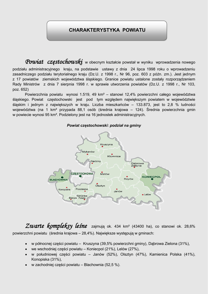 CHARAKTERYSTYKA POWIATU Powiat częstochowski w obecnym kształcie powstał w wyniku wprowadzenia nowego podziału administracyjnego kraju, na podstawie ustawy z dnia 24 lipca 1998 roku o wprowadzeniu zasadniczego podziału terytorialnego kraju (Dz.U. z 1998 r., Nr 96, poz. 603 z późn. zm.). Jest jednym z 17 powiatów ziemskich województwa śląskiego. Granice powiatu ustalone zostały rozporządzeniem Rady Ministrów z dnia 7 sierpnia 1998 r. w sprawie utworzenia powiatów (Dz.U. z 1998 r., Nr 103, poz. 652) Powierzchnia powiatu wynosi 1.519, 49 km² – stanowi 12,4% powierzchni całego województwa śląskiego. Powiat częstochowski jest pod tym względem największym powiatem w województwie śląskim i jednym z największych w kraju. Liczba mieszkańców – 133.873, jest to 2,8 % ludności województwa (na 1 km² przypada 88,1 osób (średnia krajowa – 124). Średnia powierzchnia gmin w powiecie wynosi 95 km². Podzielony jest na 16 jednostek administracyjnych. Powiat częstochowski: podział na gminy Zwarte kompleksy leśne zajmują ok. 434 km² (43400 ha), co stanowi ok. 28,6% powierzchni powiatu (średnia krajowa – 28,4%). Największe występują w gminach: w północnej części powiatu – Kruszyna (39,5% powierzchni gminy), Dąbrowa Zielona (31%), we wschodniej części powiatu – Koniecpol (21%), Lelów (27%), w południowej części powiatu – Janów (52%), Olsztyn (47%), Kamienica Polska (41%), Konopiska (31%), w zachodniej części powiatu – Blachownia (52,5 %). Na obszarach leśnych przewagę stanowi drzewostan iglasty. Głównym gatunkiem lasotwórczym jest sosna, która stanowi 80 % drzewostanu. Przemysł jest słabo rozwinięty, brak jest wielkich zakładów przemysłowych. Nieliczne zakłady działające na terenie powiatu częstochowskiego znajdują się w gminach: 1. Koniecpol -- „Koniecpolskie Zakłady Płyt Pilśniowych S.A.”, Zakłady Remontowo-Montażowe „Koniecpol S.A.” (części do maszyn), Koniecpolskie Zakłady Chemiczne „Inco-Veritas” (opakowania z PCV) 2. Kruszyna -- P.P.H.U. „Ceramika Łęg” (ceramika budowlana), 3. Kłomnice -- Przedsiębiorstwo Farb Przemysłowych "PROCHEM", 4. Mykanów -- Zakład Produkcyjny „Wkręt-Met” (okucia budowlane), 5. Poczesna -- Fabryka Farb, Lakierów i Kleju "STARKO" we Wrzosowej, 6. Rędziny -- Zakłady Chemiczne "Rudniki" SA w Rudnikach, Cementownia „Rudniki” S.A. Na terenach gmin graniczących z miastem Częstochową powstały małe rodzinne podmioty gospodarcze. Dominującym profilem prowadzonej działalności są usługi, głównie cholewkarskie i szewskie oraz produkcja i handel artykułami spożywczymi (pieczywo, ciastka, przetwórstwo , itp.) Pod względem komunikacyjnym powiat częstochowski posiada dogodne połączenia drogowe i kolejowe. Z punktu widzenia sprawności komunikacji lokalnej, duże znaczenie odgrywa komunikacja PKS. Zapewnia ona możliwość dotarcia do wielkich miast śląskich. Natomiast w komunikacji dalszego zasięgu istnieje łączność między innymi: z Łodzią, Wrocławiem, Jędrzejowem, Wisłą, Kłodzkiem i Jastrzębiem Zdrój. Sieć komunikacyjną powiatu stanowią następujące szlaki komunikacyjne: 1. Drogi krajowe (104,4 km.): ■ nr 1 Gdańsk – Cieszyn, ■ nr 46 Kłodzko - Opole – Lubliniec - Częstochowa - Szczekociny, ■ nr 91 Częstochowa – Piotrków Trybunalski; 2. Drogi wojewódzkie (156,2 km.): ■ nr 483 Częstochowa – Brzeźnica – Szczerców – Łask, ■ nr 786 Częstochowa – Koniecpol – Włoszczowa – Kielce, ■ nr 793 Siewierz – Myszków – Janów – Dąbrowa Zielona (Święta Anna); ■ nr 784 Dąbrowa Zielona – Młynek – Radomsko; ■ nr 794 Koniecpol – Lelów – Kraków 3. Drogi powiatowe (578 km.) Powiat częstochowski: sieć dróg krajowych, wojewódzkich i powiatowych Źródło: opracowanie własne na podstawie danych GDDK i PZD Sieć kolejowa na terenie powiatu ma znaczenie uzupełniające ale w przyszłości, może mieć znaczenie rosnące dla przewozów lokalnych, ruchu towarowego i atrakcyjności turystycznej. Przez teren powiatu przebiega ważna linia kolejowa 001 relacji Katowice – Zawiercie – Częstochowa – Koluszki – Skierniewice – Warszawa. Na terenie powiatu linia ta obsługuje stacje i przystanki osobowe: Korwinów, Rudniki, Rzerzęczyce, Kłomnice, Jacków, Widzów / Teklinów. Drugą jest linia kolejowa 146 Częstochowa – Zduńska Wola, która jest częścią trasy biegnącej dalej przez Inowrocław – Bydgoszcz – Laskowice Pomorskie – Tczew — Gdańsk do Gdyni. Na terenie powiatu częstochowskiego linia ta obsługuje stacje i przystanki:, Mykanów, Cykarzew Stary i Cykarzew. Linie regionalne stanowią: linia kolejowa 061 Opole – Blachownia - Częstochowa – Koniecpol – Włoszczowa – Kielce (obsługuje stacje i przystanki osobowe: Kusięta Nowe, Turów, Lusławice, Julianka, Staropole Częstochowskie, Podlesie, Koniecpol Magdasz i Koniecpol), linia kolejowa 064 Koniecpol – Kozłów – Tunel – Kraków. Ponadto przez południowo – wschodni teren gminy Lelów przebiega linia kolejowa CMK. a) priorytet ruchu pasażerskiego: ■ nr 001 Warszawa – Katowice, b) priorytet ruchu towarowego: ■ nr 061 Fosowskie – Kielce, ■ nr 146 Częstochowa – Chorzew Siemkowice, ■ oraz fragment Centralnej Magistrali Kolejowej (gm. Lelów). Powiat częstochowski: sieć linii kolejowych 146 001 061 064 061 001 CMK Źródło: opracowanie własne na podstawie danych spółki Polskie Linie Kolejowe SA Na terenie powiatu, w gminie Rędziny, znajduje się zapasowe lotnisko wojskowe, które może zostać dostosowane do potrzeb lotniczego transportu towarowo – osobowo – czarterowego.