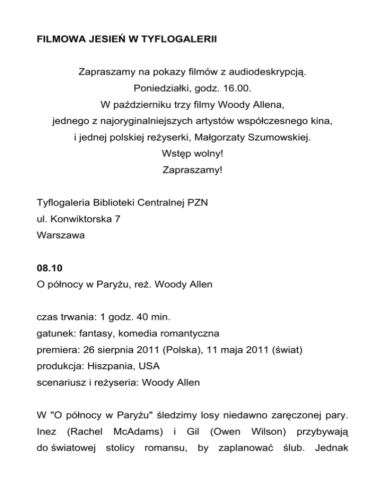 FILMOWA JESIEŃ W TYFLOGALERII Zapraszamy na pokazy filmów z audiodeskrypcją. Poniedziałki, godz. 16.00. W październiku trzy filmy Woody Allena, jednego z najoryginalniejszych artystów współczesnego kina, i jednej polskiej reżyserki, Małgorzaty Szumowskiej. Wstęp wolny! Zapraszamy! Tyflogaleria Biblioteki Centralnej PZN ul. Konwiktorska 7 Warszawa 08.10 O północy w Paryżu, reż. Woody Allen czas trwania: 1 godz. 40 min. gatunek: fantasy, komedia romantyczna premiera: 26 sierpnia 2011 (Polska), 11 maja 2011 (świat) produkcja: Hiszpania, USA scenariusz i reżyseria: Woody Allen W "O północy w Paryżu" śledzimy losy niedawno zaręczonej pary. Inez (Rachel McAdams) i Gil (Owen Wilson) przybywają do światowej stolicy romansu, by zaplanować ślub. Jednak wierność zakochanych zostanie wystawiona na próbę, gdy na ich drodze pojawią się wyrafinowany znawca sztuki Paul (Michael Sheen) oraz tajemnicza i zmysłowa muza Adriana (Marion Cotillard), a po czarujących zakątkach Paryża zacznie oprowadzać ich sama Carla Bruni! W gwiazdorskiej obsadzie magicznej komedii Woody’ego Allena znajdziemy także laureatów Oscara, Adriena Brody'ego oraz Kathy Bates w rolach miłosnych doradców Gila. "O północy w Paryżu" to nie tylko najbardziej chwalony od lat obraz mistrza oraz jeden z pierwszych faworytów do przyszłorocznych Oscarów, ale także największy przebój Allena od 25 lat. Po pokonaniu historycznego wyniku "Vicky Cristina Barcelona", paryska fantazja miłosna reżysera pobije wkrótce kasowe rekordy, ustanowione przez klasyczne, nagrodzone przez Amerykańską Akademię Filmową komedie "Manhattan", "Annie Hall" i "Hannah i jej siostry"! 15.10 Vicky Cristina Barcelona, reż. Woody Allen czas trwania: 1 godz. 36 min. gatunek: komedia obyczajowa premiera: 17 kwietnia 2009 (Polska), 17 maja 2008 (świat) produkcja: Hiszpania, USA scenariusz i reżyseria: Woody Allen Dwie młode Amerykanki, Vicky (Rebecca Hall) i Cristina (Scarlett Johansson) przyjeżdżają inteligentna i czuła, ma na wakacje niedługo do wyjść Barcelony. za mąż; Vicky, otwarta na emocjonalne i seksualne przygody Cristina to jej zupełne przeciwieństwo. Podczas pobytu, obie bohaterki dają się wciągnąć w niekonwencjonalną, romantyczną i seksualną przygodę z Juanem Antonio (Javier Bardem), charyzmatycznym malarzem, uwikłanym w burzliwą i skomplikowaną relację ze swoją byłą żoną, Marią Eleną (Penélope Cruz). Zanurzony w soczystej zmysłowości Barcelony, „Vicky Cristina Barcelona”, to zabawny, inteligentny film, ukazujący miłość we wszystkich jej przejawach. 22.10 Wszystko gra, reż. Woody Allen czas trwania: 2 godz. 4 min. gatunek: dramat, thriller, romans premiera: 7 kwietnia 2006 (Polska), 12 maja 2005 (świat) produkcja: Luksemburg, Wielka Brytania scenariusz i reżyseria: Woody Allen Chris, młody Irlandczyk dostaje pracę w prestiżowym klubie tenisowym w Londynie. Tam poznaje Toma, syna bogatych rodziców, oraz jego siostrę Chloe. Dzięki miłości do opery oraz wrodzonej inteligencji wkrada się w łaski całej rodziny. Kiedy przyjeżdża na weekend do ich wiejskiej posiadłości poznaje narzeczoną Toma – Nolę, amerykankę, która postanowiła przyjechać do Londynu, aby studiować aktorstwo i zrobić karierę…. Pomimo że Chris zaczyna romansować z Chloe, nie może oderwać oczu od Noly. Nawet po ślubie z Chloe…. 29.10 33 sceny z życia, reż. Małgorzata Szumowska czas trwania: 1 godz. 40 min. gatunek: dramat psychologiczny premiera: 7 listopada 2008 (Polska) produkcja: Niemcy, Polska scenariusz i reżyseria: Małgorzata Szumowska "33 sceny z życia" to przejmująca i bardzo osobista opowieść o doświadczeniu, jakim jest śmierć bliskiego członka rodziny. O tym, jaki ma to wpływ na rodzinę, jak dekonstruuje i bezpowrotnie zmienia życie wszystkich osób. Szczególnie Julii (w tej roli niemiecka aktorka Julia Jentsch) - głównej bohaterki filmu, z perspektywy której obserwujemy wydarzenia.